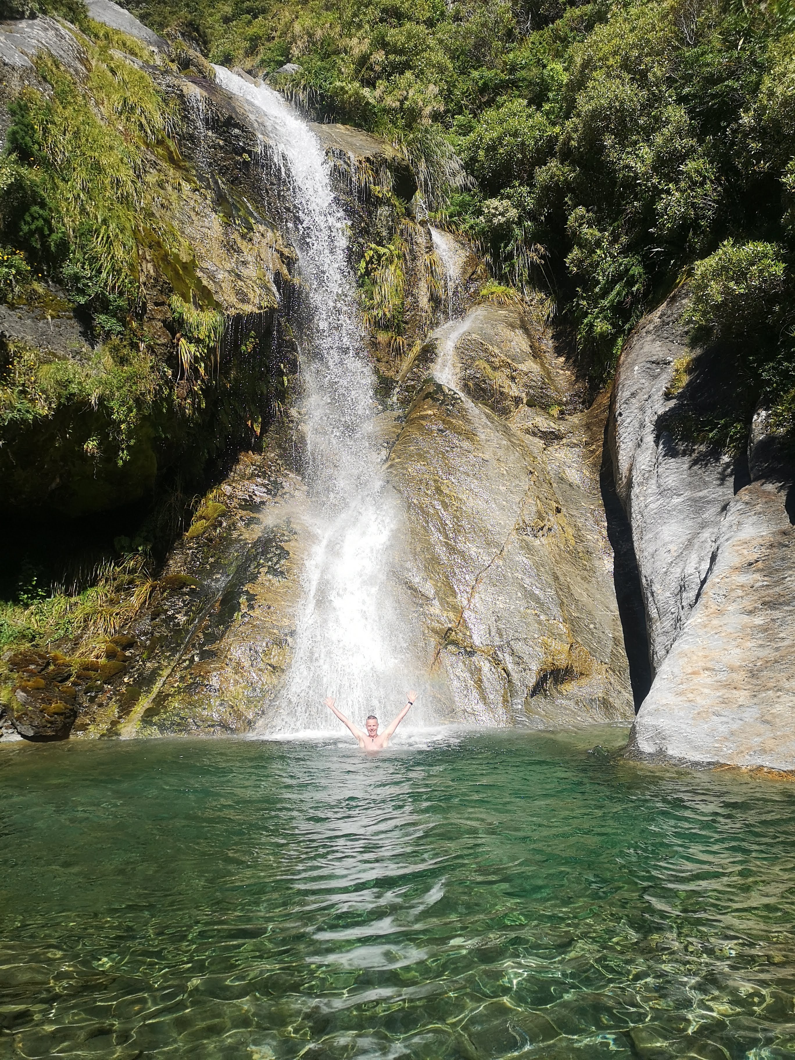 This is magnificent. This doesn’t feel real. How did I get here? A year ago I would never have expected this. Any of it. I’m going up mountains with my pack. I remember struggling up Golden Cap on the South West Coast Path. Going up a 191 meter tall hill was hard. Now I’m struggling up things 8 times as high and then asking what’s next? The journey isn’t anywhere near it’s end. Everyone knows the rules. What goes up must come down. Poles are adjusted, sunscreen is applied. Iain disappears with speed, with confidence. The descent is mostly comfortable but when I hear Iain go “hmmm,” I know I’ve got a tricky section coming up. We meet our first trampers coming the other way half way down. They’re going up in full sun, and will come down the other side in full sun too. The Department of Conservation warnings about water become incredibly clear. Between the Young River down in the basin and the Gillespie stream on the other side, there’s nothing to drink. I’m glad Iain pushed for an early start and we got the grunt work done before the heat kicks in. The Young River begins as a thin strip of silver at the valley head. By the time we reach the valley floor the water is flowing deep, wide and fast. I fill up my water bottle. The river runs away down stream taking the trail along for the ride. We pass beautiful plunge pools and I’m feeling encouraged about my chances for a swim later. We drop in to the cool green of the bush. The river skims along the trail edge, sometimes babbling nearby, then roaring in a gorge far below. We reach Young Hut ahead of our schedule. We have the place to ourselves. I dig out my pan and stove in order to make the coffee I’d missed out on this morning. I prop myself up against the wall and being preparing crackers with cheese, chorizo and olives. “Would you eat of the floor at home?” asks Iain, seeing what I’m up to. “No, I guess I wouldn’t,” I say as I carry on undeterred. He doesn’t hesitate to take one of the offered crackers. Life on the trail is something else. Hygiene standards don’t so much drop as largely disappear altogether. The floor is probably clean enough to eat off, anything else that comes up with the cracker is a bonus. I haven’t been sick yet.