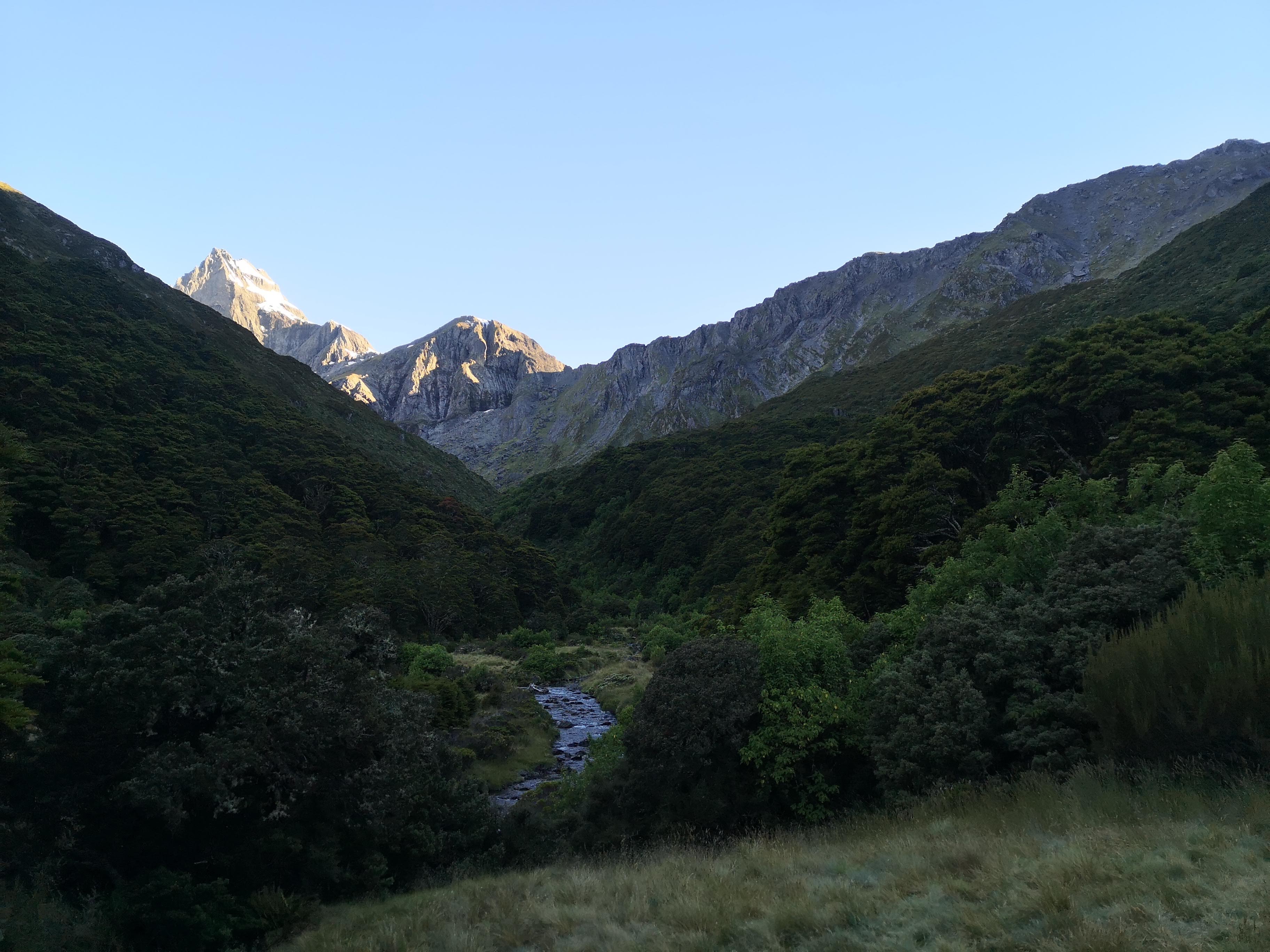 Over the course of lunch we somehow end up on the subject of Lego, of which we are both fans helping to further cement the bonds of friendship. As we set off downhill, I try to eat an apple, lengthen my poles and take a photo all at the same time. I learn quickly this level of multi tasking isn’t something I’m capable of and have to stop to cough up chunks of apple, adjust my poles and put my phone away. “I think things are going to get good around this corner.” Iain tells me as we close in on Siberia Hut. “Are you going to have to put my jaw back together?” I ask. The trees part to reveal the still ridiculous blues of the Siberia Stream, golden meadows reach out to touch the edge of the beech forest. The trees climb up the valley sides. White clouds roll over the snow topped Mount Dreadful in the V of the valley’s end. Wow. Siberia Hut pops out of the trees and we have arrived. After a couple of conversations, a little check on what space we have, we each pick a spot on the tent flattened grass and pitch our homes for the night. A group of youths sit on the hut deck, voices booming across the valley. I can’t complain about the endless use of the outdoor voice seeing as we are outdoors. We do learn further around the corner is a waterfall with a plunge pool perfect for cooling off. I’m keen for a swim, and Iain comes along to get his feet wet if nothing else. Another couple are already in the pool, which if I’m being honest, is amazing. White thunder drops over a rock edge into a deep green cauldron. I strip off and dive in. Cold water might be a cure all. I feel more alive than when we started. Iain, who struggled to get deeper than his ankles on the Rees-Dart slowly, slowly descends into the pool. Then he’s in, swimming out to the waterfall and I am so proud. We come back to the deck for a warming cup of tea, with a couple of ginger nuts for dunking. I ran out of ziplock bags when I was packing and use this opportunity to ask Iain for a massive favour. “Please can you put my teabags in your bag?” He doesn’t look happy about the extra weight. I sit on the deck, listen to stories. Talk to the maybe 11 year old who has more tramping experience than I do. I grill him about his day coming down Gillespie Pass. I’m hopeful that if he’s come down, we’ll be able to go up. Iain and I while away the rest of the evening playing cards before the temperature drops and the mosquitoes start their hunt.