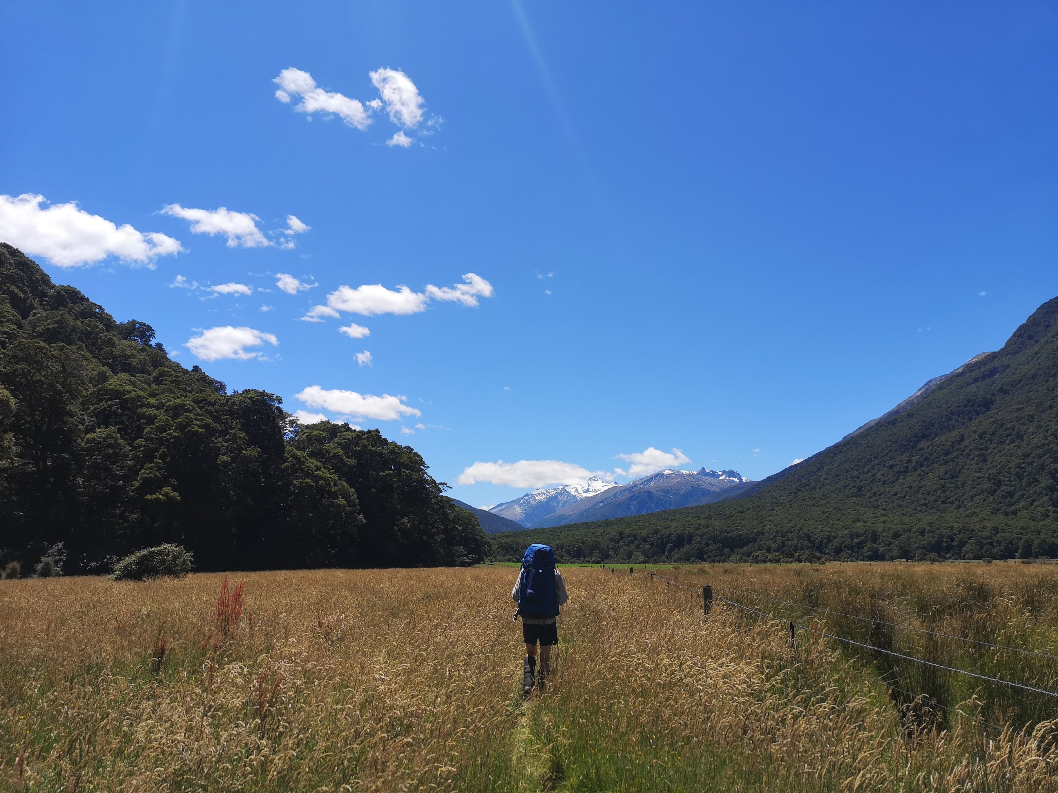 In the morning I awake to what I mistake for rain falling on the tent. Sandflies are bumping between the inner and outer fly. That’s less of a problem than the handful flitting about inside. There’s no escape but to get out and get moving. Not that we do. We’ve got a short day ahead of us and a late pick up. There’s no rush. Eat a few more ginger nuts, drink a second coffee. Anything to reduce the pack weight. A black cloud hangs over the shelter table. My hands are bitten. I swat flies away from my face. We had planned to wait for the sun to dry out the tents but this is getting silly now. The irritation gets too much. The tents can dry later. Back on the river, where plunge pools glow blue and cascades foam white. The forest shines green, golden light dappling through the canopy. We chew through early miles. The rolling track well graded again. Iain and I slip into deep conversation. I pester him about his belief system, accepting things as far as I can before he says something that sounds like nonsense. Fortunately he doesn’t take offence at my facial expressions or tone of voice and keeps answering my bugging questions. We have a divide. Iain maintains nothing exists outside of the mind, I insist only the physical world is real. We have a fair bit of fun stretching ridiculous metaphors to their breaking point. We pass a huge crowd of people moving in towards Young Hut. “How busy was it last night?” they ask. We don’t know, we weren’t there but we saw almost no-one come in. We roll all the way down the Young to the Makarora where the track seems to disappear. Where ever the path once was, it isn’t there now. A landslip, a flood. Something has carried it away. A new route pushes up over the ridge. One final challenge. Up and over roots, sidling across slabs of rock. We turn around and go backwards down one step which doesn’t look anywhere near as big from below. Then we abseil several meters down a chain where finally we’re dumped back on what feels more like a track. The path passes alongside crisp green fields, lined with barbed wire and electric fences. The beech trees on the forest edge sit squat, sending out low branches, doing a solid impression of an old oak tree. The only thing preventing this scene from transporting me back to the English countryside of home are the snow capped mountains in the distance.