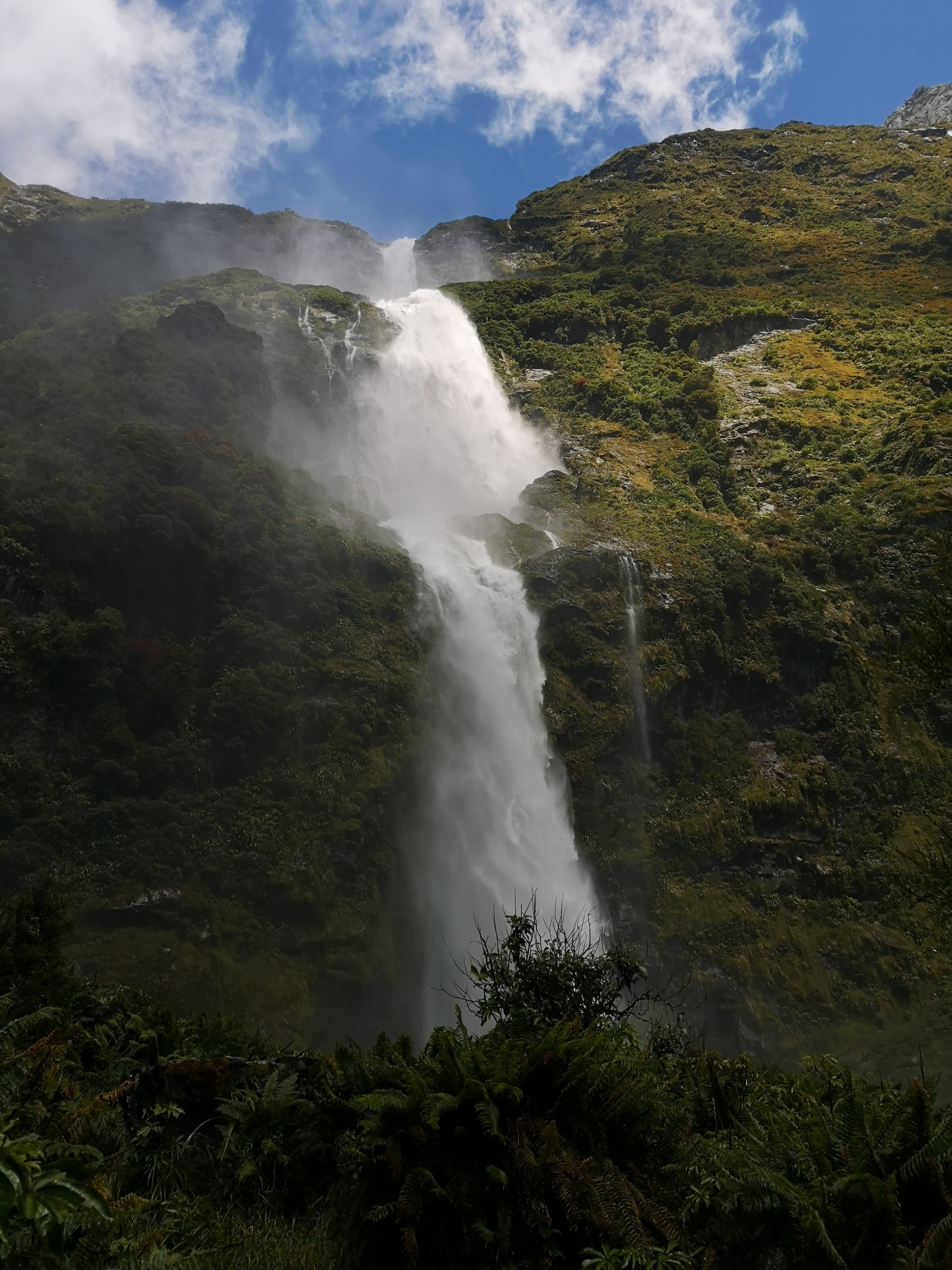 On the Milford Track there is no option, walking is in one direction. Each of the huts must be booked. You form a team of 40. In these big huts, with these sorts of crowds get up and get gone is the best policy. Beat the kitchen rush. Pretend at least for a while you’re the only one out there, you have the track to yourself. Beads of water hang off branches, off moss, like diamonds on a chandelier. The spider silk waterfalls hang down from the highest terraces, dropping all the way to the river below. Beyond the tweet of birds, the chirp of crickets, the roar of falling water is the loudest sound in the valley. Even on a day when some of the bridges cross dry streams. I slow down along the fast flowing sections of the river, hoping I’ll get lucky. The Whio remains on my list of birds to see in the wild. I’m starting to feel like I’ve walked all of Disneyland. I’ve got everyone’s autograph but Goofy, only Goofy is a blue duck and won’t be signing anything. This might be my last chance for a while. A final foray into the mountain waterways. I pick up speed easily on the wide, flat track. The bush is glorious in the morning. Dew dripping through the leaves, sun dazzling on the water. Calm and quiet. This is all there is, the only thing that is real. All that matters. I find myself reflecting on my time outdoors. The backcountry of New Zealand is so easy to access. People can connect with nature, foster a desire to look after what they still have, nurture the wild spaces. Make sure it’s still here tomorrow. The Milford Track remains easy, flat. Wandering with the river. Traffic cone peaks rise straight up out of the valley floor. The old giants of the forest are dwarfed by the ancient behemoths of stone. I catch up with a couple of farmers from the Wairarapa. “We’re dawdling,” the woman tells me. I suspect I am as well. They head on while I stop at Hidden Lake to watch the water drop from the high cliff walls. Back on the main track I spot them again not far ahead. The woman beckons me over. They’re looking at something up in the trees. A Kaka pulls apart a branch before disappearing deep into the bush. Bird watching is like that here. Right place, right time.