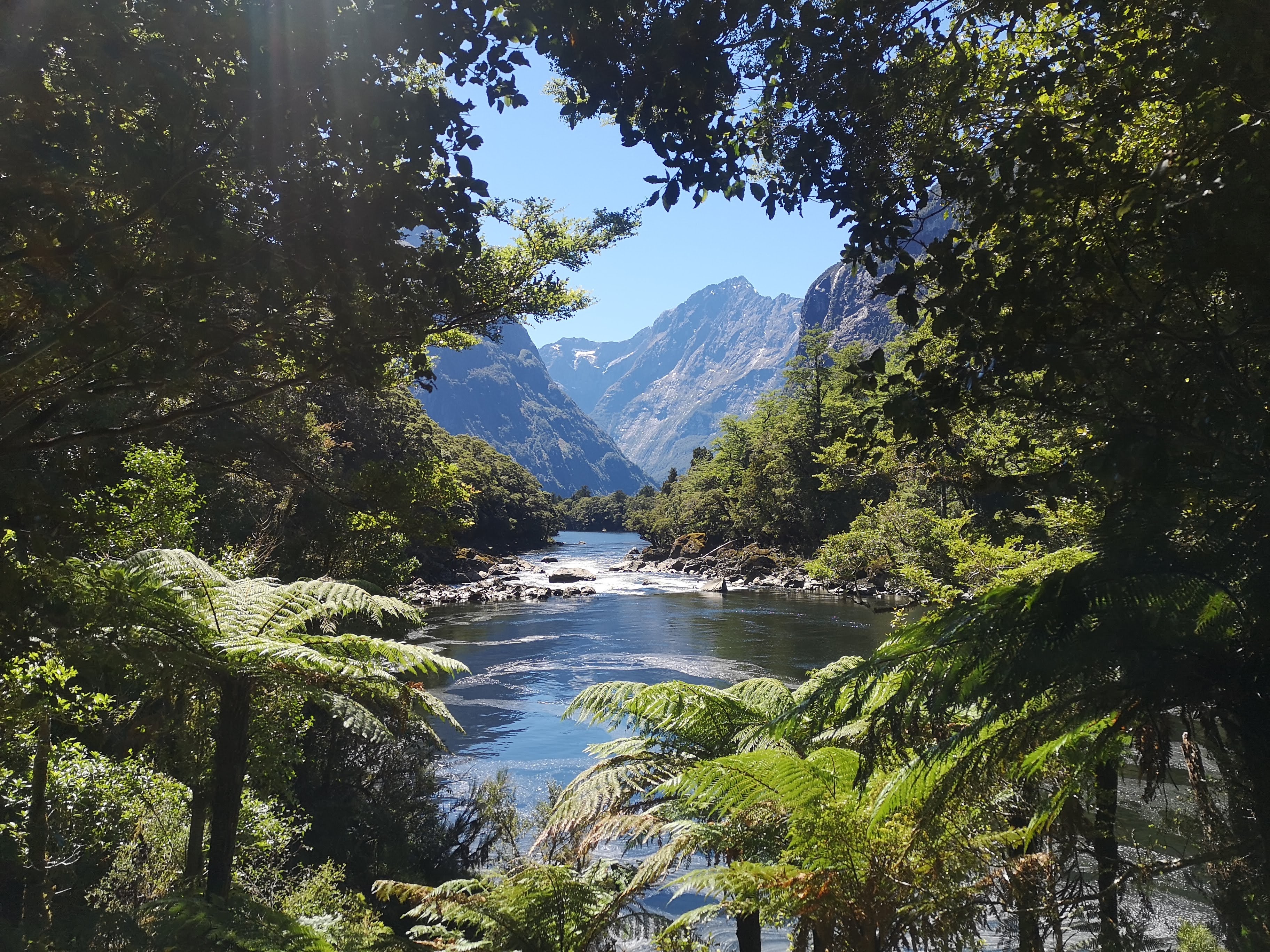 Leaving early is good, but when I have a fixed distance to walk I start to think about what I’m going to do with the rest of my day. Finish another book? Wait for someone to arrive with entertainment. Instead I slow down even more. I try to get Piwakawaka to land on my poles, holding them out straight until my arms get tired. One floats around the pole, settling instead on a secure branch. When the Toutouwai approach, I stop dead still and see how close they’re willing to get. None step up onto my boots. I don’t see a single Whio. I stop at another clearing. There’s something moving on the far bank. Dark in colour, duck in shape. The white headed partner of the Paradise Duck dashes my hopes. I don’t hear the Whio whistle or growl. Someone will later tell me they saw 5. I’m not mad. Ok, I’m a little mad. 5 is greedy, save some for the rest of us! But I know how it is. As with the Kaka, you’ve got to be where they are, when they’re there. There are mile markers along the track. A nod to New Zealand’s past, when they used measurements that don’t make sense. They don’t matter to me I don’t know how big a mile is, or how many miles away Mintaro Hut is. The kilometres on the other side are more of a problem. I start doing the calculations in my head. Not far to go now. Last night’s rain has already washed through. The Clinton River running clear. There are still relentless waterfalls. There are also endless strips of clean rock, glistening in the sun where other falls might have been running earlier in the day. Out of the bush the valley walls climb straight up. The classic U shape of a glacier carved valley has the depth of a test tube. There is nothing for scale. Massive walls of bare faced granite. More impossibly big country. My brain has shuffled. Finding space for the kilometre high mountains. Electric blue rivers are normalised. I am accustom the surroundings. Almost home. Certainly where I want to be. A dry riverbed has a flood warning sign advising to wait in the Bus Stop shelter if the water level is high. I wonder what the longest anyone has stopped to wait here for a bus that will never come? In the riverbed the track deteriorates. Finally becoming something more than a footpath. I know I’m getting close to the end as I hit the incline. Slowing down again, without ever hitting my highest gears. No point. No need. Behind me Rob and Katie speed through. I don’t remember seeing them before I left this morning. Speed merchants. Done by lunchtime.