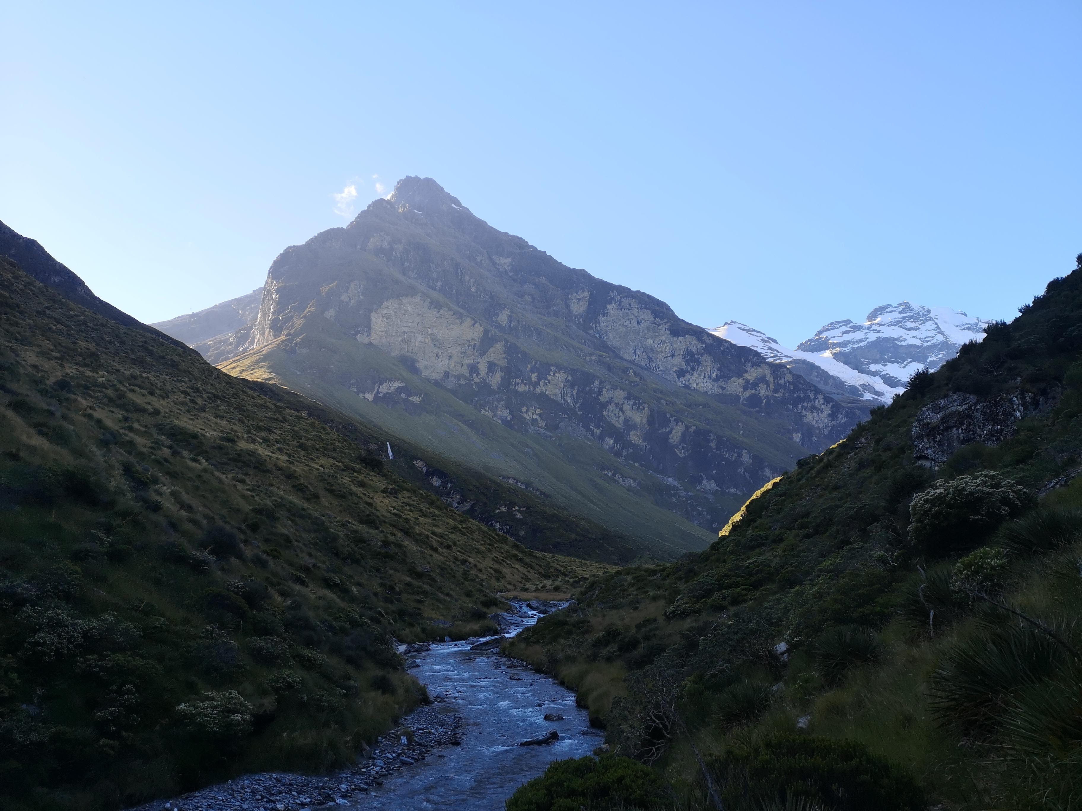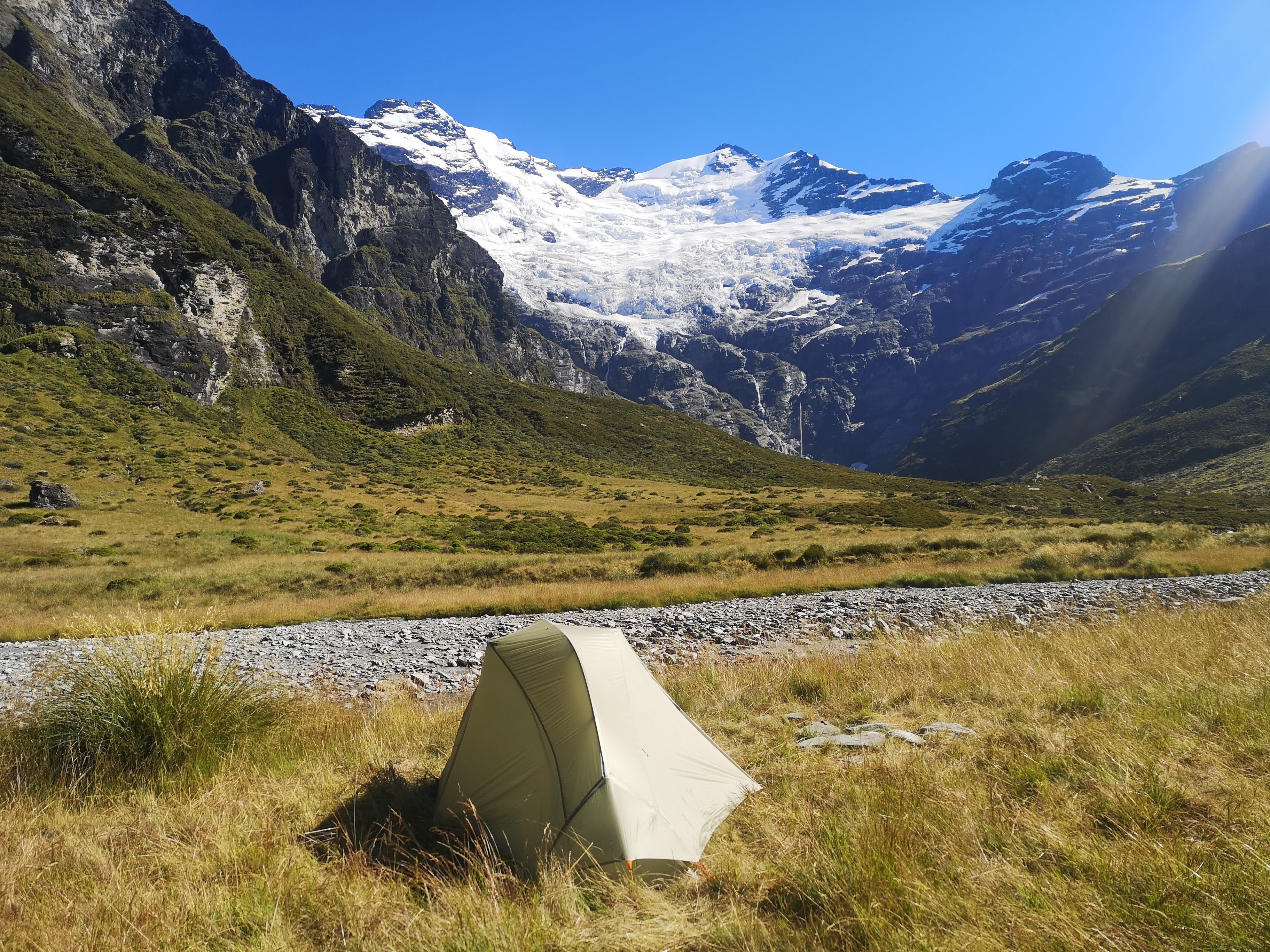 The last time I saw the stars was with Jannik on Stewart Island. There was one brief half-asleep wee at Liverpool Hut. Staying up until the day gets dark is far easier in the winter. I stand outside the tent, waiting for the blue to fade to black. Light from the first stars begins to reach me. One, then two, then three. I’ll be surprised if I’m awake for many more. The first constellation appears, one of the only ones I can name. Orion. But it’s too late, I am too tired. I can hope I’ll need a wee in the night. I did not wake up to see the stars. I slept so soundly to the tune of the running water deep in the valley. I expected to wake up to fog. Instead I had clear blue skies. Several hours until the sun will reach the valley floor. I take my cup of tea and journey towards the rock wall and ice fall. There are more obvious camps deeper in. Flattened grass and stone circles around fire pits. Two green dome tents are a little closer to the action. The Earnslaw Glacier is breathtaking. A slump of ice feeding a dozen or more cascades and waterfalls. All of which flow into the Earnslaw Burn. I can’t believe the scenery is still able to blow me away. Another sensation on the Road to Paradise. I sink my now empty mug into the stream and drink deep on the cold, fresh water. A new roar begins behind me, above the water. I hope it isn’t the rest of the ice about to fall. A helicopter speeds down the valley. Landing on flat ground. The pilot gets out, leaving the rotors spinning. Checking whether or not he can bring his scenic flight passengers up for the day. I suspect he’ll be back. The helicopter disappears over the valley wall. Time to make my own slower, longer exit.