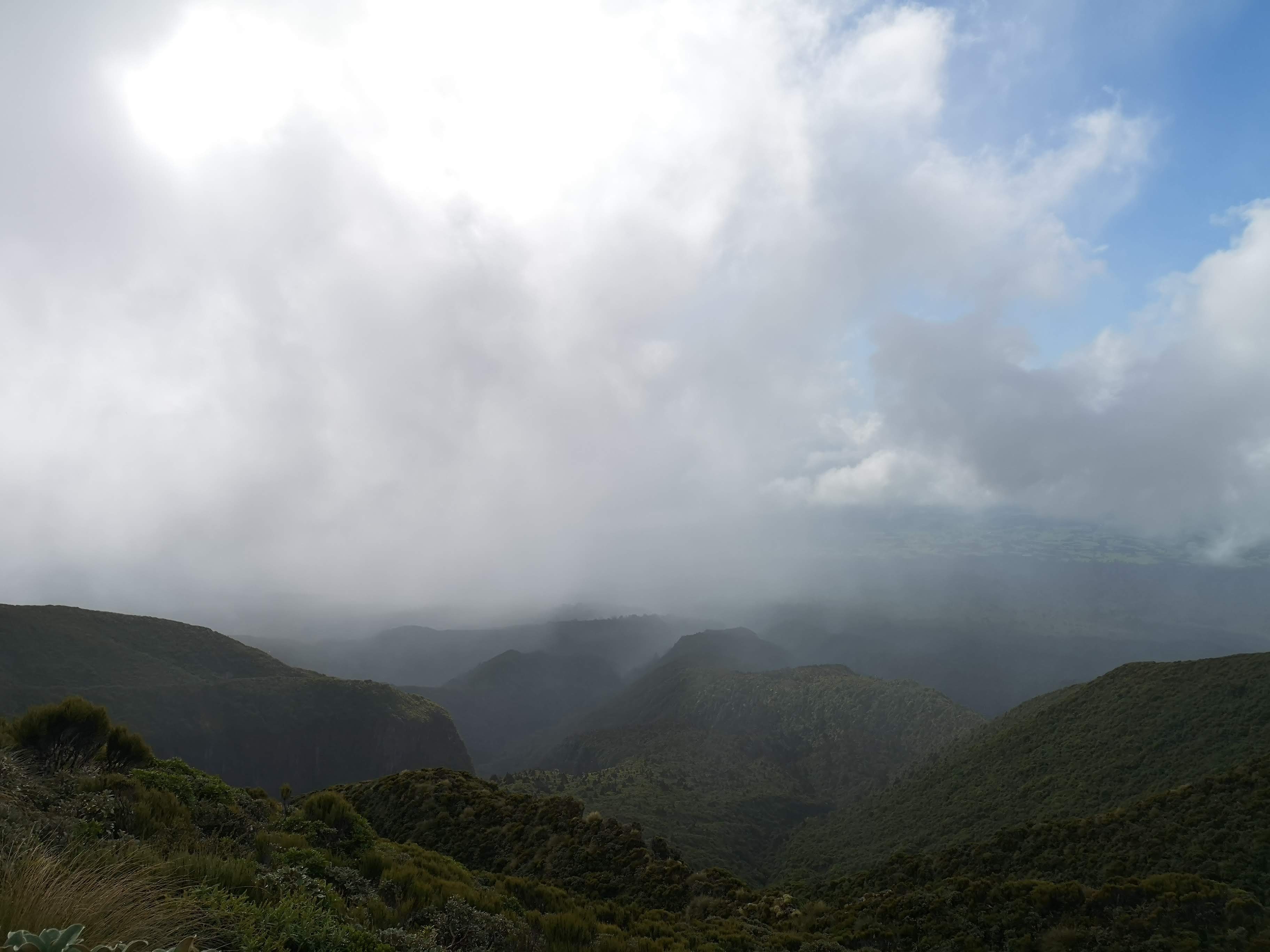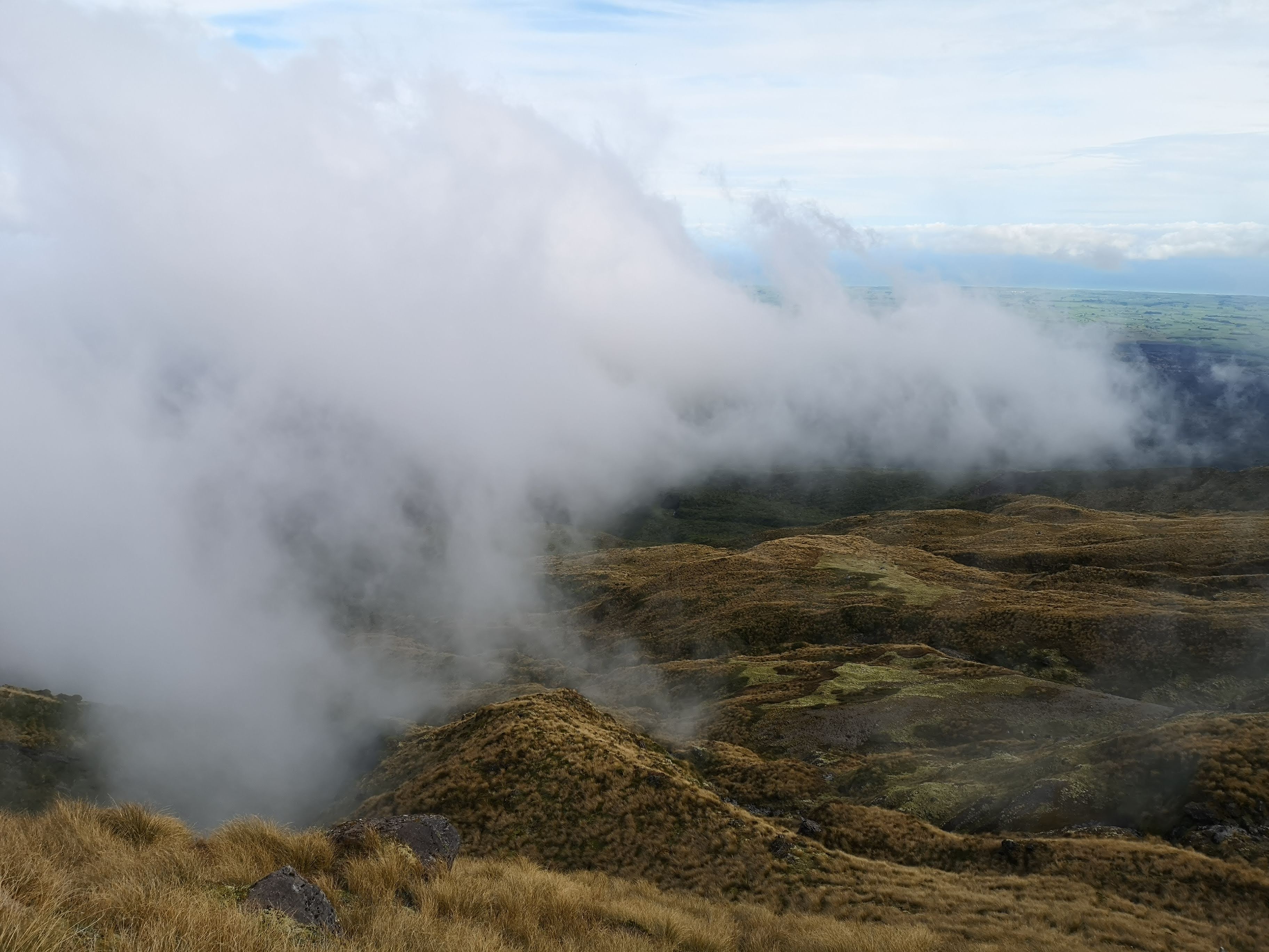 I get up in the night to check the wall rats aren’t destroying my stuff. I don’t see any movement, nor to I see any indication of general rummaging. Maybe they can’t get out of the walls. I get up again for real and get on with it. The weather is good again in the morning so I commit to the high track via the ski fields. The formed track is oh my god, so nice, amazing as long as it lasts. The Stratford Plateau comes fast and easy and with it one of the finest views of Taranaki so far. One that shows it isn’t the perfect cone after all. The South side sweeping up again to form Fantham’s Peak, which is tucked away up in the clouds. I reach Manganui Gorge and meet the wind head on. I push through to the shelter at the ski field and add some more layers. Things get worse. The wind brings the clouds over the mountain. The sky closes in. Visibility drops. Rain starts to fall. I take shelter under the deck of the Tahurangi Lodge. I swap my fleece for my waterproof. Some guys come back from an aborted summit attempt. No visibility up there either, and too much ice. I’m glad to have passed up on going up. I think I could go up but I don’t know I could get down again. Down is going to destroy me.