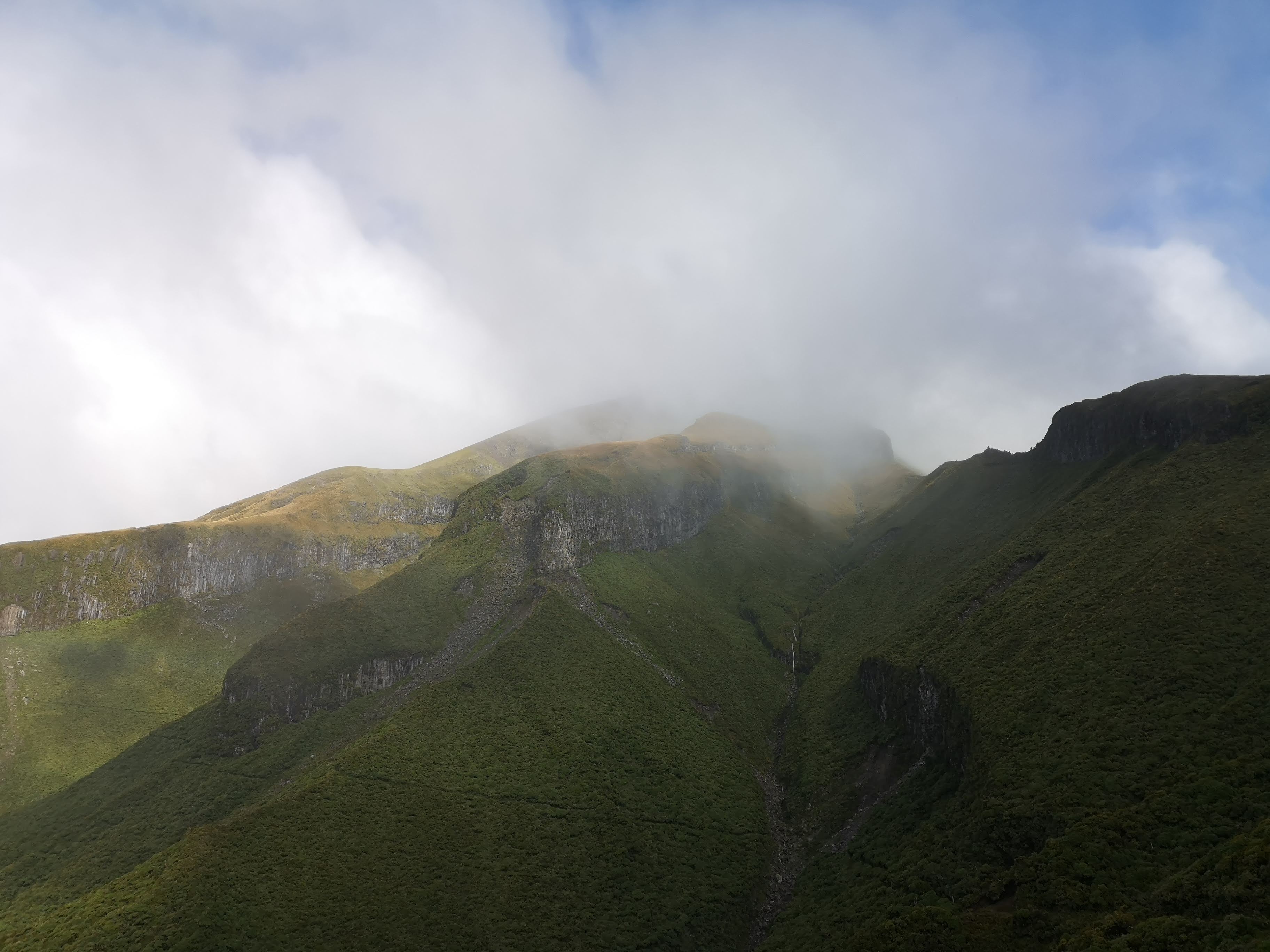 After a while things get easier again. The two ladies are on the ridge ahead. They turn back and wave. I drop in to a deep gorge, cross a dry stream bed and start coming up the other side. “Oh hello,” a voice says. Emma stops for a chat. She summited yesterday in the fine weather and then slid down the scree slopes to Syme Hut. “Are you staying there? It’s the best hut I’ve stayed in. You really should go,” she tells me. I know the forecast for tonight is rain. I also know if I go up, I have to come down. “I’ll think about it,” I say. “How about this gorge eh? Wasn’t expecting to find this here. It’s not on the map.” She’s right. Hardly any of the features around the mountain are marked. I suddenly realise I’ve been spoiled by OS Maps at home, where seemingly everything is marked. The map translates to the landscape. Fewer surprises. Emma moves on, halfway around her own circuit. Another bigger bad-ass than me on the trail. I carry on, walking my own walk.
