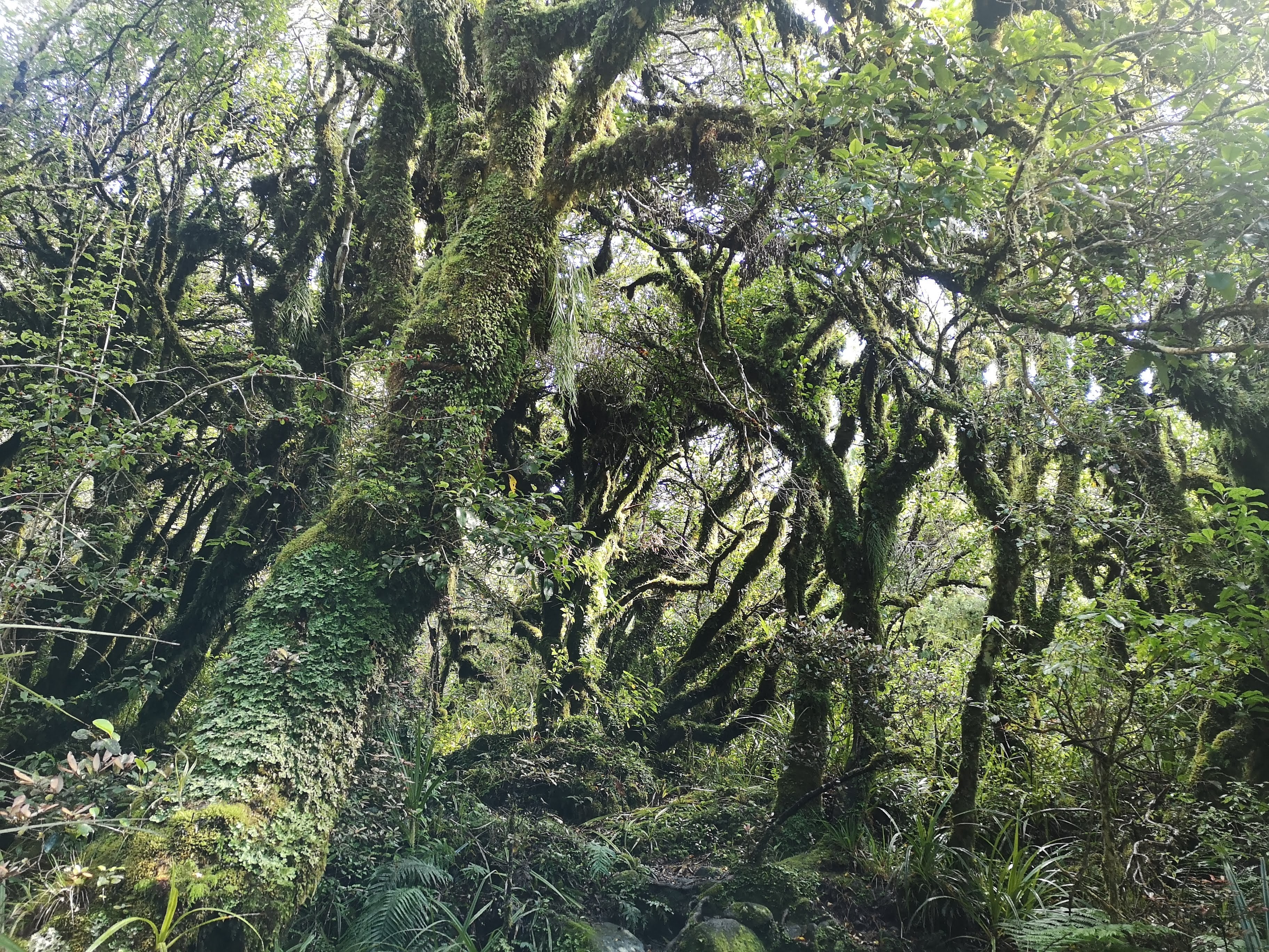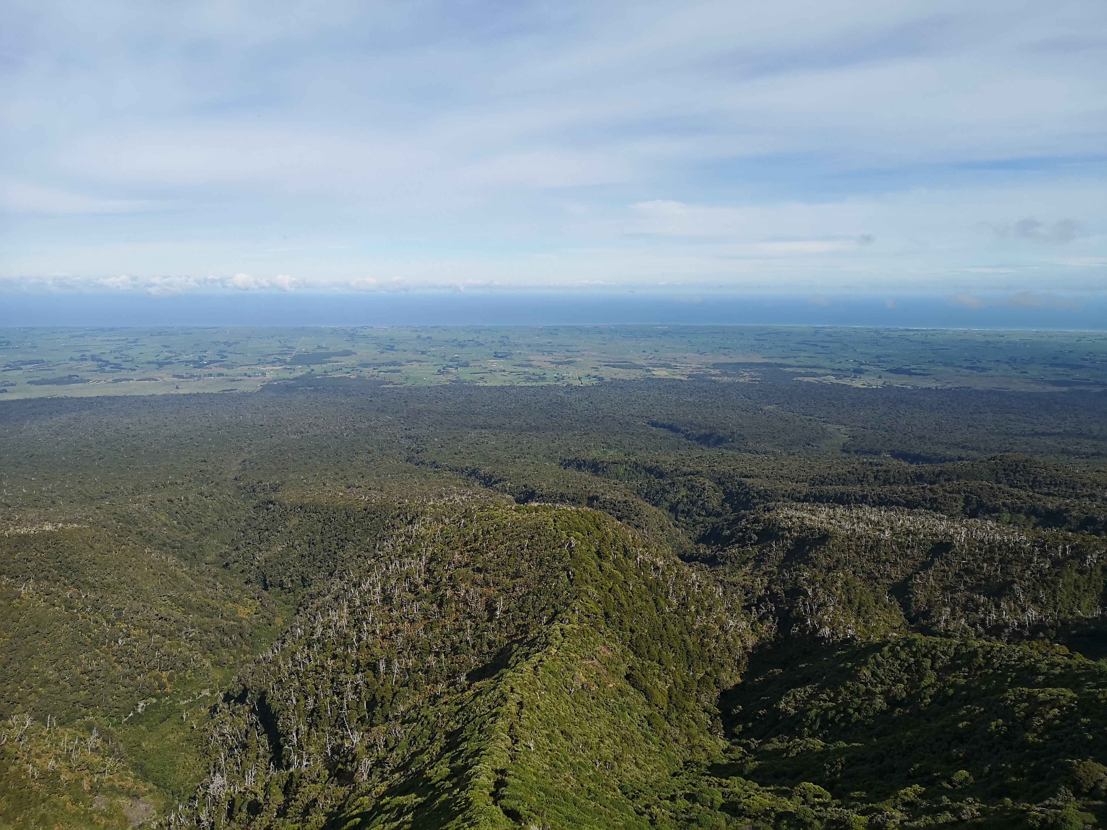 More water courses flow off Taranaki to join the Stony River. So much of the black sand beaches of the West coast begins here. This mountain is in decline. At one stream crossing I hesitate, then I remember my feet are still wet from yesterday and plunge straight through. The Duke of Edinburgh team are somewhere in front of me. I follow their footprints through black sand, choosing to cross creeks where they have. I have no doubt they’re better educated in these matters than I am. The further I get from Holly Hut, the worse the quality of track gets. The West face of Taranaki has no visitor centre, no road. This side of the Egmont National Park remains wild and relatively untamed. I am surprised then to find an aluminium ladder in place to make short work of a descent in to another stream bed. Things don’t improve. I schelp and schlurp through mud. A keruru bursts into life overhead. Often, I am the loudest sound in the forest. Sometimes the next stream is louder. A tui impersonates a Star Wars droid somewhere in the canopy. I reach the junction for Kahui Hut. Sat on the floor around the signpost are the Duke of Edinburgh Team. “How’s it going so far?” they ask. “Easy,” I tell them, “I got to follow your footprints.” That’s not the case from here. They’re turning off, up to the nearer hut. I’ve still got a while to go to reach Waiaua Gorge Hut. Liz tells me the track gets a little better from here, some of the streams are bridged. Catching silk threads of cobwebs with my face. I slide down gullies and scramble up the other side. None of the streams are bridges. Only after I pass the second turn off for the Kahui Hut do I find bridges, which make moving forward so much easier. To compensate I find huge bogs between trees, where leaf litter has mixed with rain water. The mud sucks at my boots and I pull on through.