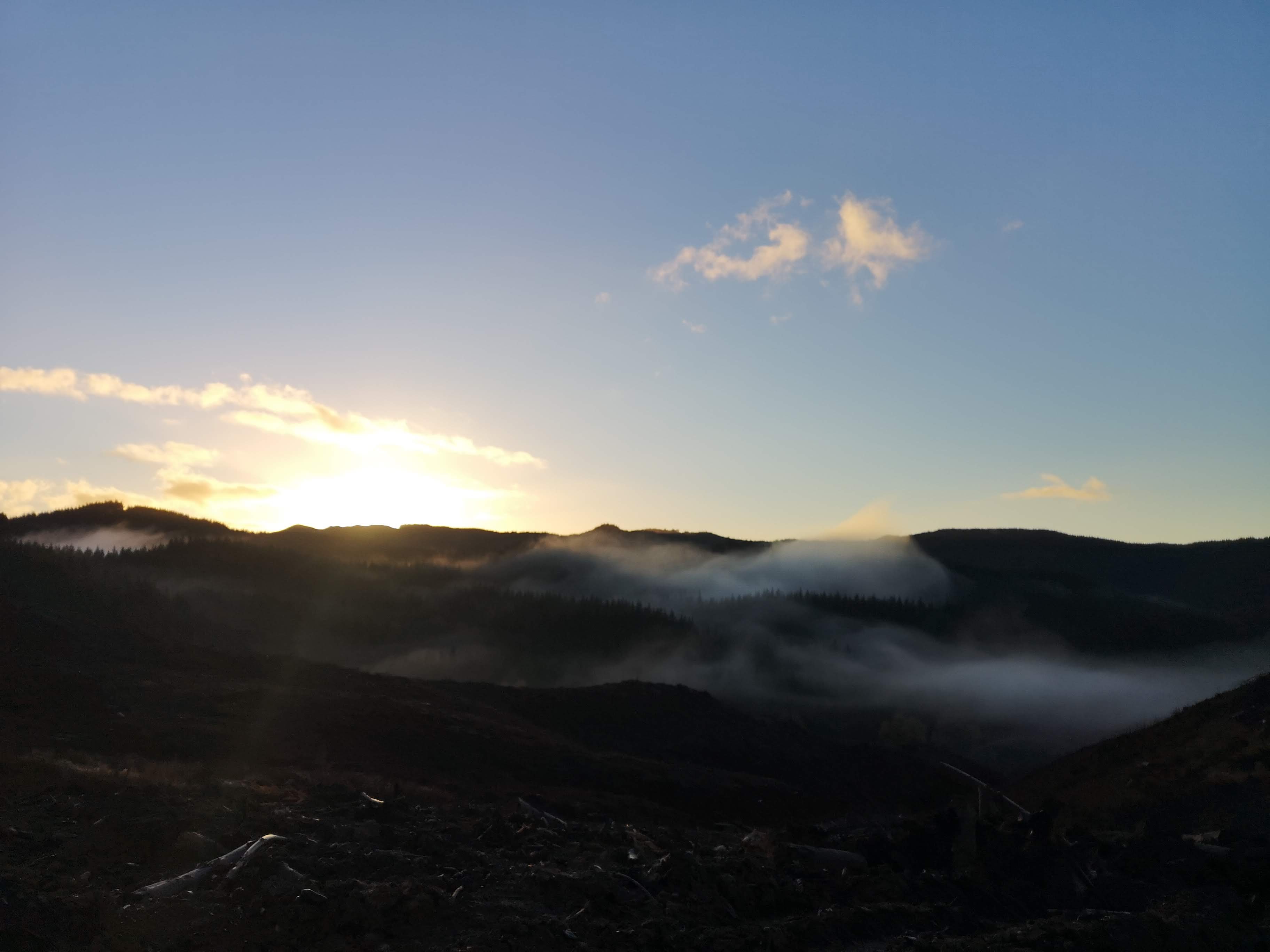 From one service station we cross the road to the Mobil. In a carpark behind the shop, the change over happens. A handful of people get out of a car and join us. The van might be full, there might only be four of us. The road out of Bayview is straight, running along the beach until it hits Tangoio where it becomes a snake. We get caught behind a logging truck. On the way out they’re empty. On the way back, loaded with logs. I’ve done this enough times for the Final Destination 2 fear to have finally passed. I don’t know how the logs are secured but they are. Next comes the silver waters of Lake Tutira. Or are they black? Or blue. A mirror for the sky. Someone snores further back. My own eyelids begin to drop. Some mornings I snooze, others I watch the world wake up. The sky burns orange. Chalk rubbing clouds glow pink. The van slows through the village of Putorino. Nearly there. Ratu switches on the radio. We turn off the main highway. The road twists higher into the hills. Pine trees stand to attention along the ridge lines. Younger trees, planted 3 or 4 years ago puff up out of the ground. Fog floods the Mohaka River valley. We ghost past the sleepy houses of Willowflat. “Light vehicle, Willowflat Bridge to the Airstrip.” Ratu announces over the radio.