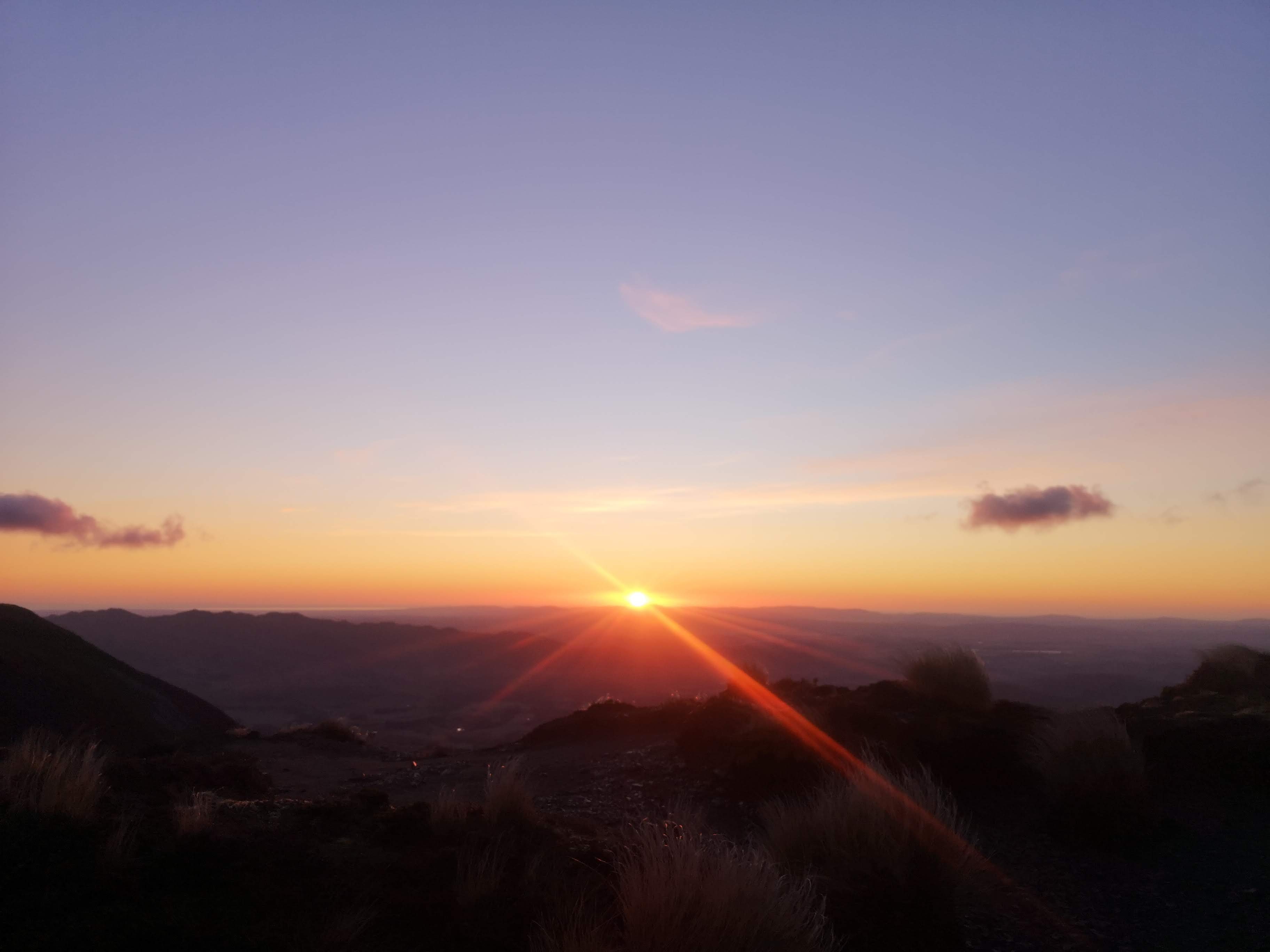 Dry pine log roar in the wood burner. The hut now well above room temperature. After a simple dinner of tuna and noodles I sit in the main window with my Kindle, reading and watching the light fade over the bay. Night falls. The streetlights of somewhere, Hastings maybe, are the only definition in the dark. The handful of other guests slowly retire. I try to hold out a little longer. I don’t last. I crawl in to my sleeping bag. The wind doesn’t so much whistle through the chimney but scream. In the night I dream of planting trees. It is over, but when will it really end? The wind stays up all night, gently tugging at the edges of the hut. After a fitful night I find myself awake. Sunrise is soon. I pull on my clothes and head on to the small plateau in front of the hut. The orange glow of dawn spreads across the horizon. The sky turns pink as the sun slowly emerges from behind a distant hill. I decide to take another look behind the hut. On the small ridge, the wind is even more aggressive than yesterday. I lose my footing and slide backwards in the gust. The 1600 meter plus summits and buried deep in the clouds. Feeling neither brave or stupid, I decide to take the easy way down.