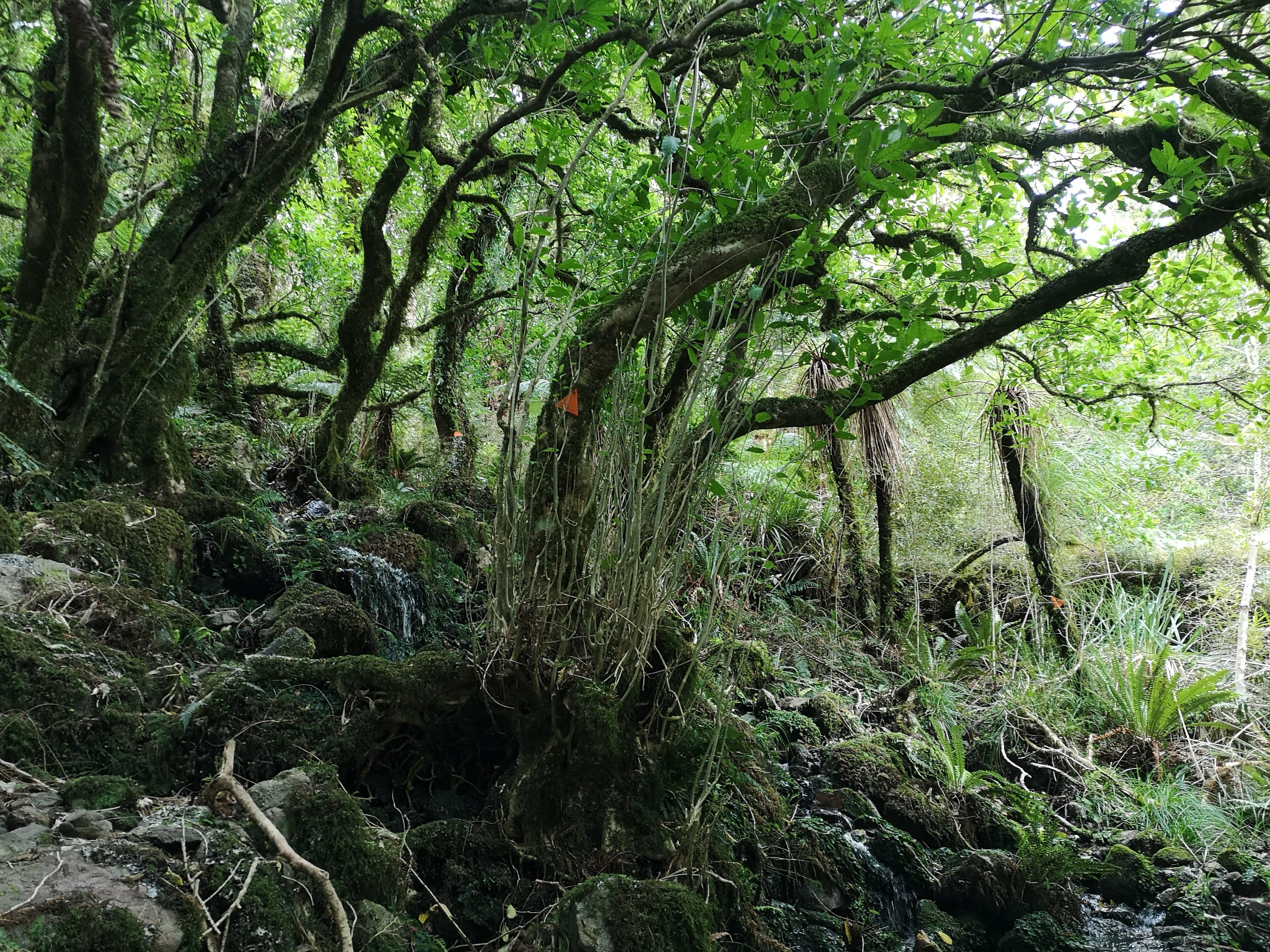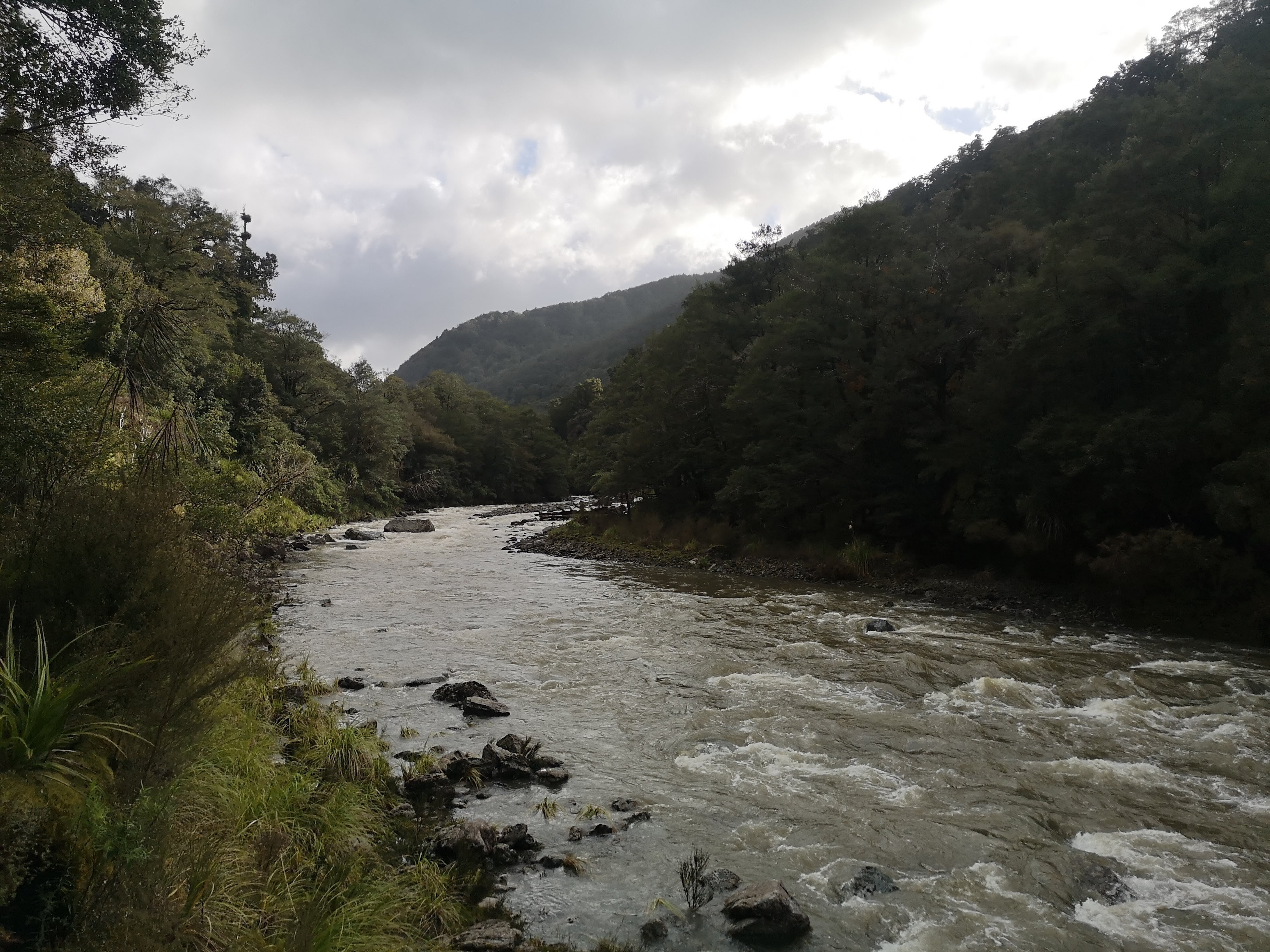 The almost blue bathing pool I thought all too briefly about last night is gone. The Waingawa River now high and brown has washed it away. I hope the fact it isn’t raining right now means the worst of the weather passed by in the night. I’ve counted 7 streams on the map between here and my next destination, Cow Creek Hut. Two of them are big enough to have names, big enough to be a problem. I’m going to have to cross what I find. The first few are probably unmarked, fast and clear. A step over is all that’s required. All signs indicate I’ve anywhere from 3-5 hours ahead of travel upstream. Being 6km away, I know I can’t trust the straight line on the map. The river has already laid claim to the fastest route. The streams won’t be flowing over land, they’ll have cut deep trenches into it. The track, at least, is obvious. Orange markers appear often, although with the amount of fallen trees I find some of them on the floor. Roots glisten, wet rocks are an open invitation to slide. The weight of the rain has crept in to the ground. I pull a Phil Jones face as part of the Earth collapses beneath me. I slide to a comfortable stop on my feet, still on the track.