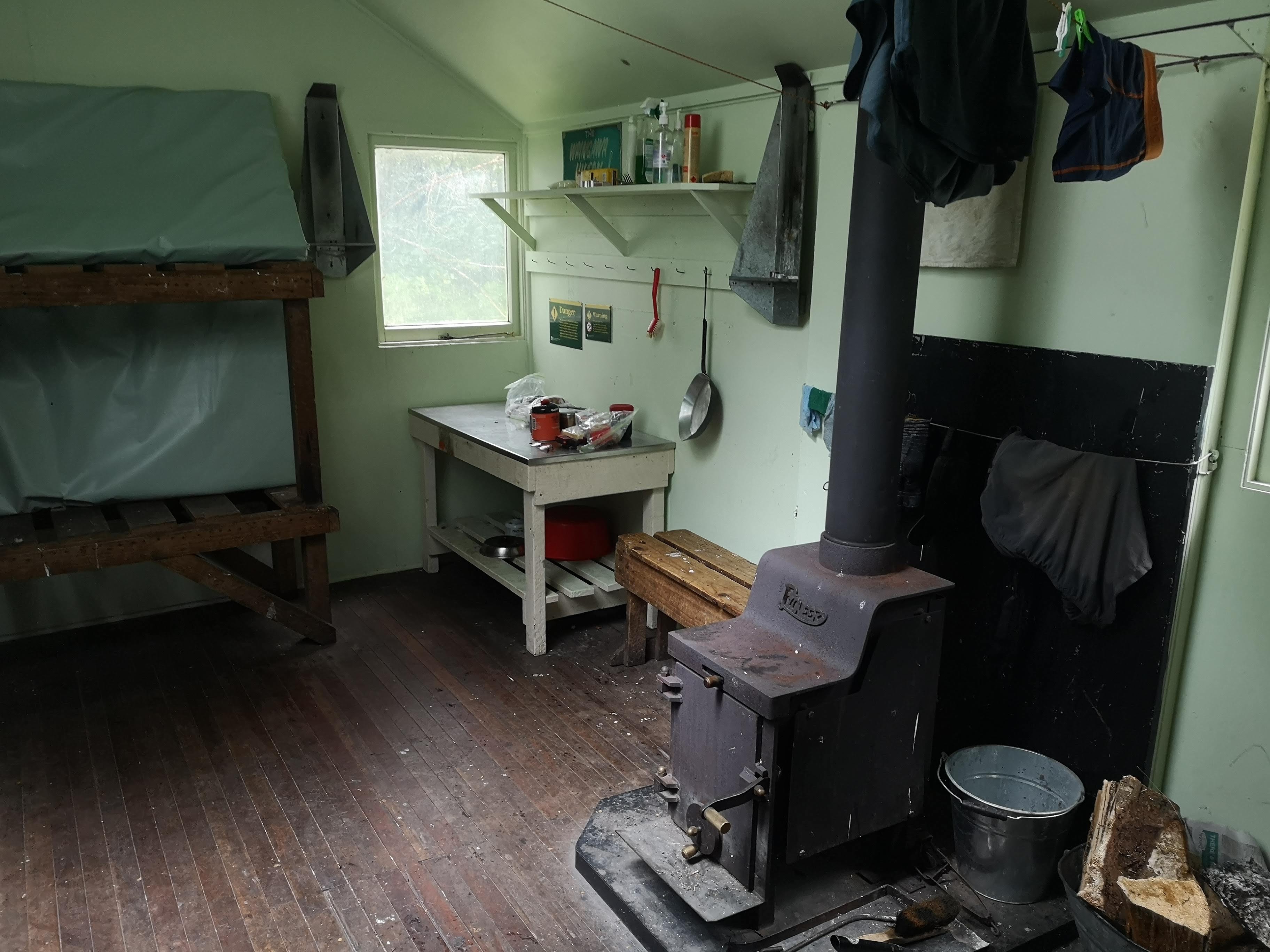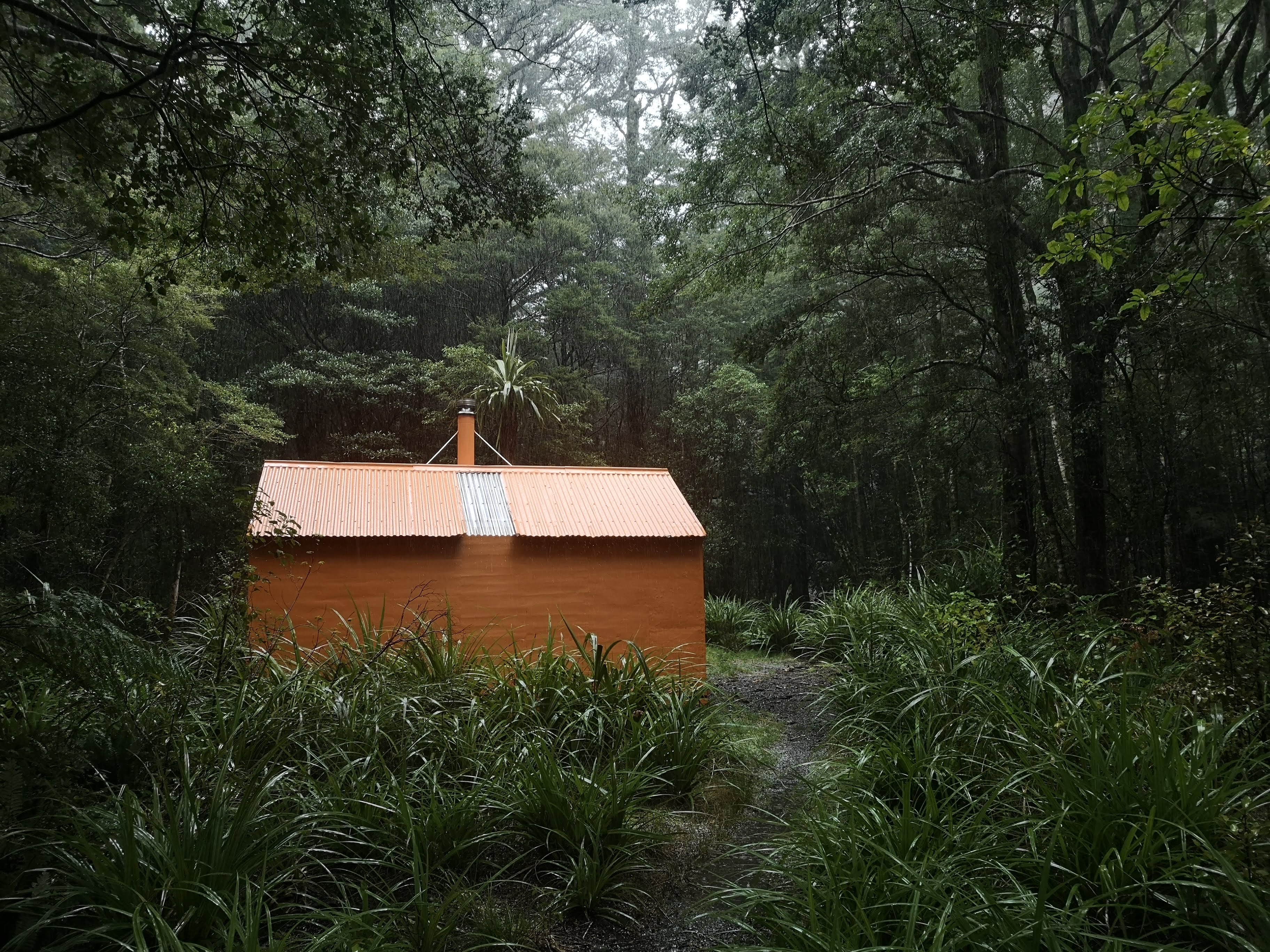 Worse than the streams are the standing pools, the hollows in the track that have held on to the rain. Below the water, the mud sinks as deep again. By now I’m squelching, regardless of whether the track is wet. Above me I hear the not quite enough time to prepare warning of rain. The droplets bounce first off the leaves before they reach me. This one passes as soon as it starts. The second comes and I throw my cover over my pack. The third hits a little different. Hail bounces off my t-shirt which gives me slightly more time to pull my own jacket on. Up ahead the hill through the trees have grown misty. This might be with me for a while. Putting my waterproof on was wise. if the rain is now falling as hail then it’s colder out than I think it is. The waterproof’s primary job, I’ve learned, isn’t actually to keep you dry but to keep you warm. Mine still does that. I’m glad I’ve only committed to a short day. I know the hut can’t be far away. First comes the swing bridge, then the small orange box over the toilet and then the bigger orange box of Cow Creek Hut. This is my first former deer culler hut, one room with six bunks lining two of the walls. There’s a bench in the corner and a wood burner in the middle. There’s no sink, not even a water tank. There’s plenty of firewood, and a bucket of water filled from the stream. I get out of my wet clothes and get the fire on. Knowledge is knowing heat rises. Wisdom is finding somewhere above the fire place to hang your boots out to dry. By now the hail is pounding on, sliding off the single sheet of clear corrugated plastic skylight. I can avoid going outside for as long as possible. During one break in the weather, I dart down to the river for a look-see. There’s a cute campsite. I must remember to fill the bucket before I leave in the morning.