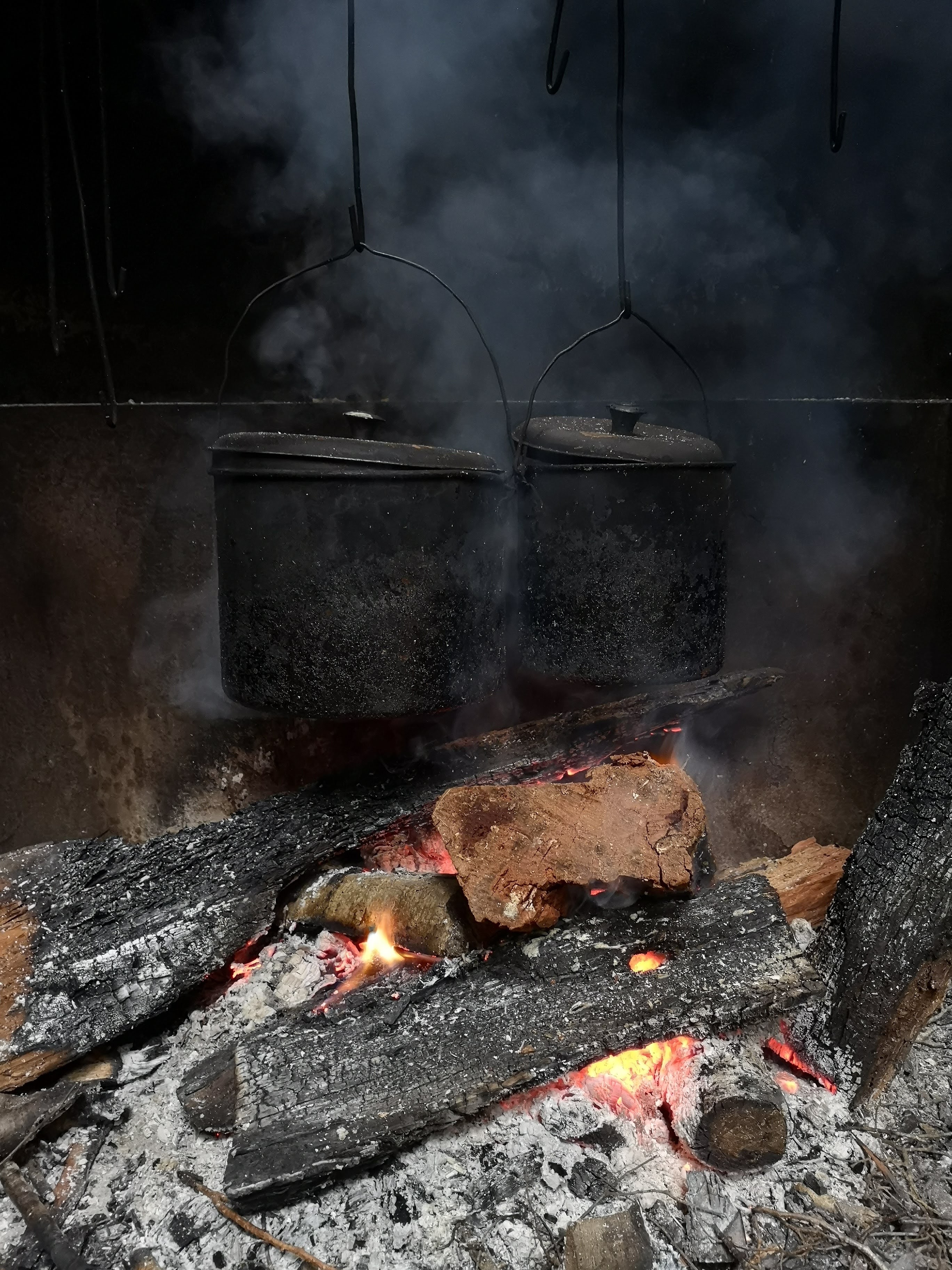 At the next stream I find windfall has either combined with or caused a slip. The track is gone. The earth is loose. Smashed fern stumps and broken wood litter the fall. No step is certain. Sliding might actually be the best way down. How anyone would come up the other way is beyond me. I hope I don’t have to come back this way. Keep following the rises and falls. Across an open slip I get my first and only view of the surrounding mountains. The ridge tops are under a wave of fog but I can sort of see them. A dusting of white from yesterday’s, or maybe today’s, snowfall. Fantastic. I remember seeing the slip on the map. I’m getting close now. The shift down hill turns the moss back into ferns. Tree trunks get thicker, taller. The roar of the Waingawa River grows louder and there’s an unusual smell in the air. Surely not woodsmoke. Nobody else would be stupid enough to come out today. I decide I can smell the river. Through the trees the bright orange of Arete Forks Hut is unmissable, which is probably why they settled on the colour. Smoke is billowing out of the chimney. Somebody is home. There’s paint tins and a garden chair out front. I don’t remember reading any notes or warnings about active maintenance work. Inside the open fire is roaring. A man is sat before it, black billies steaming above. Gear spread everywhere, worse than me even. Derrick, I learn, is an ex-New Zealand Forest Services deer hunter. Arete Forks Hut has been one of his second homes since the 60s. He’s a care taker of sorts. Does some maintenance now and then. He warns me the top half of the inside walls are still wet with fresh paint. Then he slips outside to continue cutting wood to keep the stores up. “Not many people come through here,” he tells me when he comes back in. He sets about making his dinner. He’s still an active hunter, having shot a deer on his way in. Venison goes into a camp oven with onions and carrots. The open fire might be better for a pot roast but Arete Forks Hut is a long way from warm. I get my socks and shorts up high and edge my boots as close to the fire as I dare. “Where are you headed from here?” he asks. “I’m hoping to go over the tops tomorrow and back to Mitre Flats Hut.” He says he’ll get me an updated forecast for the morning.