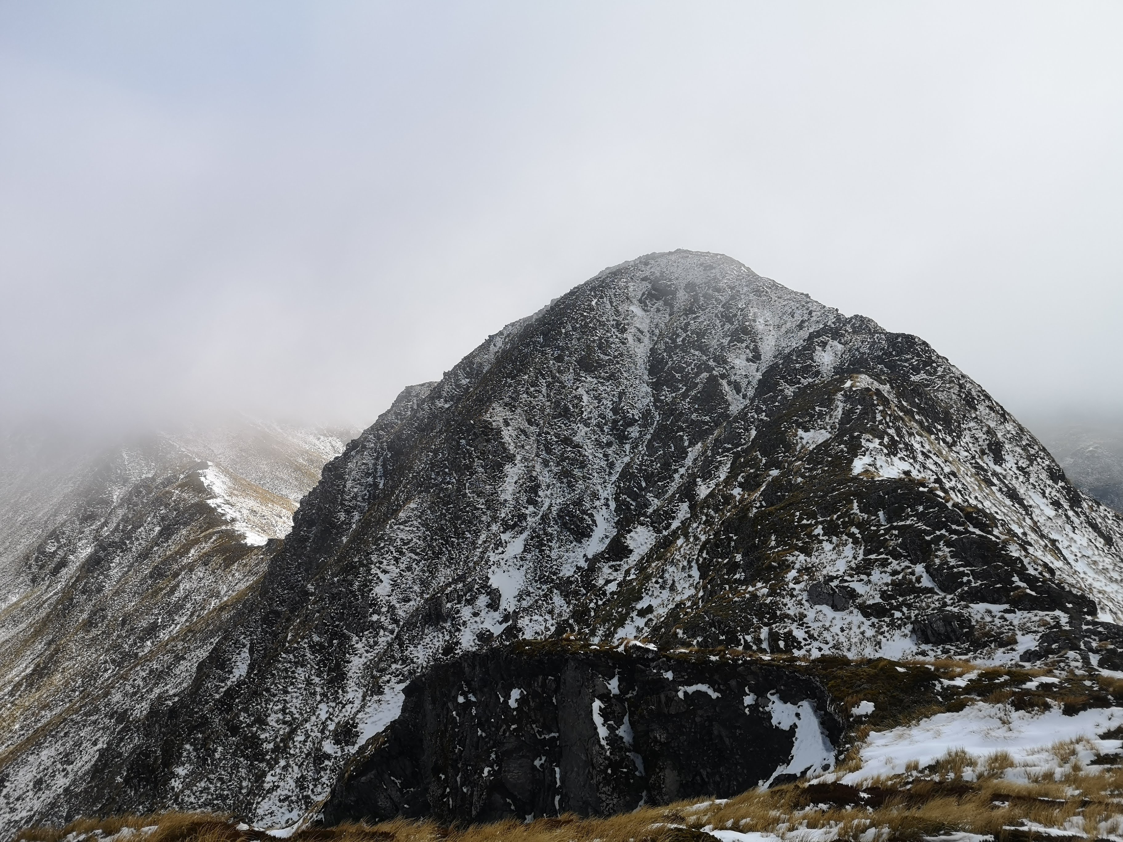 I scramble up over rocks, following a string of cairns. My first target is the unnamed peak sitting at 1330 meters, which is close to the edge of my comfort zone. The ice is more like snow now, sitting in drifts which I find to be anywhere from ankle to knee deep. The hole in my boot swallows it up. I change the plan again. I don’t need to rush out. I check my phone, out of the trees, at this altitude of course I have signal. I confirm with Jason I’m coming out tomorrow instead so he doesn’t send out search and rescue later. Up, way up, I can see what I think is Mitre Peak shoulder deep in cloud. Enough wind pushes the clouds along and I get my first glimpse. A serious piece of rock but it isn’t Mitre Peak, it’s the slightly lower Peggys Peak. My next goal. I am going up there. My confidence is running high, I’m making good time. The route remaining surprisingly straight forward and straight up. Peggys Peak begins to look a little like a monster. Mitre Peak must be tucked in behind. The trail sweeps around and up. The narrow ridge becomes wider the closer I get. There’s a small face of steep snow covered rock. The tussock here frozen in the wind’s direction of travel. I put my hand out for support and find an old friend, the horrid spaniard; spear grass. I haul myself up the rock and walk up to Peggys rounded summit. As the saying goes, the views go on for days, or only as long as it takes for the next wave of cloud to swallow them whole.