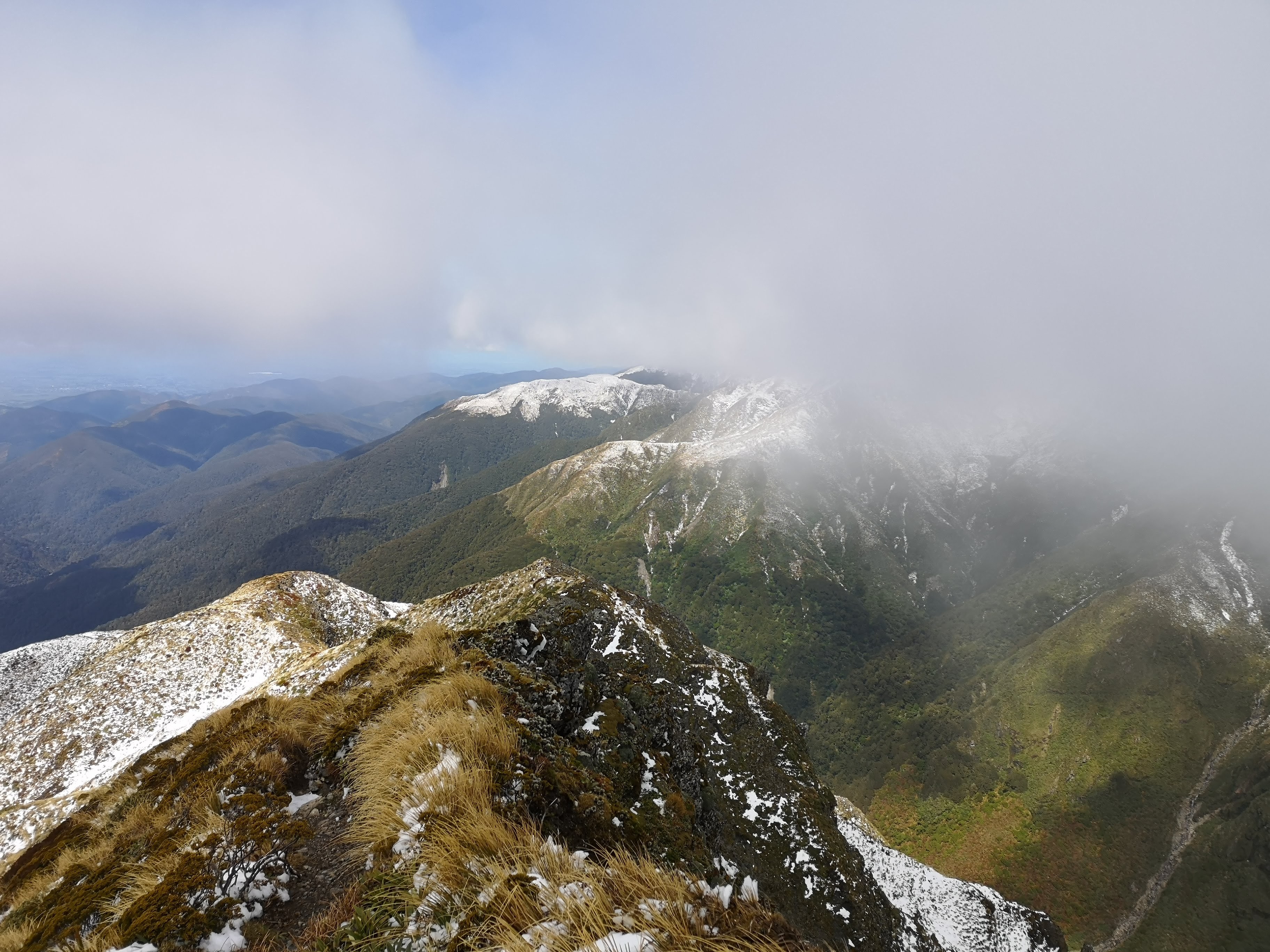 The initial climb wipes me out. Relatively speaking, the track levels out after the first stream and I begin to settle in to a decent pace. I don’t remember anything from the way in until the stream below the Baldy Track turn off. It’s not one crossing but four, and a bit of time spent in one. I’m so focused on a branch around my waist I don’t notice the one above my head and now I’m stuck. The limb is between my head and pack. If I go back down I’m going to end up with the other branch in my bum which is really not ideal. I have to lie down, thankfully not in the flow of the stream, push the branch up and wriggle through. Since arriving in New Zealand I’ve become a lot more accustomed to walking without using my feet. I’m free. There’s another burning climb to the top of the saddle and then it’s all downhill and then uphill again and again from there. I start getting ready to see Atiwhakatu Hut. Once I’m there it’s quite literally easy street to the car park. Nothing is ever round the next corner, or over the next stream, or beyond the next ridge but it does eventually appear. I’m moving slightly faster than my arrival. The final exit happens without any attention required on the floor. Every effort is put into pace. I make a dash for the van, drop my pack and cut back to the toilets. Finished, I look back one final time, the tops now completely emerged from the clouds, dusted in snow. Next time, maybe next time. There will be a next time of course, definitely one more. Possibly two if I can get these boots replaced and open a good weather window.