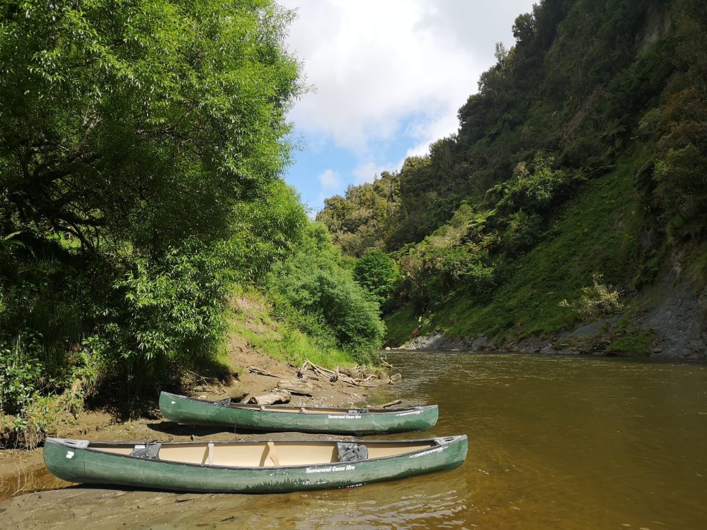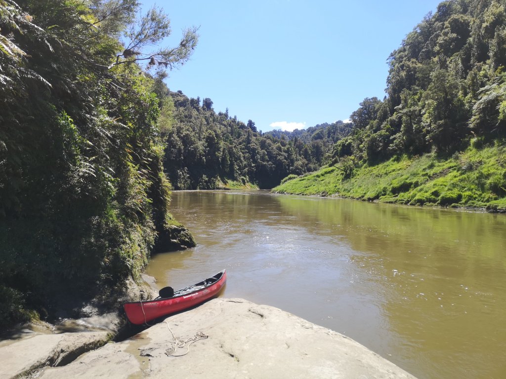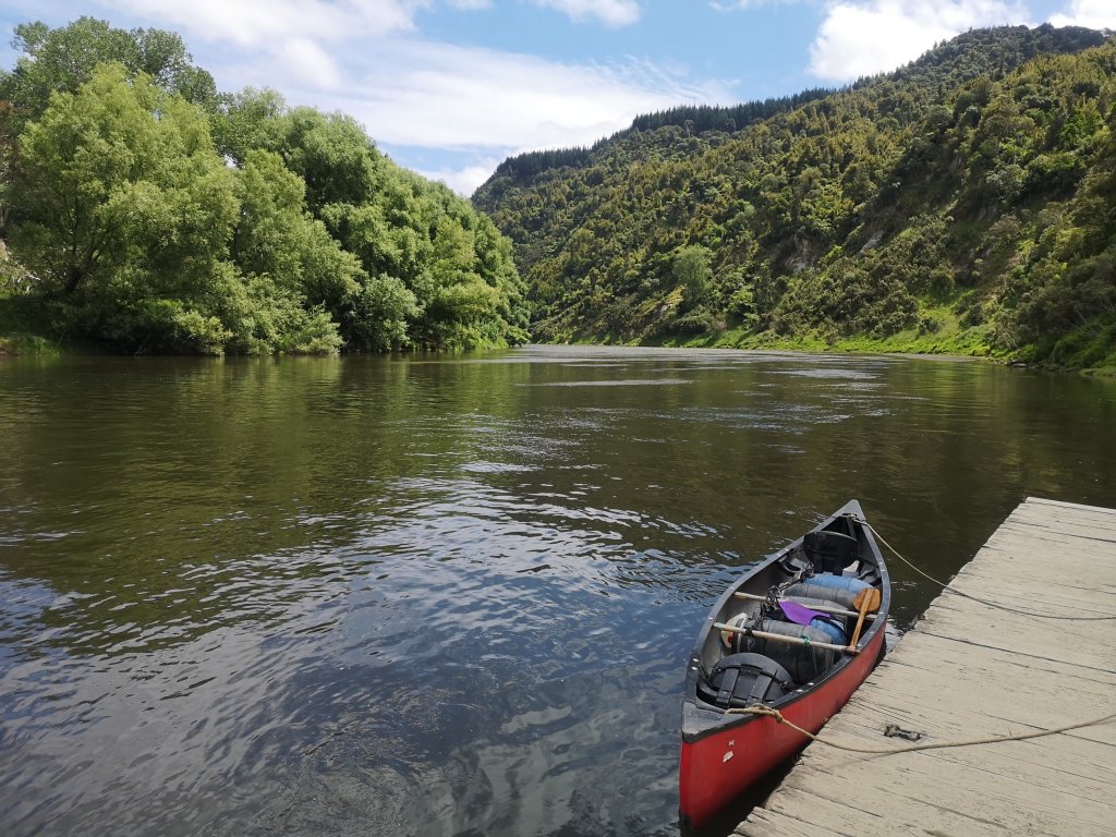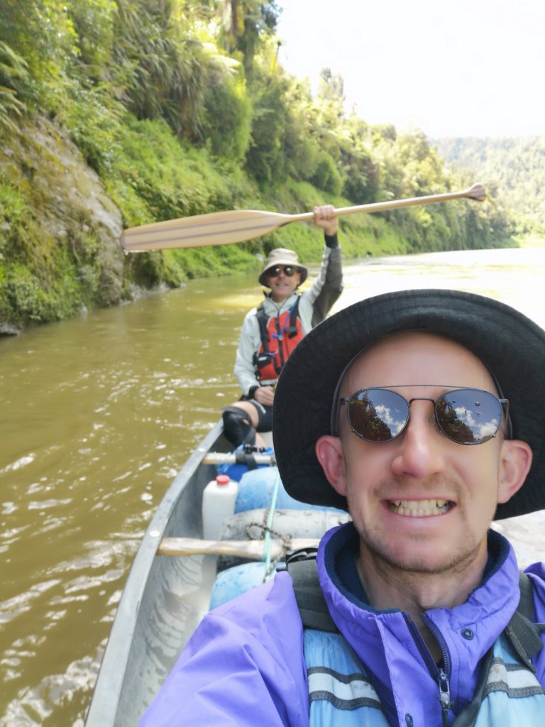 Iain pulls on all his own boat gear. He wafts around the beautiful wooden paddle he’s crafted himself over the past few months. I can’t help but laugh. “Ready to go then, boat wanker?” He laughs back. He has lent me a purple spray jacket and a pair of boat shoes. Interestingly the boat shoes come with a warning; not suitable for use in wet conditions. We’re given a river map, a final check off of our canoe gear. “Do you guys want to wait or do you want to go?” we’re asked. Iain’s gear makes us look like we know what we’re doing. He might, at least. “Let’s go,” he says. We push off in to the Retaruke River. Iain in the rear, in charge of steering and me. I’m in the front, the so-called engine room. We christen our red Canadian canoe Bucket, in honour of our not quite matching bucket hats. We are Team Bucket Hat. This is the first time I’ve accepted Iain’s push for a name. I hope our Bucket doesn’t fill with water. Ahead the thick, fast flow of the Whanganui River beckons. We’ve arrived! At last! Finally moving, the journey underway. “Have you started your GPS?” Iain checks. I haven’t, I was too excited to start. I set the tracker, allowing people to follow along at home. It might be a kilometre short, I’m sure it won’t be the last I lose. The first rapids feel like hard work. Half a life time has been lived since I last sat in a canoe. It already feels the same has passed again since I last picked up the spade. A few waves ride over our bow but we stay up right and come out the other side. We drift in the calm waters of the now receding flood. “A bit of this, a bit of that, I’ll be happy,” I tell Iain.