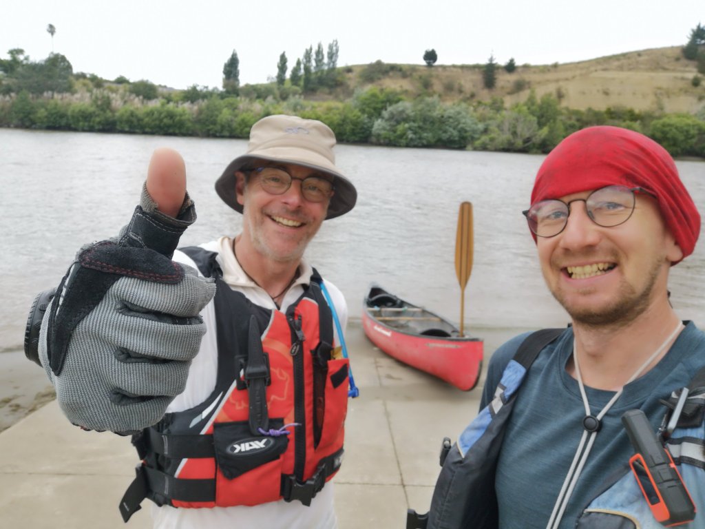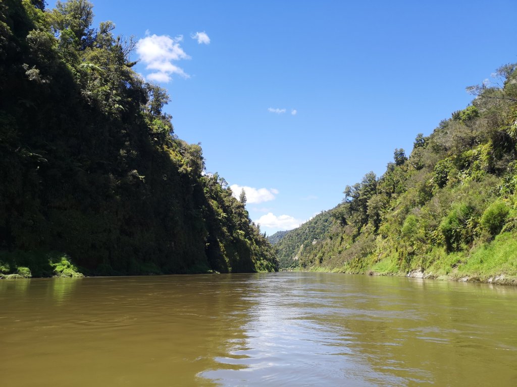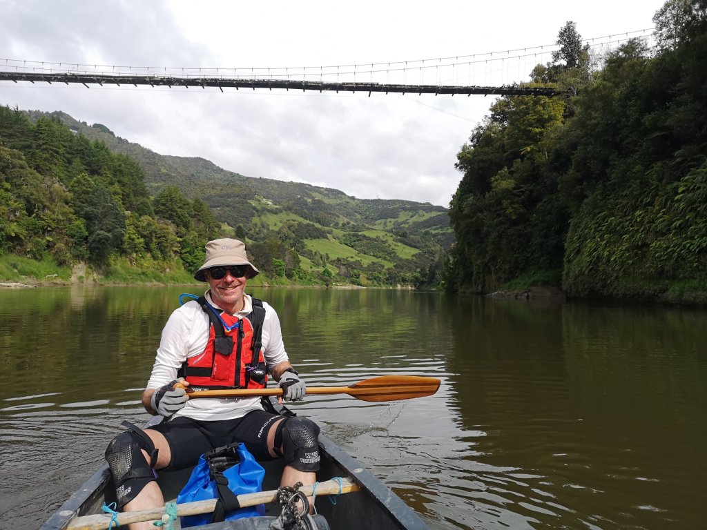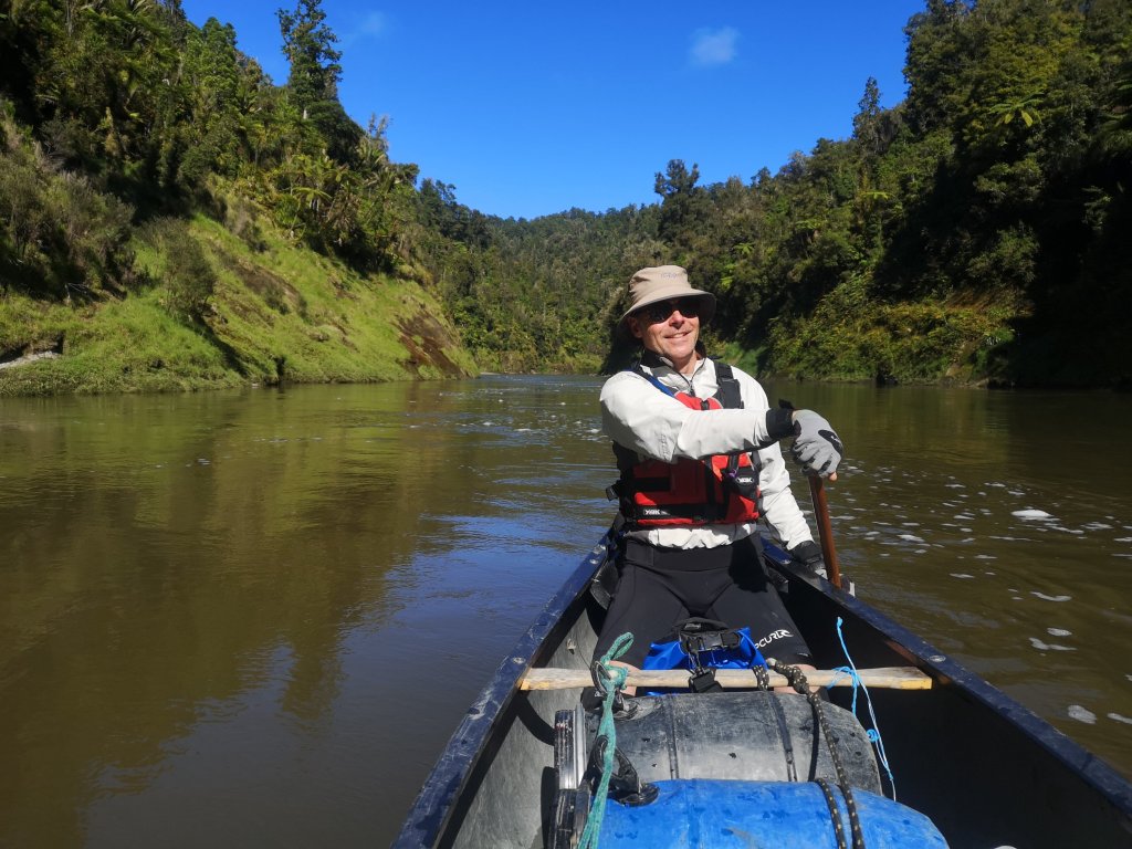 Iain pulls on all his own boat gear. He wafts around the beautiful wooden paddle he’s crafted himself over the past few months. I can’t help but laugh. “Ready to go then, boat wanker?” He laughs back. He has lent me a purple spray jacket and a pair of boat shoes. Interestingly the boat shoes come with a warning; not suitable for use in wet conditions. We’re given a river map, a final check off of our canoe gear. “Do you guys want to wait or do you want to go?” we’re asked. Iain’s gear makes us look like we know what we’re doing. He might, at least. “Let’s go,” he says. We push off in to the Retaruke River. Iain in the rear, in charge of steering and me. I’m in the front, the so-called engine room. We christen our red Canadian canoe Bucket, in honour of our not quite matching bucket hats. We are Team Bucket Hat. This is the first time I’ve accepted Iain’s push for a name. I hope our Bucket doesn’t fill with water. Ahead the thick, fast flow of the Whanganui River beckons. We’ve arrived! At last! Finally moving, the journey underway. “Have you started your GPS?” Iain checks. I haven’t, I was too excited to start. I set the tracker, allowing people to follow along at home. It might be a kilometre short, I’m sure it won’t be the last I lose. The first rapids feel like hard work. Half a life time has been lived since I last sat in a canoe. It already feels the same has passed again since I last picked up the spade. A few waves ride over our bow but we stay up right and come out the other side. We drift in the calm waters of the now receding flood. “A bit of this, a bit of that, I’ll be happy,” I tell Iain.