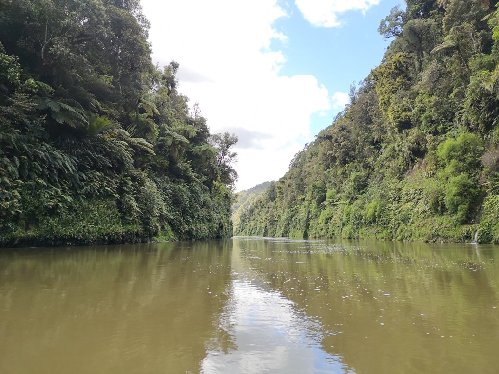 The river remains deep in a gorge. Ferns climb the cliffs, trees loom over the water. The sun shimmers white on the crest of ripples. A broken blue sky is reflected in the troughs. We are still blasting downstream. The canoe is heading straight for the gorge wall. I keep paddling. Iain hasn’t given different instructions. He knows what he’s doing. He must have seen the wall. We’re still heading straight for it. I’m sure he’ll bring us around. I keep paddling. We finally turn and I can almost touch the wall. I knew he had it under control. Iain’s skill keeps up straight, his strength in each stroke powering us forward. I suspect the extra length in the blade of his home made paddle is giving us some additional thrust. I feel at ease having someone behind me who I know, who knows what they’re doing. Tackling this with a stranger, competent as I am would make for a very different experience. As would lower waters. We’re gliding over the top of the majority of rapids. Ploughing into the V and pulling ourselves through the mess on the other side, barely causing a splash. Nothing we’ve come across so far has served any sense of peril. Rain would also change things. I begin to think we may have been lucky to have been stopped by the flood.