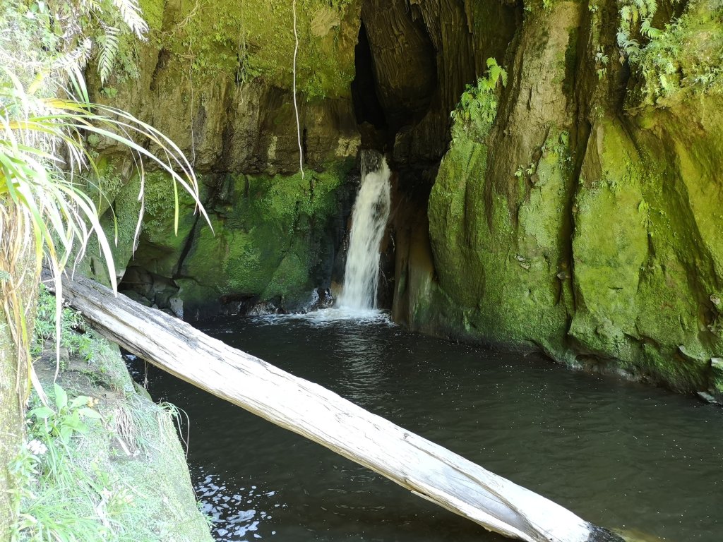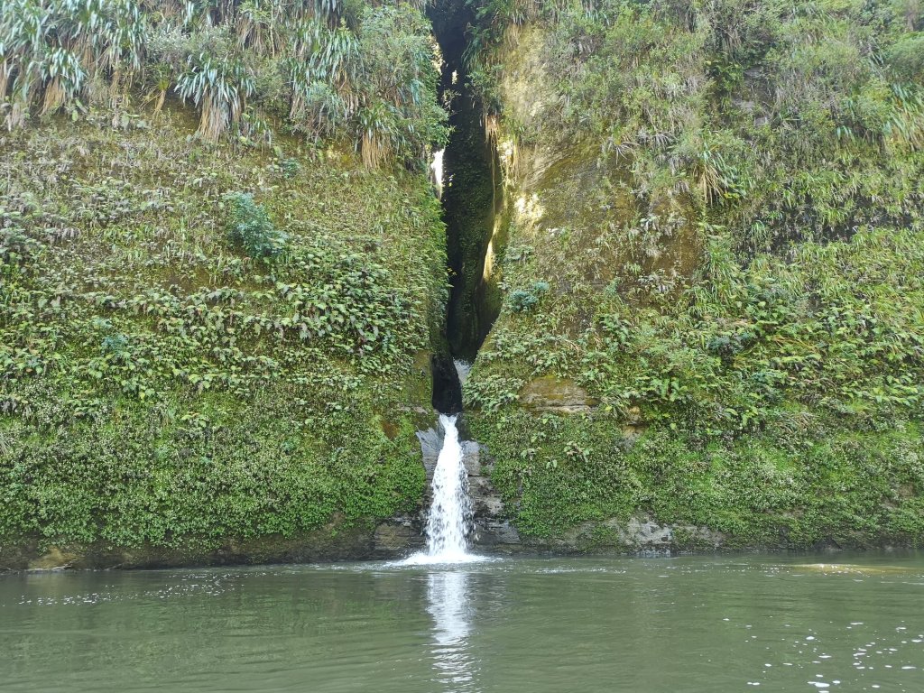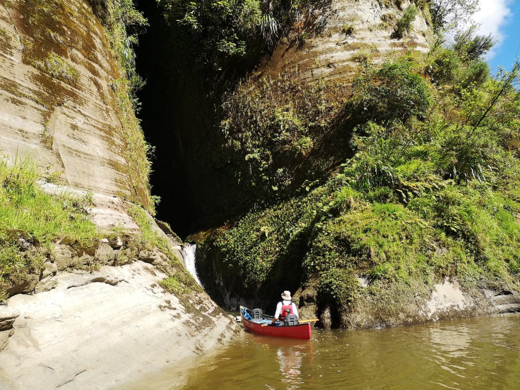Another canoe comes paddling past. It’s the couple who’ve had the huts to themselves. They look too relaxed for Iain’s liking. “Totally at the whim of the river,” he scoffs. They survive the rapids with apparent ease. I start to wonder if we might be working too hard. Briefly, someone else is ahead of us. A canoe adding something that isn’t Iain for scale to the broad river, the deep valley. They slow and pull out on a beach, raising the suspicion they were going to stop at Ngaporo but overshot. We race past only to slow again to investigate an overhang. Then we paddle back across the river to get a closer look at the roar of white water spewing out from the depths of the Puraroto Cave.