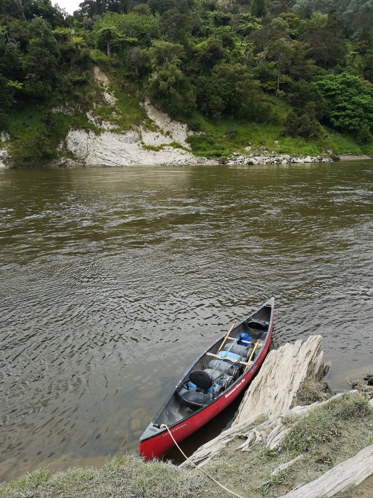 We agree we need to be on the water no later than 8:30am. If we can continue to make 7km per hour we’ll reach Hiponga Park by 13:30. High tide is around then. We can have lunch, wait for the tide to turn and ride it out to Whanganui. I wake up to the sound of rain. After five days, this is to be expected. The TA walkers arrived some time in the afternoon. They’re moving barrels down to the river before us. We have to wait for Kelly and Jane to pack us a lunch. I say have to. Want to. The others are still loading up when Iain and I get down to our make-shift wharf. Iain, with all the balance of a teenage skateboarder, wobbles back and forth bailing the rain water from the canoe. I film him for a while hoping he’ll fall in. I finish filming him because I’m impressed he didn’t. TA canoes one and two push off and we follow shortly after. It’s nice to have a bit of company. We flick between boats, sharing a bit more story. Bryan and Lisa tell us they capsized just after Jerusalem. The same corner we go wrong, they tell us the waves came over the sides and flooded them. Maybe not reading the map worked out for us. They stick together, not planning on going all the way out today. Iain and I have a pace to maintain.