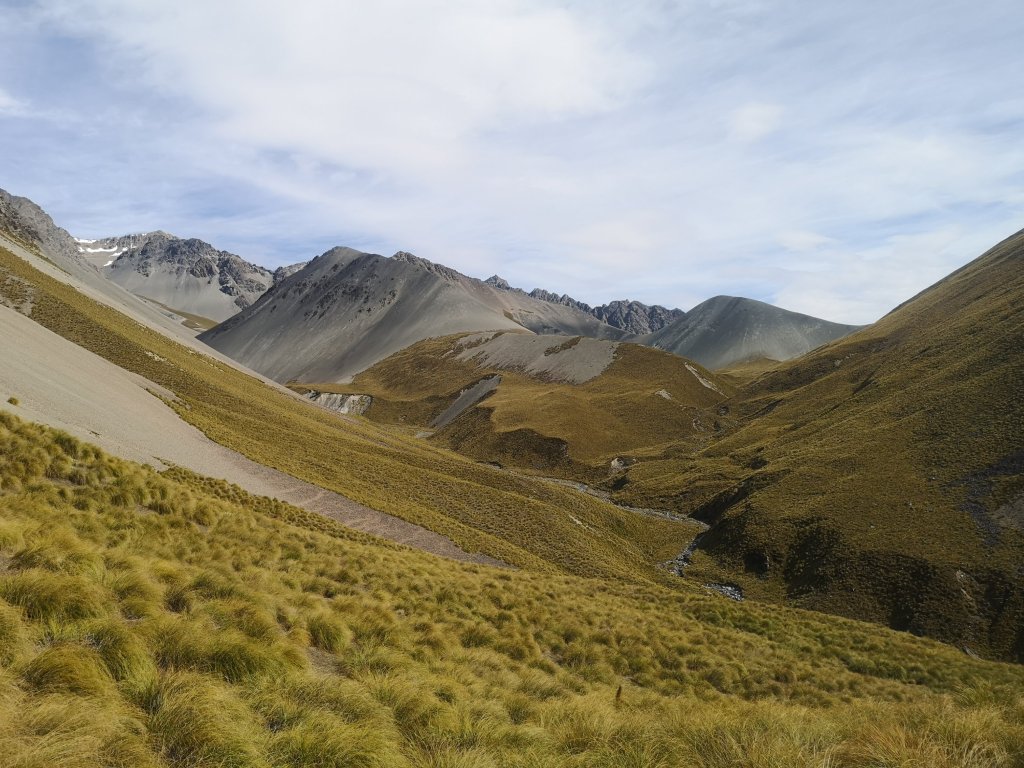 When I wake up, I’ve slept. My stomach no longer cramping. Things are looking up. I’m back, baby. There’s another short day ahead. The older members of the party; Bryan and Paula, as well as new charges Marty and Old Jack, get up and leave early. I suspect they’re on the hunt for bottom bunks at Royal Hut. I find we’re still carrying Lisa with us. Marty asked what happened. I retell the story. Someone else might remember a joke shared. A story she told, or Quentin and I, just taking the piss. By now she’s home. The trail she’s walking the one to recovery. Jack, Quentin and I are hardly late too start. We’re on the tussock climb towards an unnamed saddle before 7:30am. Jack shrinks to the size of an ant. Quentin stops as frequently as I do, sweat already pouring down our faces. Once we reach the top the rest of the day is all downhill, apart from when it’s not. The desert brown tussock drops into oases of crystal blue streams, foaming white into ankle deep pools. Quentin and I have a brief discussion about the location of Bush Stream. “It’s this one,” he says as we drop again. “No, it’s between those mountains,” I claim. “Not possible,” he retorts. It doesn’t actually matter but I was right. We follow Bush Stream for most of the day, breaking as often as every 2km. No rush after all. A couple of Noboers pass. A pair of hunters rove acorss another spur.