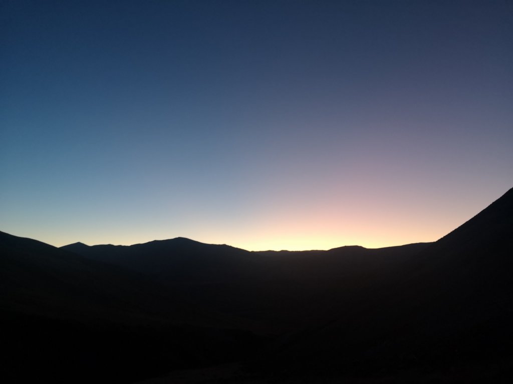 “Hey Chris is it 4am bro?” Asks Jack. “Yep.” I’m already busy stuffing away my sleeping bag. “You should wait until the alarm goes off,” mutters Quentin from the other top bunk. “It has gone off,” I tell him. “You should wait until I’ve heard the alarm go off,” he replies. I flash my torch in his face. They’re both still ready and out the door before me. White beams of torch flare across the valley. Still spots of light show the reflective tops of the marker poles. I lose the trail. “Don’t follow me,” I tell Bryan. “I don’t know where I’m going.” He takes the lead. Paula coming through behind. Black skies begin to shimmer purple and blue. The golden glow of dawn ripples over the mountain tops. Can I make it before then sun comes up? The top of Stag Saddle is only 4.5km from Royal Hut but it’s a long way. From the first high plateau I can see the trail stretching out. Two torches still waving ahead. Keep moving. Each meter gained in distance, in elevation, is a meter closer to coffee, to breakfast.