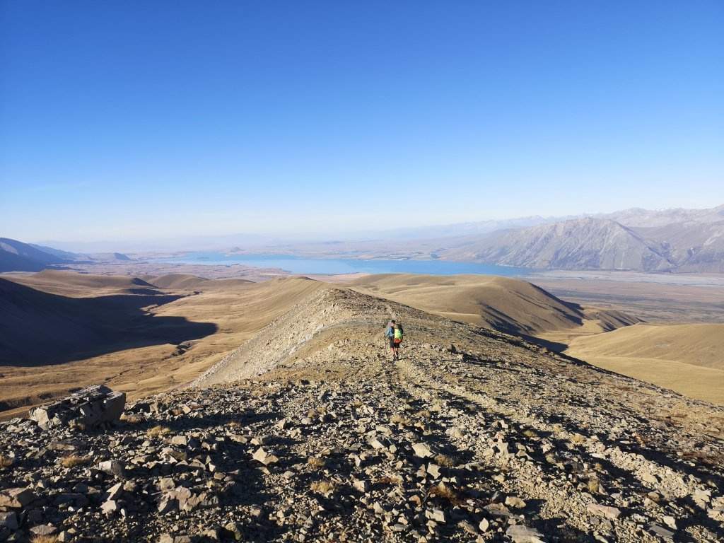Jack and Quentin already have cigarettes hanging from their mouths, mugs of coffee in their hands when I make the final ascent. There’s the usual whoops and cheers, and I’m smiling as I crack the saddle. Lake Tekapo spills like silver in the distant valley. Behind me the sun has already begun to highlight the Canterbury Highlands in yellows and gold. I set to getting my stove out for breakfast and coffee. Bryan comes up next, he runs the final few meters like an Olympic sprinter only with hiking poles held up high. We all savour the spreading light. “Come on Paula,” we say to the sky, “make it before the sun.” She does, just. We chill with out hot drinks and warm breakfasts at over 1900 meters above the sea. I still can’t quite believe I’ve walked this far from Whanganui. We don’t take the nude photo Bryan and Jack had been excited about. Nobody even mentions it. Marty comes up as we’re ready to leave. “I’m not sure how you did that in the dark,” he says. It’s like anything else, one foot in front of the other. We move off the saddle, off the trail and climb a little higher on to the nearest ridge line. A little bolder hopping has us on a scree field, a well walked track has us on the ridge top. The views get even bigger. Sheets of snow draped over mountains of furniture. The square top of Aoraki in the next valley. Along the entire length of the ridge is a wide and wonderful track. Quentin still hasn’t come up, struggling somewhere in the guts. “What are you doing down there?” Jack bellows. He still manages to pop up on the track way ahead of me. Camp Stream Hut comes fast. Marty comes out of the “marked” trail below the ridge to advise there isn’t one and to definitely not go that way. Lucky for us none of us did.