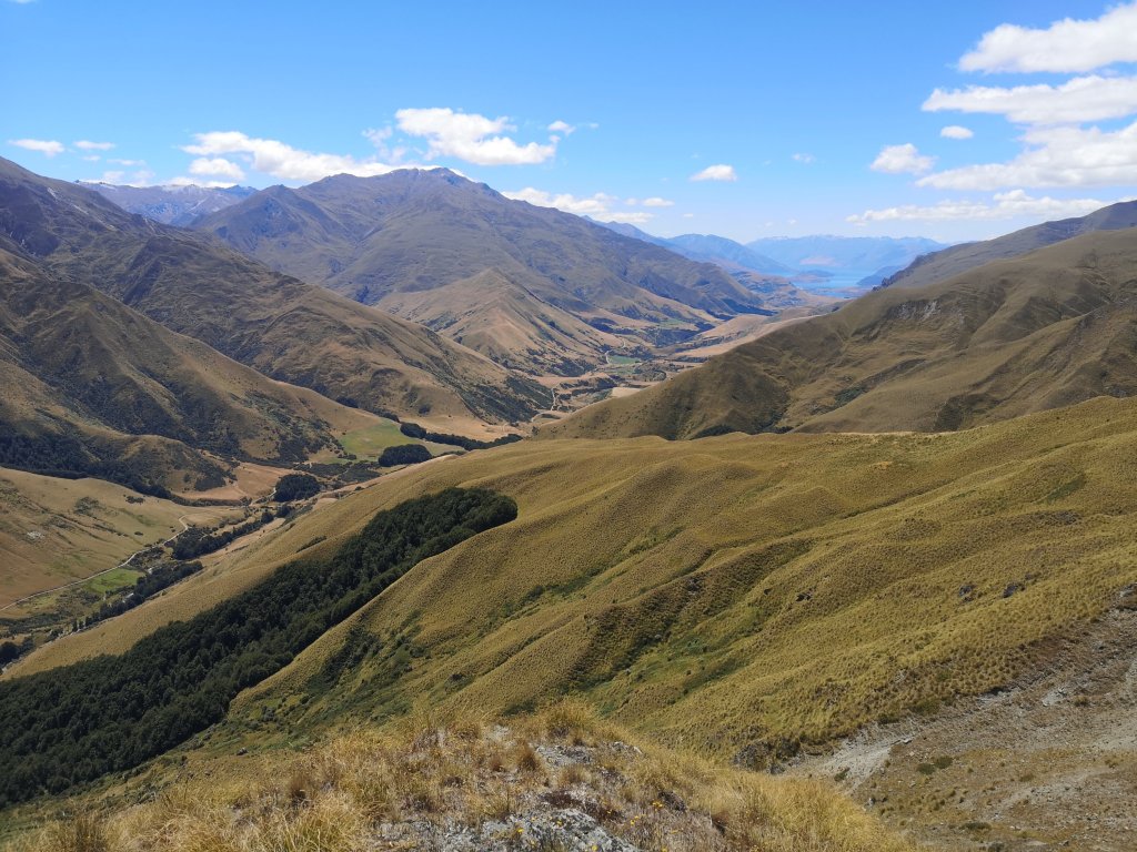 The trail continues through the campground but perhaps it shouldn’t. We reach the end of the site instead of hitting the road. The Te Araroa marker is on a signpost on the other side of a locked gate. Luke tosses his poles and rolls over the top bar. Bryan climbs over one end. I climb over the other. As I drop on to the far side something catches my pack and draws out one of my water bottles. It falls, and rolls, straight under the gate and down a small slope. I have to make a return trip to fetch it. The gravel road connection us to the Motatapu Track shimmers in the heat. Beyond the carpark and on the trail proper, I spot something wonderful. The tall, dark greens of beech trees. The promise of shade. The three of us are quiet near a little stream and listen. A little birdsong, the gurgle of water, the silent fall of leaves. Luke claims it’s only another 3.5km to Fern Burn Hut. That sounds good until the track begins blasting up hill, away from the creek, beyond the shelter of trees. The heat rises. The track pushes on. It’s a long 3.5km in to Fern Burn Hut. A busy hut too. Three teenagers who are adequately entertained by Luke. Not Really Nobo Tobi, who’s just cruising. Using the trail to take him to side trips he’d seen when he came southbound last year. There’s a school teacher and her son. After us someone else arrives. The sound of greetings on the deck. It isn’t even hard to believe that Kris has caught us again. Three becomes 4. The growing crowd and increasing noise inside sends a few of us on to the deck. Kris cooks her dinner outside, she’s got hard-boiled eggs. I keep missing this trick because it’s another job on top of all the others I’m not doing. She generously offered me one to add to my own pot. The hut reaches capacity when another Southbounder, Izzy, arrived with her sister Cilla. I don’t put earplugs in that night. I’d fallen into the trap of thinking young ladies don’t snore, forgetting our Waiau experience with Lisa. It doesn’t stop me sleeping. In fact, when I wake up in the morning I’m ready to hike. Let’s get into it!