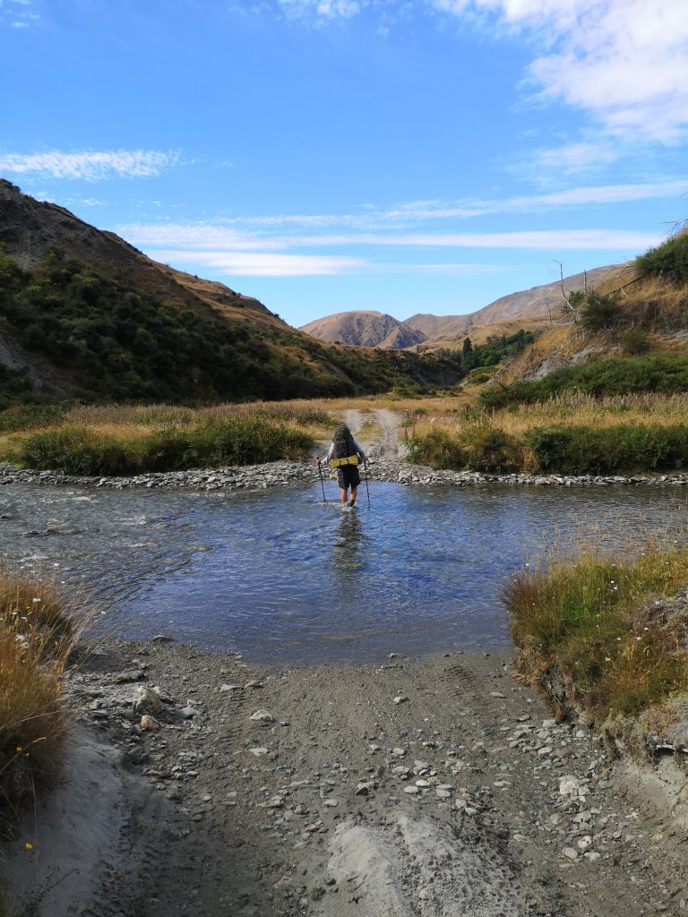 In the morning Izzy and Cilla have pulled on jumpsuits with sequinned cuffs and whatever the leg equivalent of a cuff is. Izzy explains she’s been carrying them the whole way, they’ve come out on special occasions like Christmas, and New Year, and today, Cilla’s last day walking with her. Then she tells us they’ve owned the sparkly suits since they were 5. There’s an equal amount of shock and surprise they still fit. I’m last to leave again in the morning but never last to summit the first saddle. I suspect things may be different if Izzy was alone. I don’t have to wait long for them at the top, taking a photo for them so there’s evidence of the sequins at work. “I’m so proud of you,” Izzy says to Cilla as I leave the saddle. Fair play to her, she’s kept up with us nearly fully seasoned thru-hikers. I drop off the saddle like a stone. The low water route is the river. An easy choice. Sheets of glass, cold as ice flow down the Arrow River. I pass banks of sand soft as silk, cross slabs of schist. Polished boulders of rose quartz dazzle below the water. After a while my feet disappear. I can’t feel them, only the gravel entering my boots. I start to find wet sand printed on rock, others close ahead. I sniff out the trails along the banks, cutting meandering corners. Matagauri thorns snag and tear, but I still move faster through air than water. Up ahead Bryan and Luke are moving through the river together.