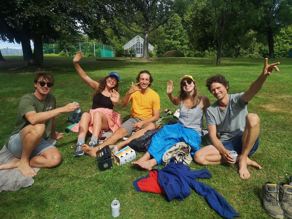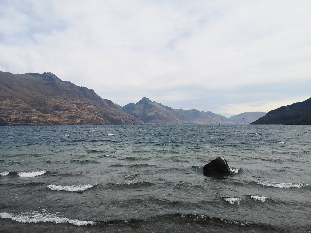 I continue on to the old Shotover Bridge. A woman stops me to tell me I’m off trail. Not according to my Blue Dot of Destiny, dead on the Red Line of Fate. “Go back down there,” she says. I’m not going back anywhere. Those steps are done. I pass through the delightful sewage plant, the industrial estate and arrive at the biggest Pak N Save I’ve seen in months. My empty pack becomes full. I slow all the way down under the half way day increase. I target Frankton Beach for lunch. Another golf course? If the public ever let me have a turn at being in charge they’ll be the first to be rewilded. Then the retail parks. Then the cities. I’m caught off guard when Luke comes up behind me. “Are you lost bro?” I ask. He’d stopped in Frankton to sort his own resupply. On our final approach to Queenstown we’re accosted. Aaron and Rain come running down the hill and ask “Are you guys walking Te Araroa?” We are. “Come and have a beer with us!” Luke had a shuttle to catch. From here he’ll be a day ahead of me. Another, probably final goodbye. I’m not going to turn down another free beer. I sit with the guys, their other friends. We talk of the trail. The highs, the views, the people. The lows, the loss of the trail family, the relentless roads in the North. I thank my single serving friends for their hospitality and set off to find my accomodation. I pass over soft sponge near a play are so sweet underfoot. People are everywhere on the still quiet for Queenston streets. On arrival at the Jucy Snooze, Bryan waves from his balcony.