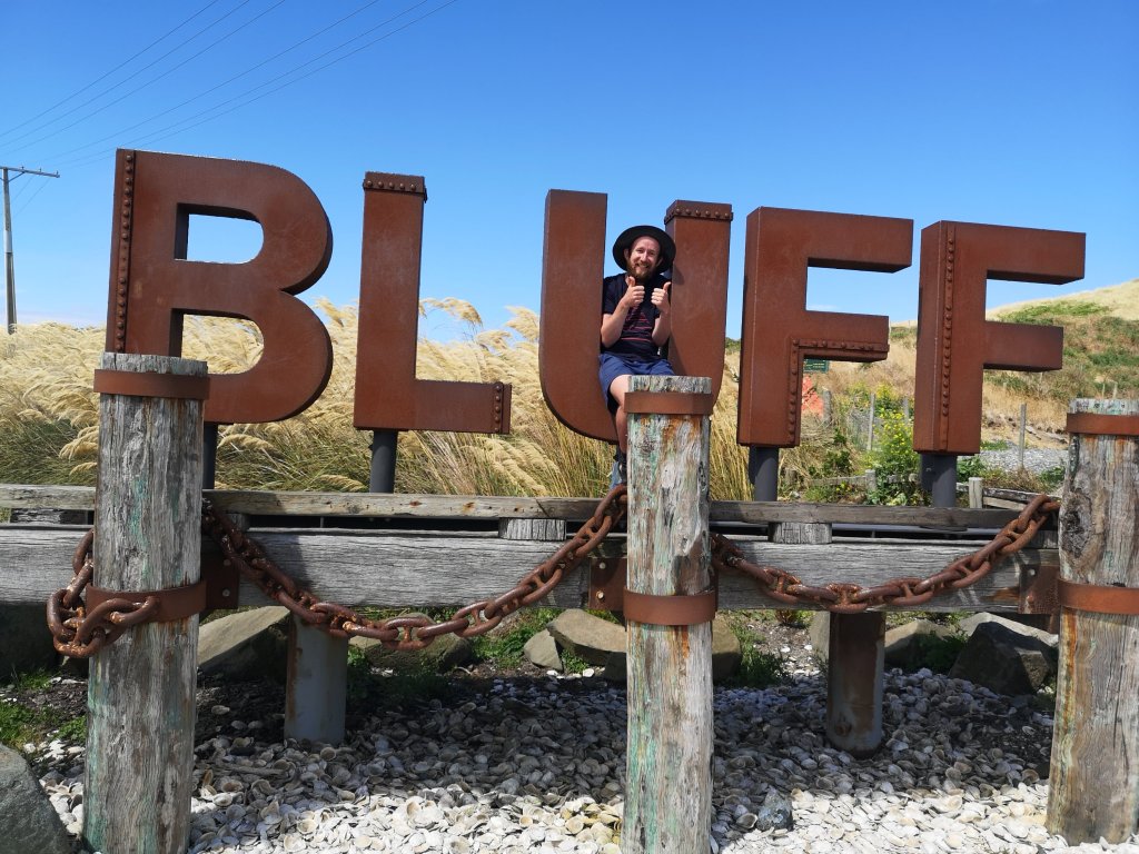 Tim kills my vibe, simply by being a person that exists. I pause the music. “Just started?” I ask him. “Finishing today,” he tells me. I have heard of him. He’s walked with Paula for a few days. He’s one of Izzy’s old trail family. I fall in step with him, as I have with countless others. We walk together for a while. The conversation the same. Are you going the whole way? When did you start? Any thoughts on what next? Tim keeps walking while I stop to apply sunscreen. The clouds have blown through. I’ve been walking beneath a window of blue for a while now. Chancing a little sun, still working on those lines. I watch as Tim shrinks with distance before disappearing around a corner. He’s admitted he’ll be cutting another, following State Highway 1 into town. I’ll be swinging around the back of the peninsula, following the trail. I stop at the welded, rusted steel letters that spell out Bluff. 7km to go.