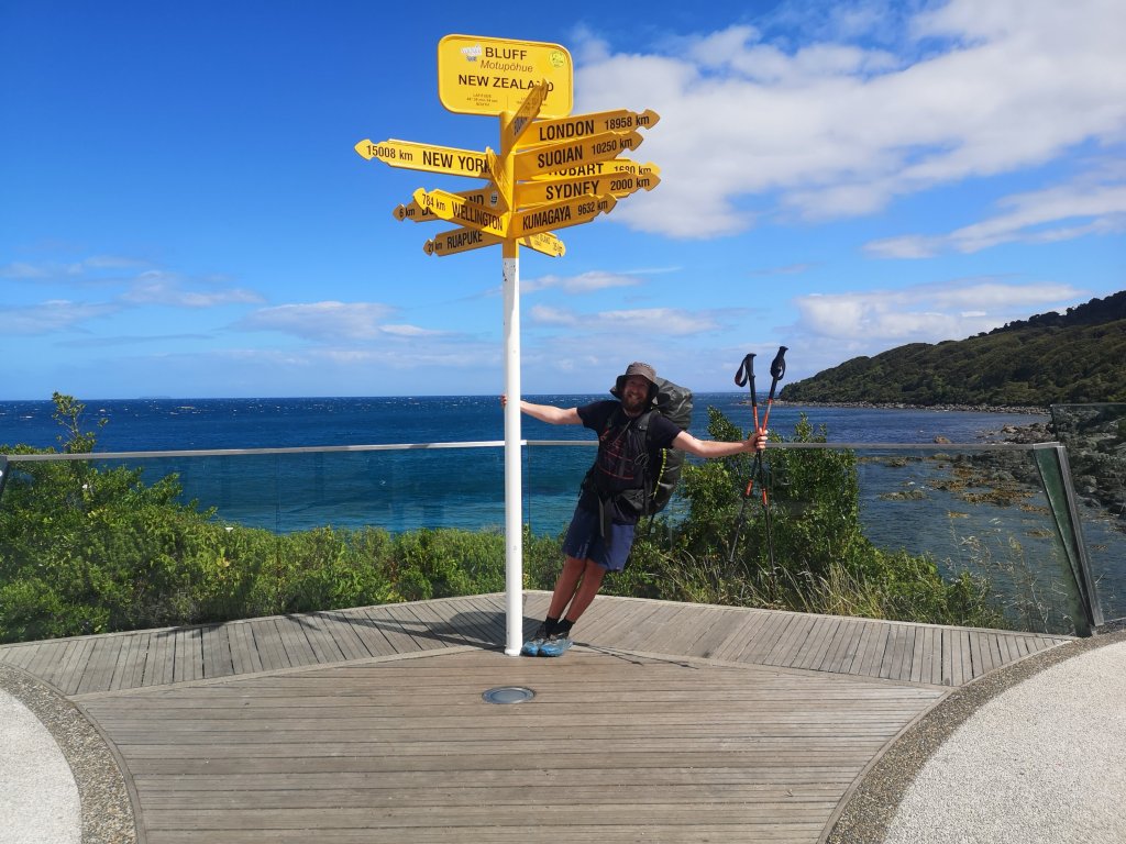 Paula isn’t far behind. We’ve come this far, sometimes together, sometimes apart. All the way from Palmerston North. Sometimes I’ve sent Northbounders to her with a message, “hurry up!” She lets me know most of them delivered it. We take a few photos of each other at the Bluff sign. The trail comes off road and into private farm land. Cows stand and watch us approach. Not until we’re almost within touching distance do they opt to get out of the way. There’s a small section through the bush. The track becomes a footpath, then wide enough to drive a truck down. There are more people present. Some stop to ask where we’ve come from. Paula, from the Timber Trail. Me, from Whanganui. A few other tourists await at the yellow AA sign post. The unofficial end of the trail. (The official plaque is understated, below the knee, past the car park). We take another couple of photos. Paula and I celebrate our completion of the South Island by eating all of the carbs and none of the fish at Oyster Cove. Then we walk another 3km to the Bluff Lodge to plan a little holiday from this here walking thing by doing another walk on Stewart Island.