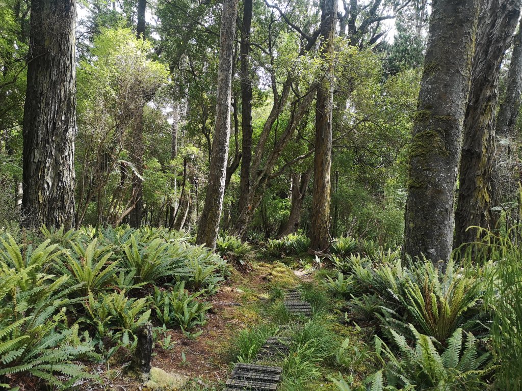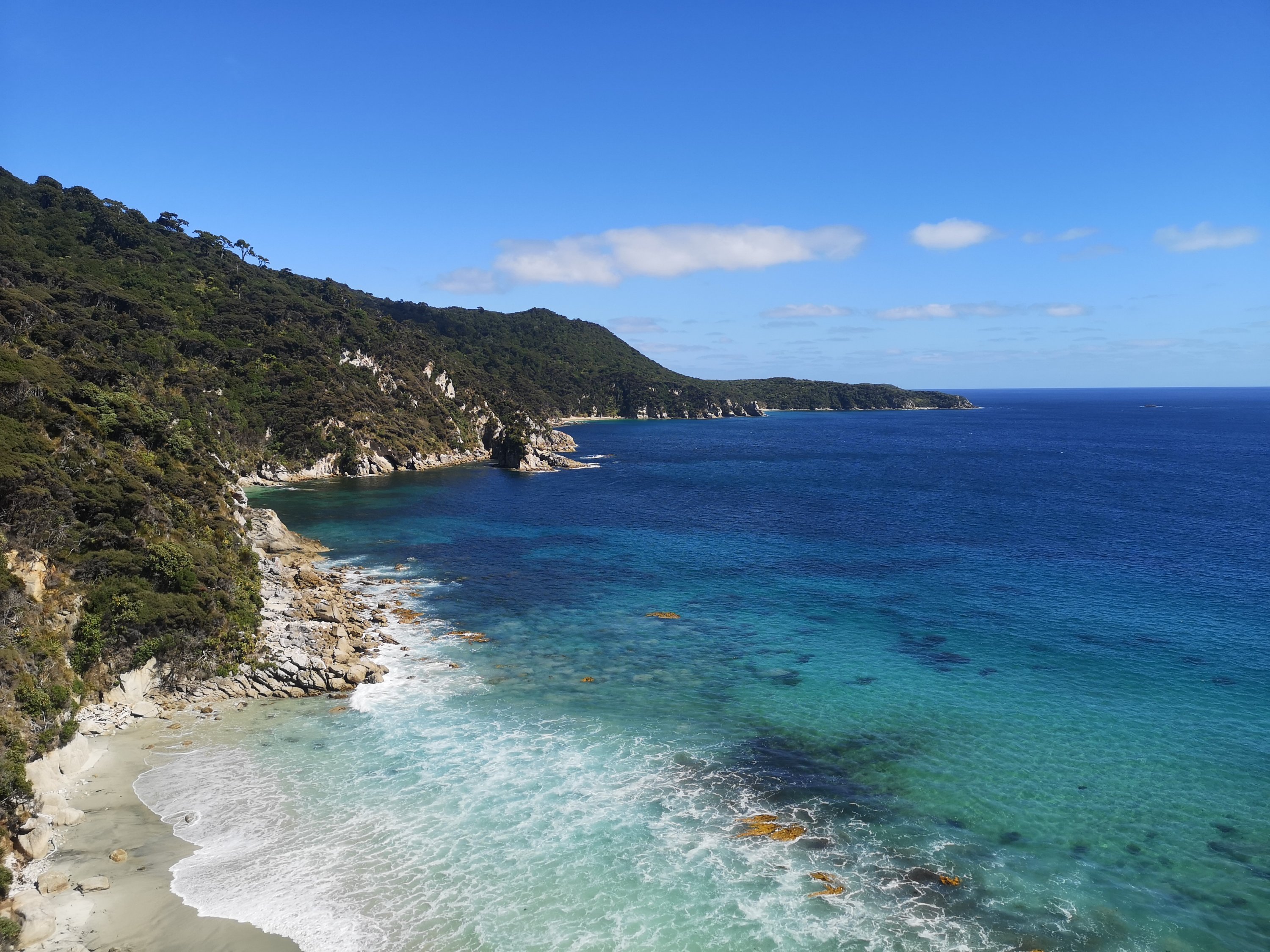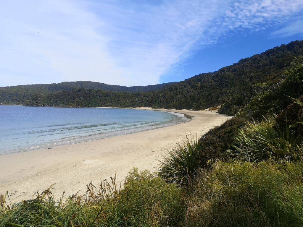 I walk with Paula the next hour to Port William Hut. We lunch on the wharf, overlooking the inviting sea. This is as far as some people will come today, for us it’s an early break. Signs on the hut door indicate bed bugs have been found in the Great Walk huts. Deep cleans and fumigation has been happening regularly. I’m still relieved we’re bouncing over both. I take the opportunity to change my footwear before the serious tramping begins. I notice I’ve already begun to burst out of the side of my Altras. That’s going to pose a few issues, I was hoping to get from Cape Reinga to Auckland still before having to replace them. A problem for later. I step away from the sand, into the trees. The umbrella spread of ferns. The feathered iron bark and heavy drooping needles of Rimu trees. The snapped heads of supplejack vines. The podocarp forest making a wonderful change from the beech. There’s an occasional spread of boardwalk underfoot. Some of the streams are bridged. Surprise surprise. That’s two times the Department of Conservation information has been inaccurate to say the least. The canopy rattles with the chuckle of Kakariki, buzz of cicada. In the deeper bush there are big rustles in the fern beds. Too big, too fast to be kiwi. A flash of gold and bounce of white. Deer. The forest sings with the constant gurgle of streams and tui.