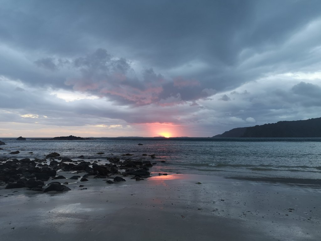 I remain in the bush until Bungaree Beach. Golden sands underfoot, turquoise waters in the bay. Old footprints march across the top of the beach. I come in to the empty hut. I hang my damp tent out in the breeze, in the sun on the deck. The hut tank is empty. One truth from DOC. Once Paula arrives I set out to find water from a creek cutting down the beach. I like the idea of a swim more than the action. The day not quite warm enough. When I paddle I find the water even less inviting. To begin, Paula and I take a room each in the hope we’ll have the place to ourselves. Our hope doesn’t last. People trickle in across the late afternoon. Paula moves in with me, she talks the rest in to the other room. “My alarm goes off at 5:30am,” is all it takes. People claim the sound of the sea is soothing. Breaking waves shatter along the beach erratically. Give me a river. I’ll take the endless hum of a motorway over this. Ear plugs go in and I sleep through the noise. The sweeping red light indicates Paula is awake. Which means I’m awake. The courteous thing to do was to interrupt my morning, because I’m used to it. I shouldn’t mind really, I fell asleep at 8pm last night. I’ve had enough, not that I’d complain were more available. Sunrise threatens to deliver but never amounts to much. Neither does the rain, for now.