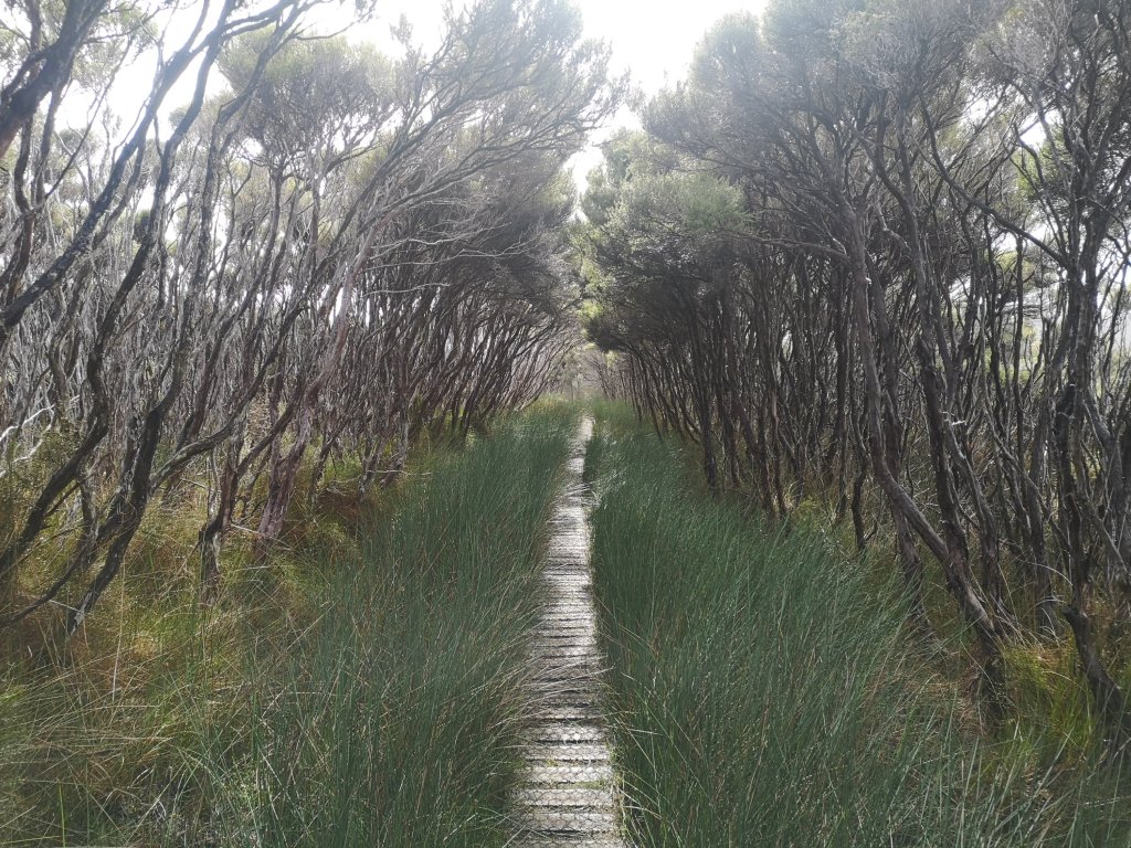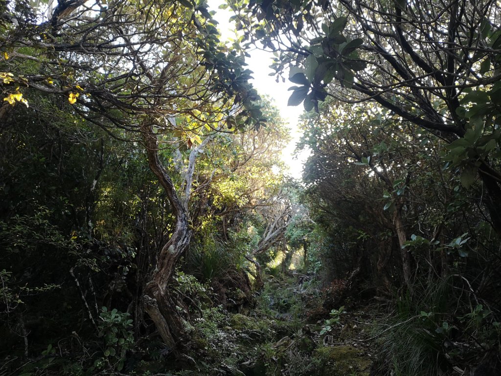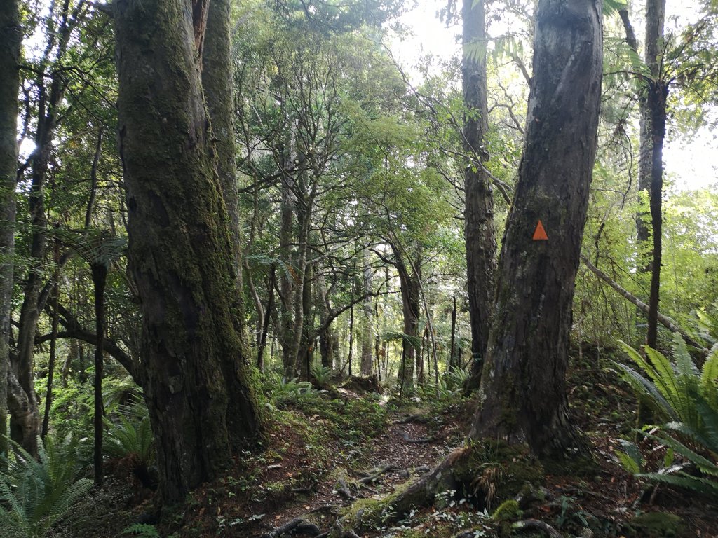 The hollows of heel and toe line the beach. Hard edges rubbed smooth by sand and sea. Heavy skies sit inland. Clouds build over the coast. From Murray Beach a boardwalk runs all the way through the near flat forest. I notice the trunks are thin, the track is wide. Untouched wilderness remains a stretch but at least decisions have been made to allow the bush to recover. As the terrain becomes more rugged I sidle around hillsides, through trickling stream beds. The forest glows stained glass green in the breaking sun. Deep gloom green comes as clouds cover the light. I come off trail to stop at Christmas Village Hut for lunch. Discarded pearlescent paua shells mingle with white and grey pebbles along another stretch of shore. Paula comes in and I set out again. From Lucky Beach I can see the soft from here mound of the Longwood range. Distant but still sharp, the edge of Fiordland. The prevailing wind here clearly from the North West. Shrubs grow in permanent limbo. I’d made the decision we wouldn’t take the side trip up Hananui. With the big day we were pulling, we’d be hitting 1000 meters of elevation without even trying to go up anything.