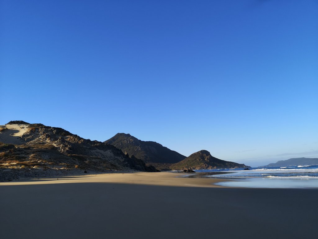 Stewart Island gives everything today. Golden sands, deep podocarp forest, rocky shores, and manuka scrub. Shimmering dunes, turquoise waters, white waves, and dark blue seas. Not a cloud, never a cloud. They’re all hanging out over the mainland. I stop to watch barreling waves break over a crop of black rock. A tor straight off the moors dumped in the sea. I leap across boulders along another beach. I was explicitly warned not to do this by the Department of Conservation. “You’ll find some of those boulders are two storeys tall,” she claimed. Maybe one of them looks to be bigger than a car. The rest, perfectly leapable and surprisingly stable. I’m starting to enjoy this sort of thing. After the beach I’ve one more hill to climb. Flax and fern have overgrown the track. Progress is slow, and then I stop. Staring straight down the track in my direction is a small whitetail stag, with needle antlers and batwing ears. We lock eyes. The animal unphased by my motionless presence. I take a few steps forward. Those big ears flicking towards me. Close enough I guess, as the golden deer takes flight, thundering through the bush. I make my way to the lookout over East Ruggedy beach. Nobody tells you about this place. There were no specific recommendations to come here. A line of jagged islands crawl back from the sea to join an inland range. Pinnacles of stone that wouldn’t look put of place along the Coromandel. A valley of golden sand dunes. An endlessly clear ocean crested with pure white waves. Down in the dune valley I’d be warned of quick sand. I don’t find any. All I find is painfully slow sand, soft powder underfoot. The last stretch to East Ruggedy Hut shifts a little to soil and I’m glad to be off my feet again.