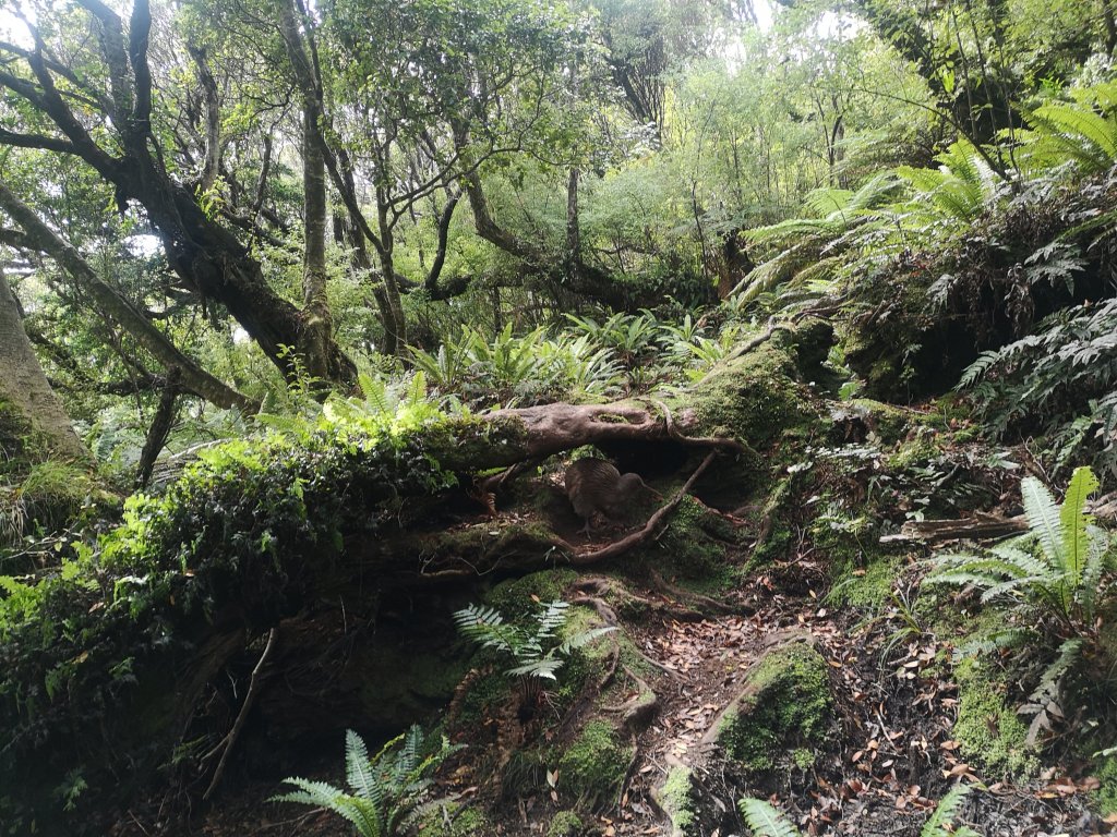 Along the ridge I catch and pass Paula. As I start the long descent to Little Hellfire Beach something flashes across the track. Was it a kiwi? Maybe nothing moved at all. There’s a tree stump. It’s 9:09am. It’s tokoeka time. Beyond the stump a kiwi rummages around ferns. I did see something dart across the open ground. Moments later, on the other side another! Paula catches me, assuming I’m stood on the bush edge to take a leak. I shush her with a finger over my lips. We watch for a while, until the kiwi decides it’s time to cross the track. In the open, aware of our presence, there’s a turn of speed before foraging begins again. A little further I can hear more rustling. I don’t see them. The female roars like an angle grinder. The male responds like someone who has lost several fingers in an angle grinder. I stop on the beach where Paula catches up again. At the end of the beach is the shark fin shaped hill that delivers us in to Mason Bay. A feathered bum wiggles on top of a fallen tree. It’s 11:52am, it’s tokoeka time. I’ve stormed into an unassailable 3-1 lead today. This kiwi potters about the tree trunk, having a look every where for snacks to haul out of wood and ground. I slowly approach until it moves back in to the bush edge. Paula might see this one too.
