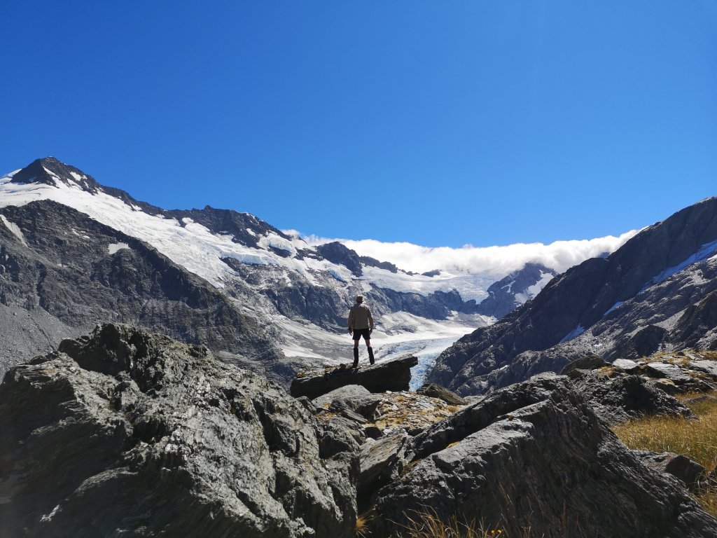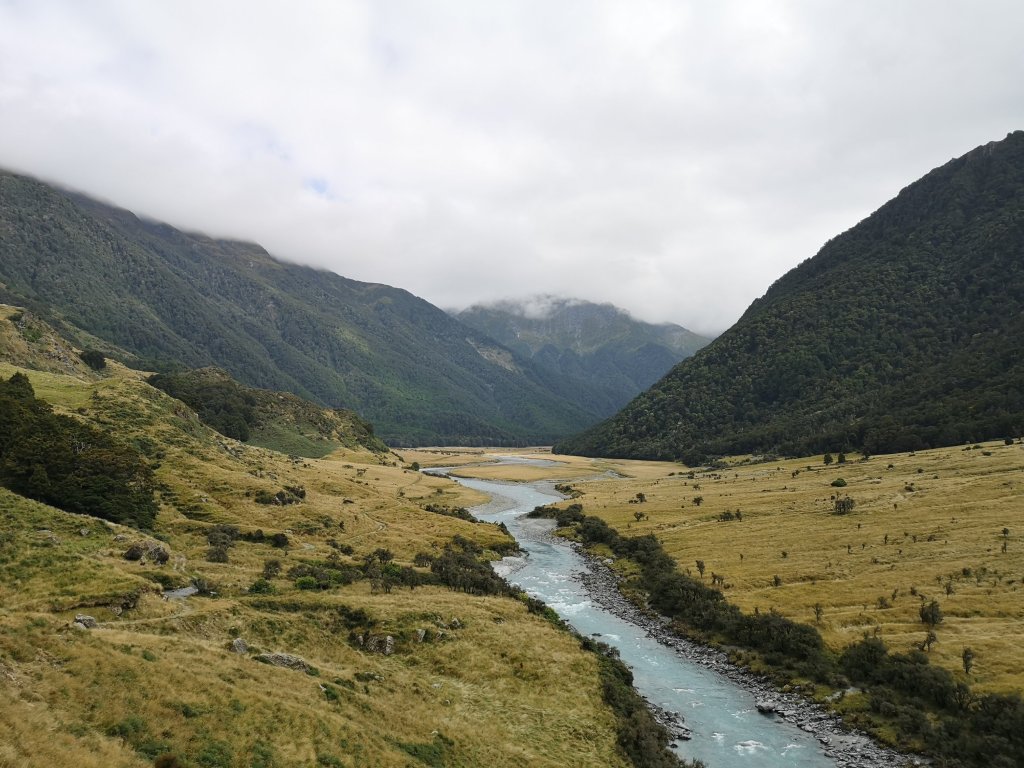 I claim to be somewhat acclimatized to New Zealand now. The mountains are big but they’re not oh my god big. Waterfalls were the first casualty. Oh look, water doing precisely what you would expect given the circumstances. Oh, another one doing the same thing. I’m glad to only have 9km on the flat ahead of us. Another rest day. Everything aches. I’m lethargic and largely disinterested in doing anything. You’ve been jabbed. The Matukituki River remains electric blue. Yellow grasses give way to green beech forest that disappear into low grey clouds. I point out to the others every opening window of blue sky. The cool mountain air warming up as the sun breaks free. It’s beginning to look like we’re going to get lucky, again. Aspiring Hut is further away than I’d like it to be and exactly where it is. It’s quiet, lunchtime is an early arrival. Under normal circumstances I’d suggest pushing on but there’s no need. Iain walks Charlotte back to the last fence line. She picks up speed, rapidly disappearing the way we came. He tells me it doesn’t feel right. First he delivered the dogs to a new kennel. Normally, someone would collect them. Normally, he’d be the one leaving Charlotte behind. This time he feels like he’s been left. I settle in to an afternoon of watching the clouds lift. Green of beech now turns to brown of grass. Grey of stone, blue of ice, white of snow, blue of sky. The world opens up. There are significantly worse places to while away an afternoon. Kea giggle through the valley. A karearea hunts the bush edge. A lone tomtit stalks bugs around the camp shelter