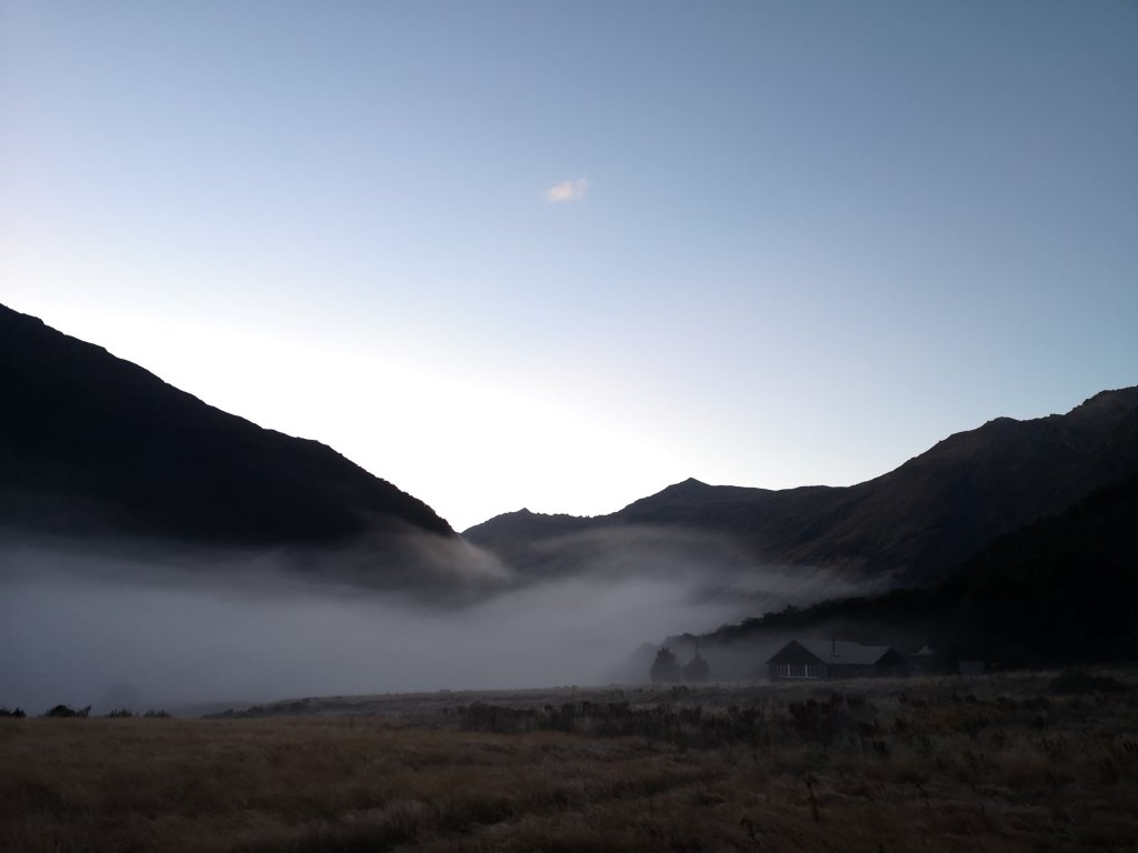 I drag a mattress into the sun and read while Iain naps. There is something in these half days. You don’t often get to sit in the mountains for an afternoon, soaking up the sun and the views. People begin to spill in. Pairs of men. A group of 6. Tequila comes out from the 50 to 60 year old lads lads lads. They are dangerously comfortable in each others company. One of them leads off on a story. “I was doing the Kepler in winter. Someone has left the windows open in the bedroom. It’s freezing cold. There’s these two sisters from Melbourne there. They’re nurses. ‘where are you sleeping’ they asked me. Over there. ‘Come sleep between us,” they said.” “Oh come on,” one of his mates jumps in. “We’ve all heard the nurse twin stories before, make it interesting at least!”. Later one talks about how beer is good for you because it kills your brain cells. “Obviously it has to kill the weakest ones first,” I am certain there must be some logic in there. Iain squeals like a possum in the night. The other man in the room is startled awake. “What the hell was that?” he mumbles. I genuinely thought it was a possum. Awake as I am now, I realise there’s no light in the room. No moon. The starscape outside is endless. Dots of light on a backdrop of dots of light. Another last for the South Island. The morning alarm is a kea. There are more of them than I remember. A promising sign. Iain tells me he’s got water on for coffee, then uses it for his breakfast. I admire his insistence on trying to be helpful at all times but sometimes I do wonder if he’d be more help by staying out of the way. He recognises I’ve got a process that works and sits down. The walk out is littered with half remembered moments of our first walk in anywhere together. The boulder field we had lunch at is too big, the boulders are too small. The vegetation has grown up. A slip here, a waterfall there. The park boundary comes up fast. We follow the four wheel drive track through the Rees. That first time a group of hunters advised us to take the river. We declined. Back then I’d crossed maybe no rivers. Now I was in and out of the Rees 5 or 6 times, each crossing comfortable, easy.