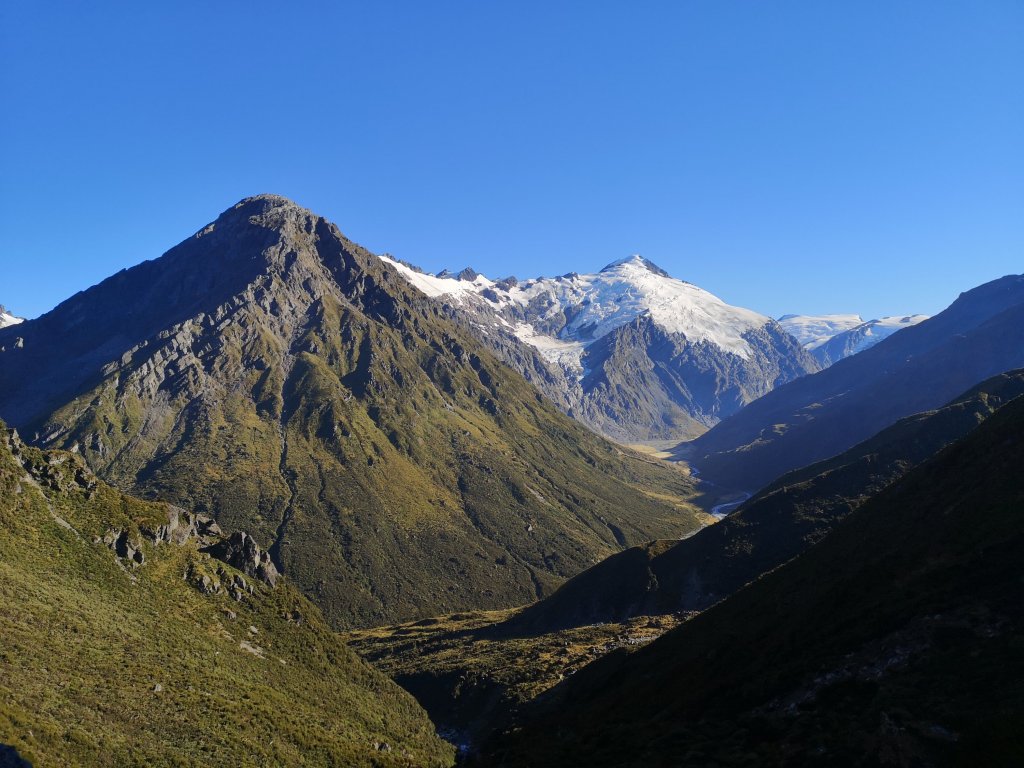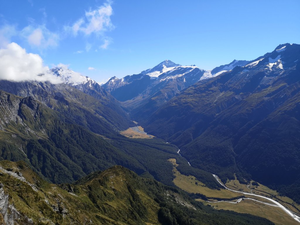 Mist has conquered the valley. The chuckle of kea lay distant still. A lone star burns in the rising dawn. For the first time, possibly ever, I’m ready before Iain. One of the many benefits of having been on trail for almost 100 days, or my stronger get up and go response having woken up in a tent. Either way we’re on trail by 8:30am. Just like old times. The couple who camped near us have left already. I could catch them but I have to remember that Iain hasn’t got almost 2000km in his legs. He’s not hill fit, although he assures me has done some training. I remain unconvinced some rowing on a machine is going to get him on to Cascade Saddle any easier. I know I have to be patient. There’s no rush. Instead of taking my time, I’ll need to take Iain’s time. Not that he makes it particularly easy, ending statements such as “this is a bit hard,” with “isn’t it?” For me, it isn’t. We started our climb in the beech trees. The Matukituki Valley spreads below us. Clouds gently rising in the warming morning. I’m left thinking this isn’t so bad. Not after everything that’s come before. We’ve been climbing for two hours when we reach the bushline. The campsite old mate Jack told me about is there. We might have squeezed two tents in. When the trees stop, the mountains open up. The top of the ridge looks like it might be forever away. Step by step, pole by pole, we close the distance. The ridge comes close. “What’s the betting that’s a false summit?” Iain asks as a final pole stands out against the sky. “Always,” I reply. We have indeed reached the top. Over to the left, first glance of the Dart Glacier. Below us, a vast alpine bowl with a toilet. The infamous Cascade Saddle campsite where supposedly 17 tents have been destroyed by Kea this season alone. We drop in to the valley and cross a river that barely registers above my shoe. I laugh every time I look up from the trail. The mountains are there, are everywhere. Iain says “I think we’d have been disappointed if we got up here last time.” I have to stop him there because it’s clear he’s lost his mind. Then, and now, the Dart valley remains the my favourite, my most recommended part of New Zealand. At no point do I allow him to elaborate, or explain what he might have actually meant. When we arrive at the saddle, I say “Come here boy.” He warns me not to be too insufferable. I simply gesture that he look down upon the view we didn’t get well over a year ago now.