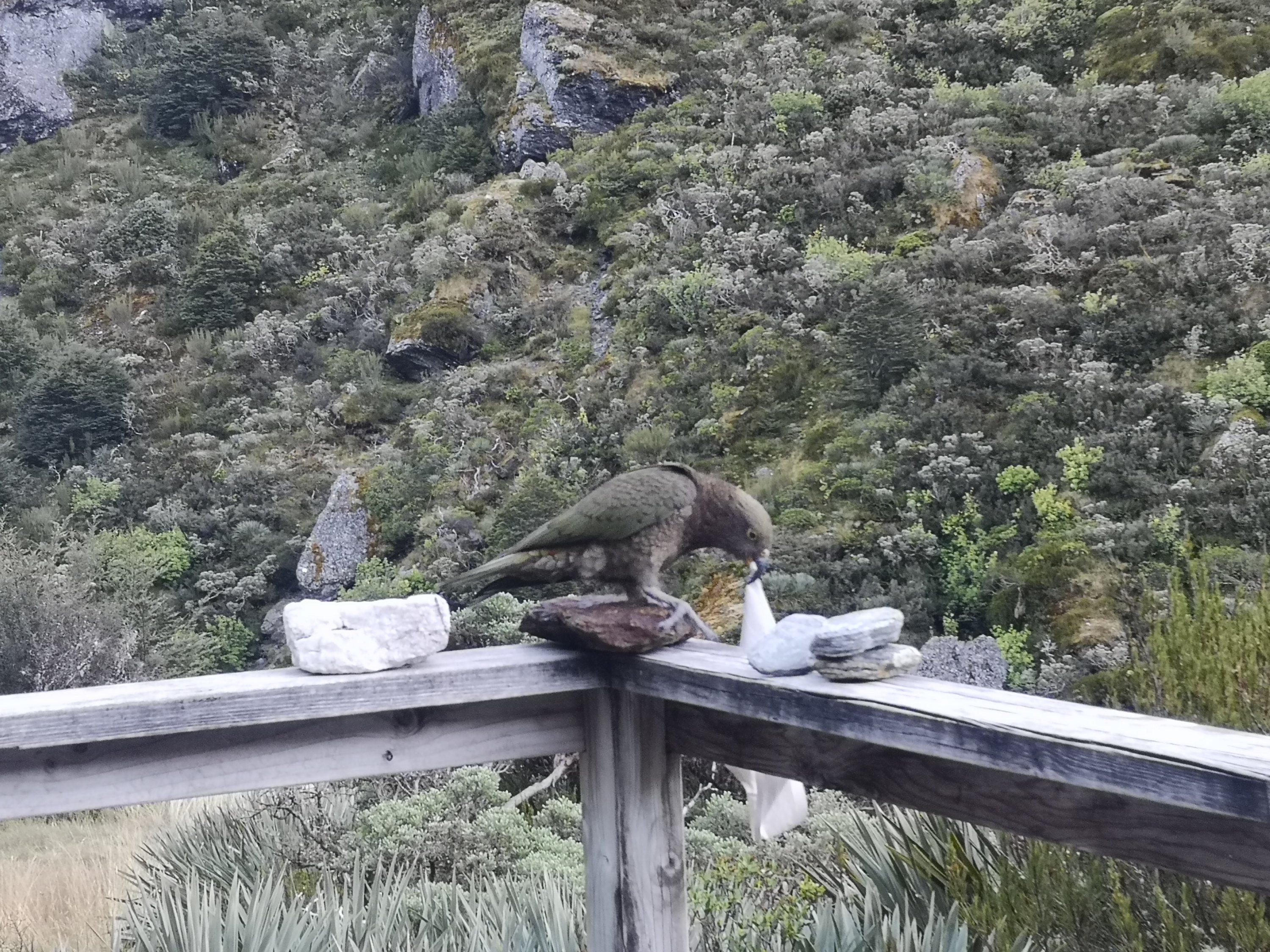 Things get off to a bad start. I throw my first coffee in the sink. The Aeropress makes a nicer brew, but instant is instant. Warden Gareth is in already, chatting happily away. A raucous bunch of Kea pay the hut a visit. One prowls the edge of the deck, knocking over the small rock cairns people have stacked there. A cackle of laughter follows. Ke-a, ke-a, ke-a. When the parrot frees a cloth from under a stone, the cloth knows no peach. A beak and talons shred the fabric in seconds. I can see how they would make short work of a tent in the night. The entertainment slows our leaving, not that it matters much today. The DOC sign says 4-6 hours to Shelter Rock Hut. A half day for me, a high chance of an afternoon’s rest for Iain. My GPS plays up again and I tell Iain to go and I’ll catch up. He does this faux-offended look and I’m like what? I will catch you. Things pick up and I set off. “What are you doing up there?” I ask Iain as he comes back down a stream. “I missed that,” he points to the pole I’m crossing the water to reach. He’s got no nose for a trail. He admits too, he hasn’t studied the map, which surprises me. I’ve watched him count contour lines, talk off the number of ascents, the mapped streams. “I thought I could remember.” His assumptions are letting him down. “Who left you in charge eh?” I challenge, knowing full well it was me who said it’s your adventure, you plan it. Snowy Creek is still in shade, we climb up alongside. The big, steep steps I remember crashing down are further up and don’t last half as long. Has someone fixed the track or have I gotten used to much worse?