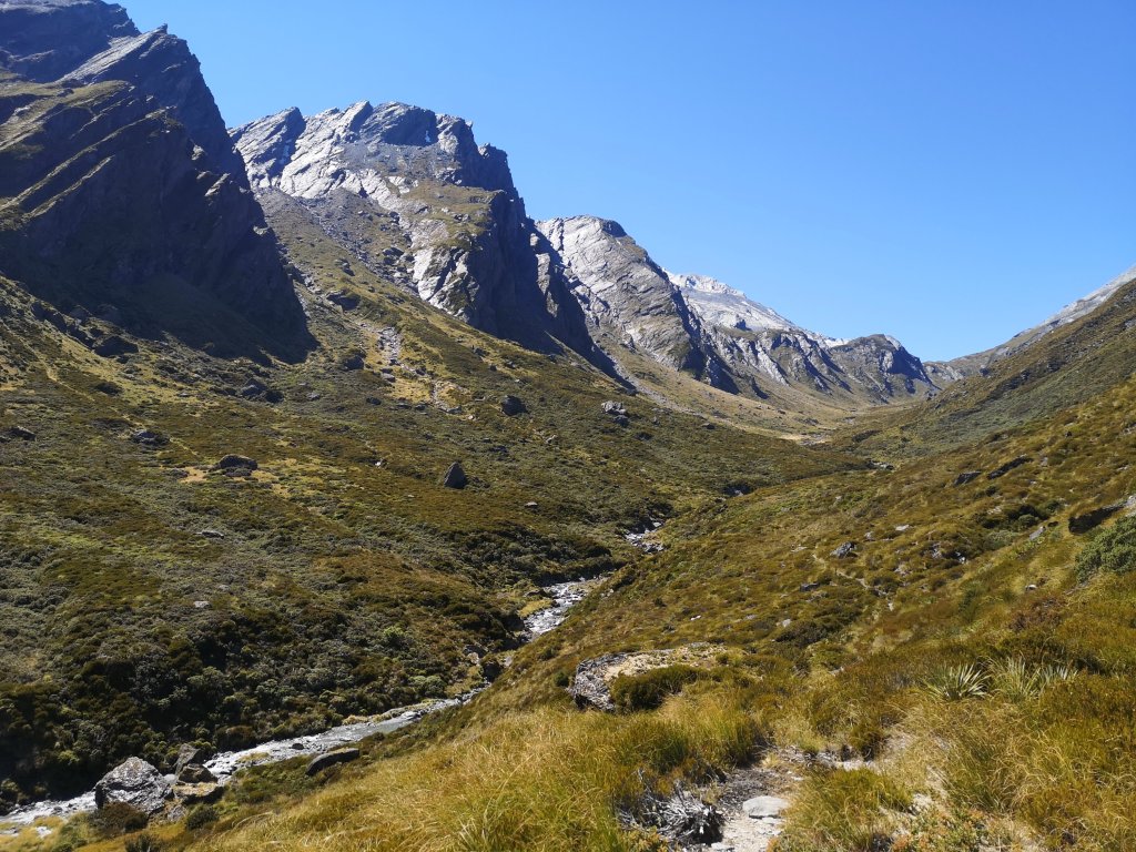 We reach the Rees-Saddle after two hours. This is one of those days when it really is all downhil from here. I trot up a nearby, considerably small summit. This is it then, the last of the big views in the South Island. Snowy Creek disappearing behind me, the Rees Valley unfolding ahead of me. The steep drop down from the saddle is over in seconds. I tell the woman I pass at the bottom it isn’t as bad as it looks. We stroll down the valley. A short walk but still longer than I’d like. I have so little motivation left for days under 20km. What’s the point? It’s not like you’re going anywhere. I declare we’re close. “My hut sense is tingling,” “how far?” Iain asks. “500 meters,” I state with the confidence of a man who truly believes in his made up superpower. The swing bridge is visible within that distance, maybe. It was probably closer to a kilometer. I insist my powers work despite the evidence to the contrary. “Was it close or not?” I ask Iain. He laughs me off. Shelter Rock Hut sits at some lowly 900 meters above the sea. The dragon scale valley wall rises to a ridge line of fierce teeth a further kilometer up. Mount Aspiring National Park is vast in both height and depth. A damp tent hangs in the empty hut. There is so much day left. I go for a wash and soak my clothes too. They go on the line to dry, and to attract bumblebees that still haven’t realised I am not a flower.