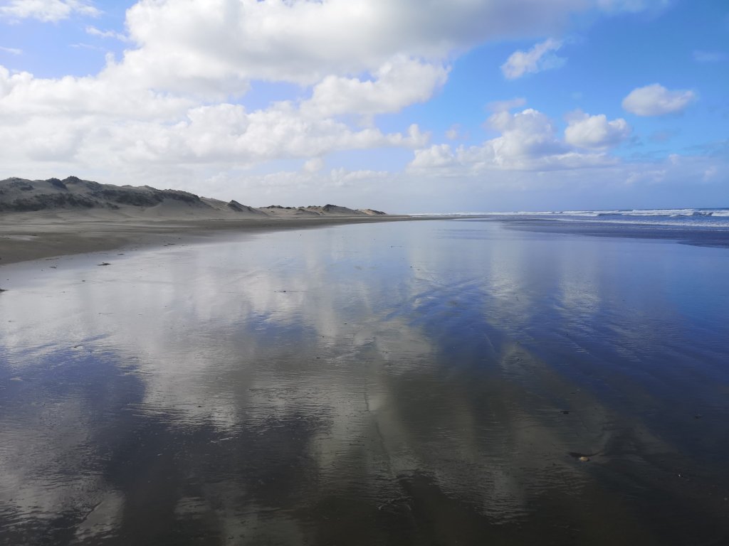 I get up in the night to pee. I stumble in the dark like a new born deer. Legs failing to do their one job. The stars are magnificent. The orange glow of Ahipara lies South. I crawl back in to my tent, reinflate my mattress and fall back asleep. The morning rain shower is a disappointing start to the day. Now I’ve got pack away and carry a wet tent. When I hit the dunes I slip out of my sandals. I don’t buy into many hippy theories but barefoot walking might be one I do. At least on sand anyway. The crabs I pass on the beach this morning are alive, crawling towards the incoming waves. The traffic is heavy. My left heel develops a hot spot which interests me because my right foot is usually the disaster area. I wash the sand off in the sea. Instead of a blister, the skin has cracked. I’ll have to keep an eye on that. The wind is kinder too me today, gusts at a minimum. As I approach Waipapakauri, light glints off the roof of parked cars. Black bodies bob in the dental fresh waves. One surfer tells me I’m almost there. Almost off this beach at least. Things start to fall apart after my second break. The balls of my feet have been tenderized by pounding on the compact sand. My right knee is squeaking, a sure sign of the almost imperceptible gradient I’ve been walking on for four days. Hot spots begin to tingle everywhere. Was this such a good idea? I stop again with maybe an hour to go until Ahipara. Plenty of day left. I don’t need to rush in. Nothing exciting awaits me there. The soft sand above the tide line I’ve been avoiding for four days feels like silk. My feet sink deep into the soft, warm ground. At the driveway to the Ahipara Holiday Park I have no choice to put my sandals on. The other option actually available to me is to walk barefoot on the gravel. Hard pass. The sandals go on easily enough. The soles of my feet surprisingly comfortable. The only pain is where the straps have already rubbed. I’ve not far to go.