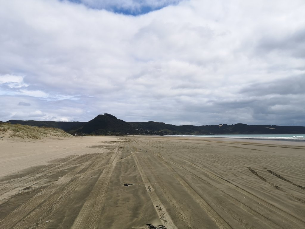 Showers continue to roll in and out through the night. The two or three hour intervals between waking up to reinflate my sleeping pad must be enough. I get up to hear the whinnying of a horse, the trotting of four feet across the ground. A small herd grazes on the edge of the campsite. I follow their tracks through the sand. I’ve got two hours until the tide forces me in to the dunes. If yesterday is anything to go on I should be a third of the way through my day by then. The weaving waterline disappears into the horizon. The wet sand sprinkled with shore birds. There is nothing now until Ahipara to break up the beach, another day distant yet. Waves drag higher up the sand. Headlights appear in the distance. The first car of the day flies by, releasing a cloud of terns into the sky. I see horses again on the dune edge. They stop grazing to watch me pass. I don’t hear the second car until it cuts inside. The flash of red makes me jump and then it’s gone. The sea never forces me in to the dunes. Never reaching as high as I’d anticipated. Though there’s still a chance I’ve got the times wrong, again.