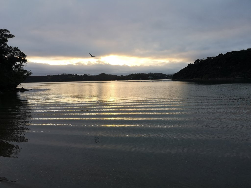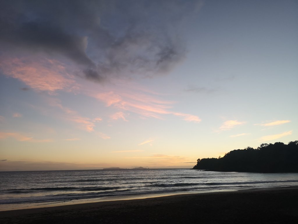 Dawn glows orange out East. The substantial breakfast truly is. Muesli and fresh fruit, followed by two poached eggs, bacon, mushrooms, potatoes. I could stay here forever, only I can’t. Ros rows me across the estuary, my timings for the tides being abysmal, and I’m on my way again. First up Kauri Mountain, which sounds like a Disneyland ride. It’s not a mountain, there are a few young Kauri trees. From the summit I get the view of what next. A day I’ve been waiting for, looking forward to since realising I’d be coming back this way. The white curve of Ocean Beach, the high rugged ridge of Bream Head. I’m mesmerised by the waves on the imaginatively named Ocean Beach. Translucent turquoise breaks into opaque white. Light dances in the water. I long to go in but I know today is a seriously big one. Distance, and that series of climbs at the far end of the sand. Te Whara Track is as I remember. A tough climb to the top. Anton described it as “South Island scenic and South Island steep.” Accurate. Once on the ridge the trail becomes a little more gentle. The infinite staircase down the far side shudders through my knees. I’ve still 7km to go so they really need to still be working once I get down. The roads of Whangarei Heads have this weird strip of concrete raised above and beside the tar seal. I think in some countries they’re called pavements, others; footpaths. New Zealand it turns out, has them to.