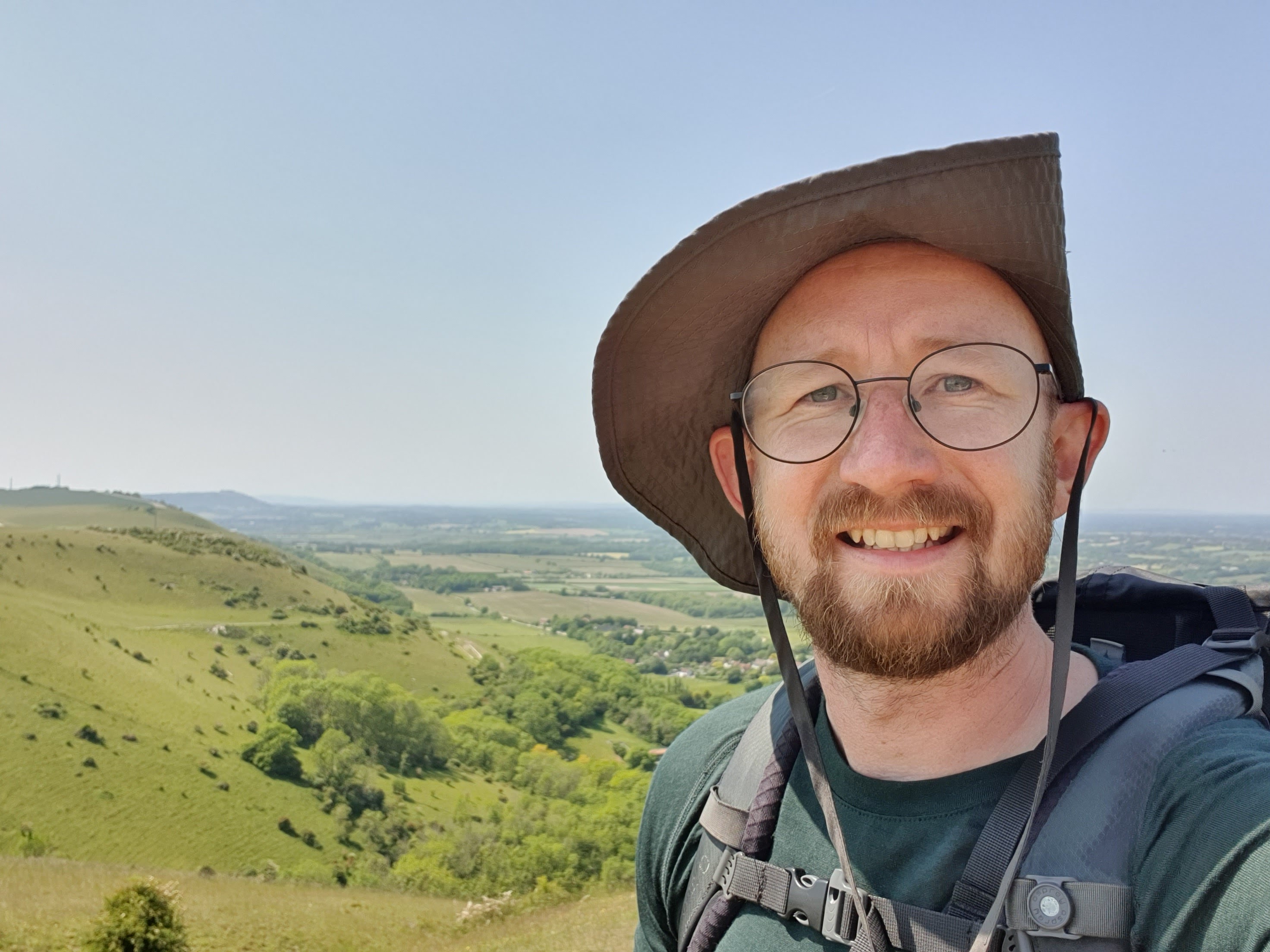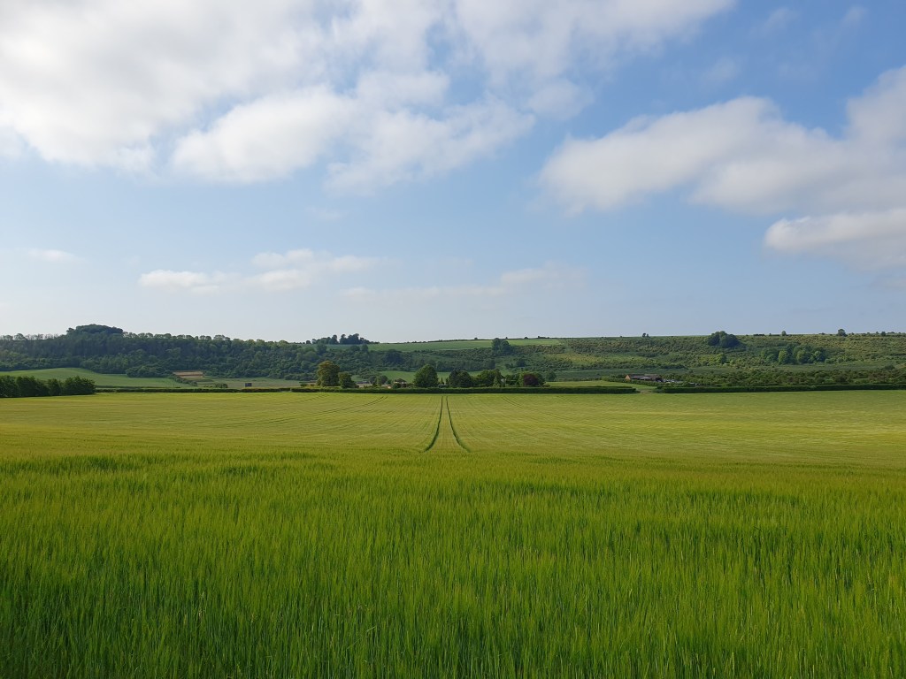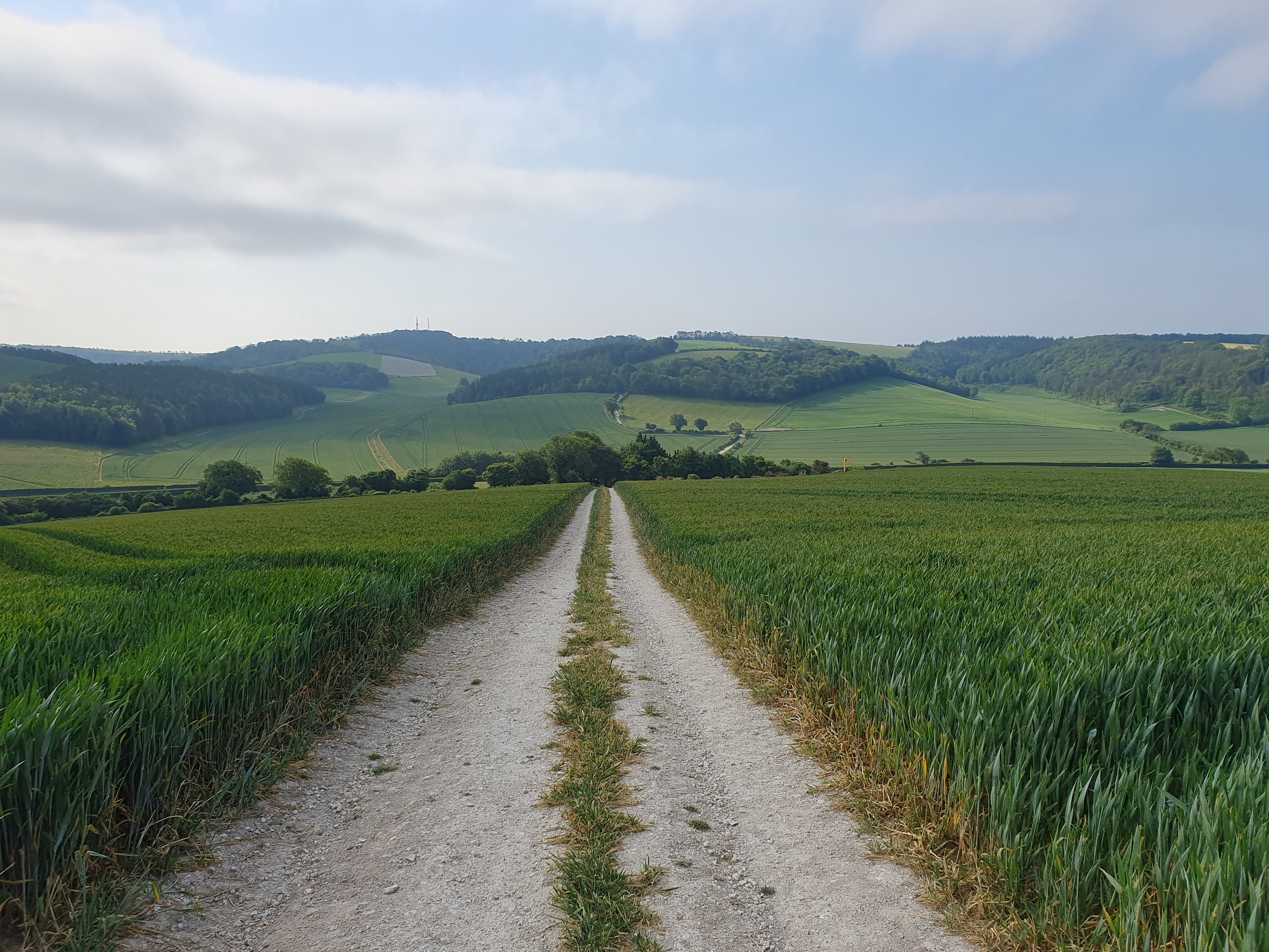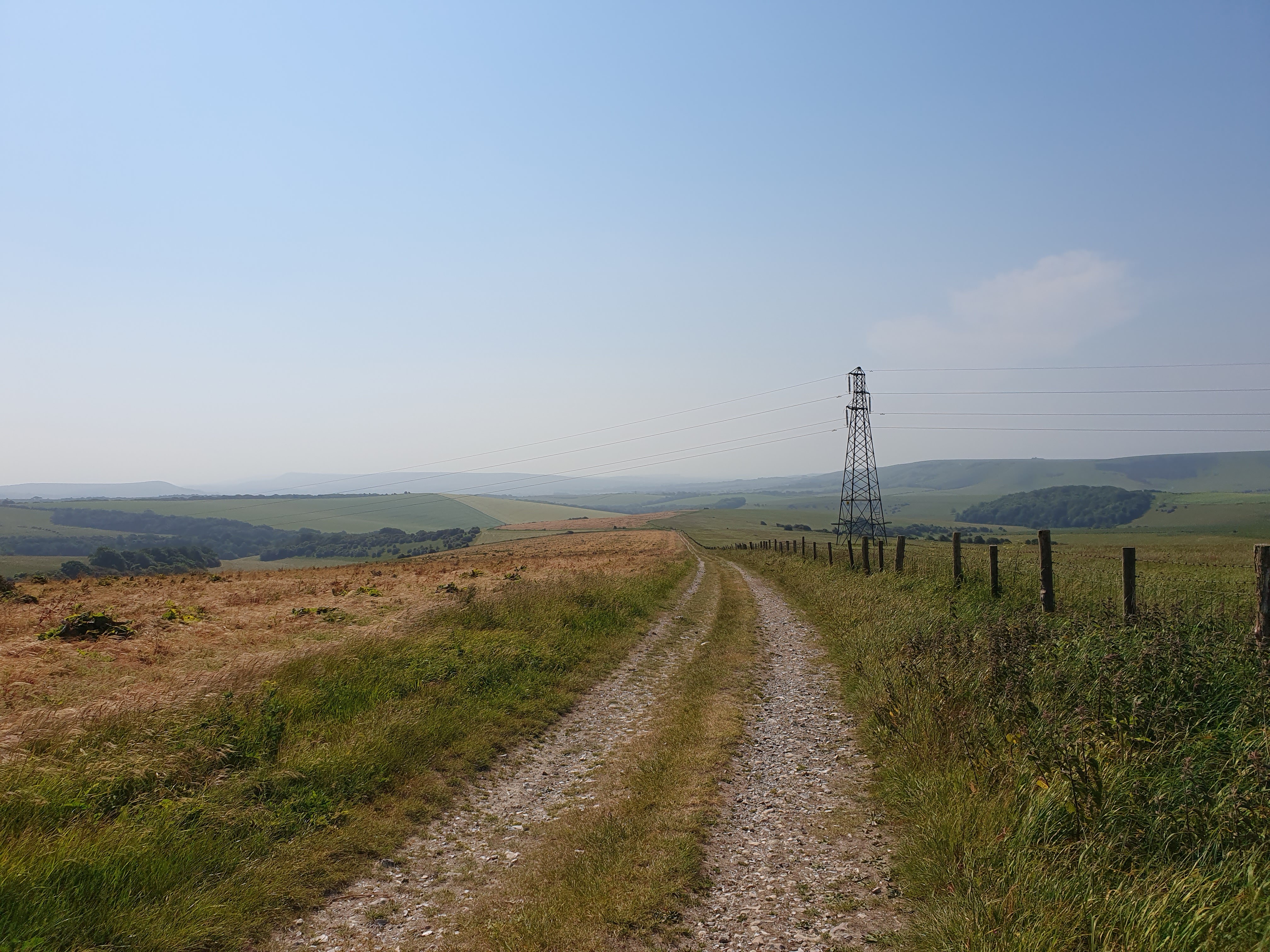 Sleep is disrupted by the homemade glue of sunscreen and sweat binding my legs. This really is going to be the worst part of wild camping in the hills. The limited access to water, especially at spots I’ve set out to overnight is going to make any standard of hygiene impossible. Already I smell. It’s been one day. I pack down and pull on my pack. Thankful, for now at least, to be carrying less water. I have to slow down today. I’m doing a similar distance with an additional 3 hours to play with, thanks to the lack of a leisurely breakfast. I was way too early yesterday afternoon. The trees sing the song of the wind, rustling like water. Creaking like old stairs. Repetitive views of pasture, green seas of wheat. The overhead wires whistle and crackle. In the field lambs and sheep bleat. The hills roll away in every direction, fading from green to grey, and to the south, blue. Where sea meets sky. I start talking myself into a second breakfast at Butser Hill. A bacon sandwich and a coffee would go down a treat. As I get closer I’m forced to shut down the plan. The cafe is only open between Thursday and Sunday. I’ve enough water left to brew myself a cup of tea. Looking South I confirm the weird white obelisk I’ve been seeing for a while is Spinnaker Tower. Portsmouth really not all that far away. I break again at the bottom of the hill in the Queen Elizabeth Country Park visitor centre, where the coffee is barely better than the instant I stirred first thing. Other hikers catching me here, a group of lads, and a chap I met yesterday with too much faith in the forecast. He told me he’s not carrying any waterproofs. I fill up my water and sigh beneath the extra weight. The climb out is a slog, my poles come into their own and I’m mostly able to enjoy the woods. Beyond Queen Elizabeth Country Park is a grind. A track running tight between farm fields. Private, no entry signs hang on every fence. I’m not entirely sure why the South Downs National Park got the status. It is mostly farms and villages. Down there in Nimby valley, perhaps lies the answer.