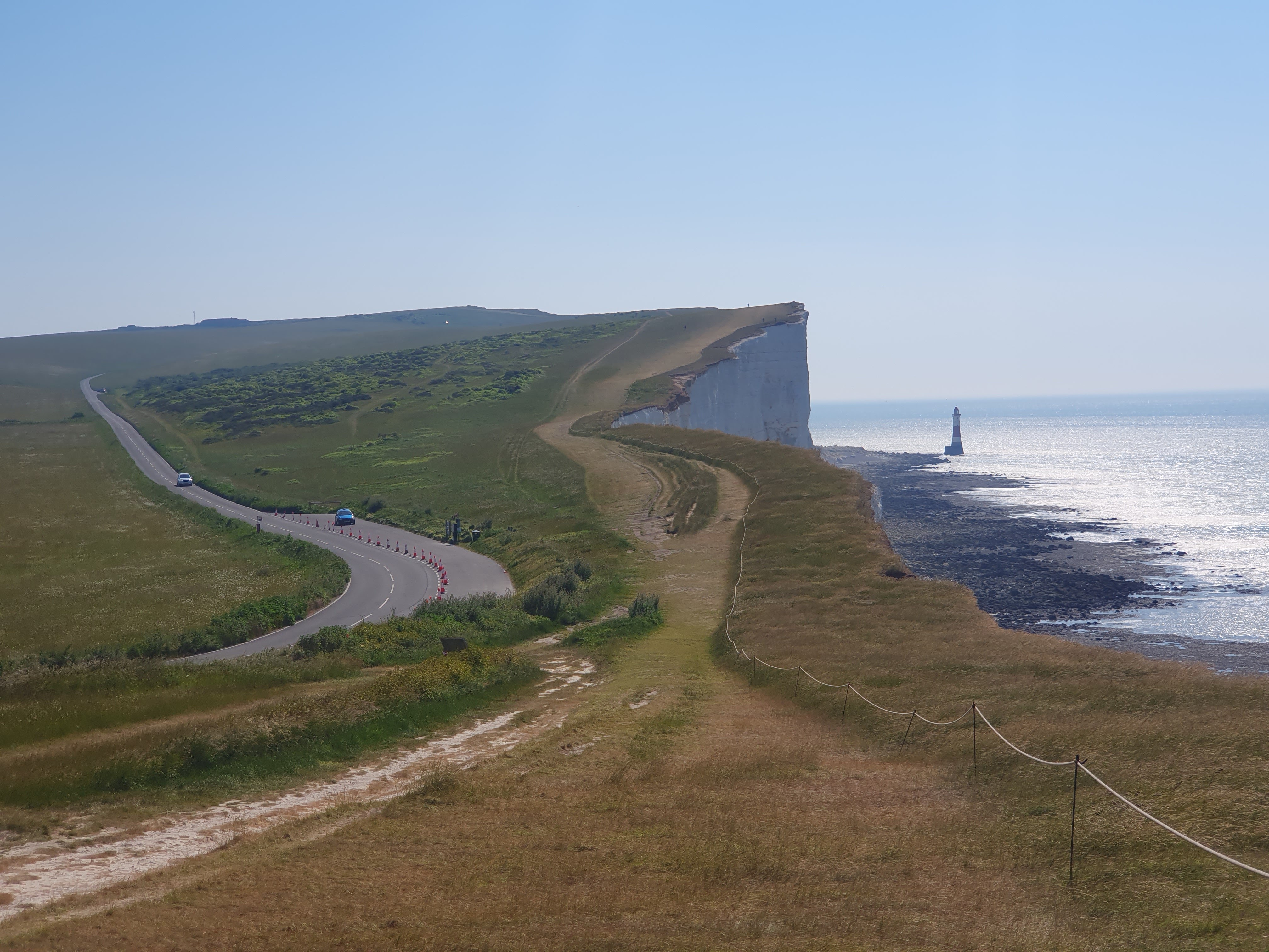 A footpath follows the Cuckmere all the way to the sea but I’m pushed in land and over three additional and unnecessary hills. This can’t be for the benefit of those on wheels. I’ve gone up to flights of stairs. Sweat is already pouring down my face and we’ve not yet reached 8am. There’s some delightful GCSE geography to be enjoyed at Cuckmere Haven where the rivet whips out Horseshoe bends. I merge on to the English coast path. The first wind filled white sail drifts across the bay. The Seven Sisters are cause for concern. Similar, though not as steep as Lulworth. I roll across them with reasonable ease in the end. Slumping in to Birling Gap at what I think is bang on 10am. That feels slow but I’m happy with it. I’m then incensed to find the National Trust cafe closed. It’s only when I vent to someone nearby that they inform me it is in fact 9am. My phone thinks I’m in France. A bigger threat to our borders than anyone popping across the channel on a dinghy as far as I’m concerned. We both agree what time it is actually doesn’t matter, on a day like today the National Trust are already losing money by not being open. I could wait here 40 mins, or I could crunch on to Beachy Head. No contest. Sunscreen on, water in. Away we go. The white coastal cliffs are dramatic. The suggestion obvious, this wasn’t always the end. Beachy Head lighthouse is one of those 1000 photos a minute views. Even though I know the light is wrong. It is a serenely beautiful place to come to die. Not counting the hoards of people.