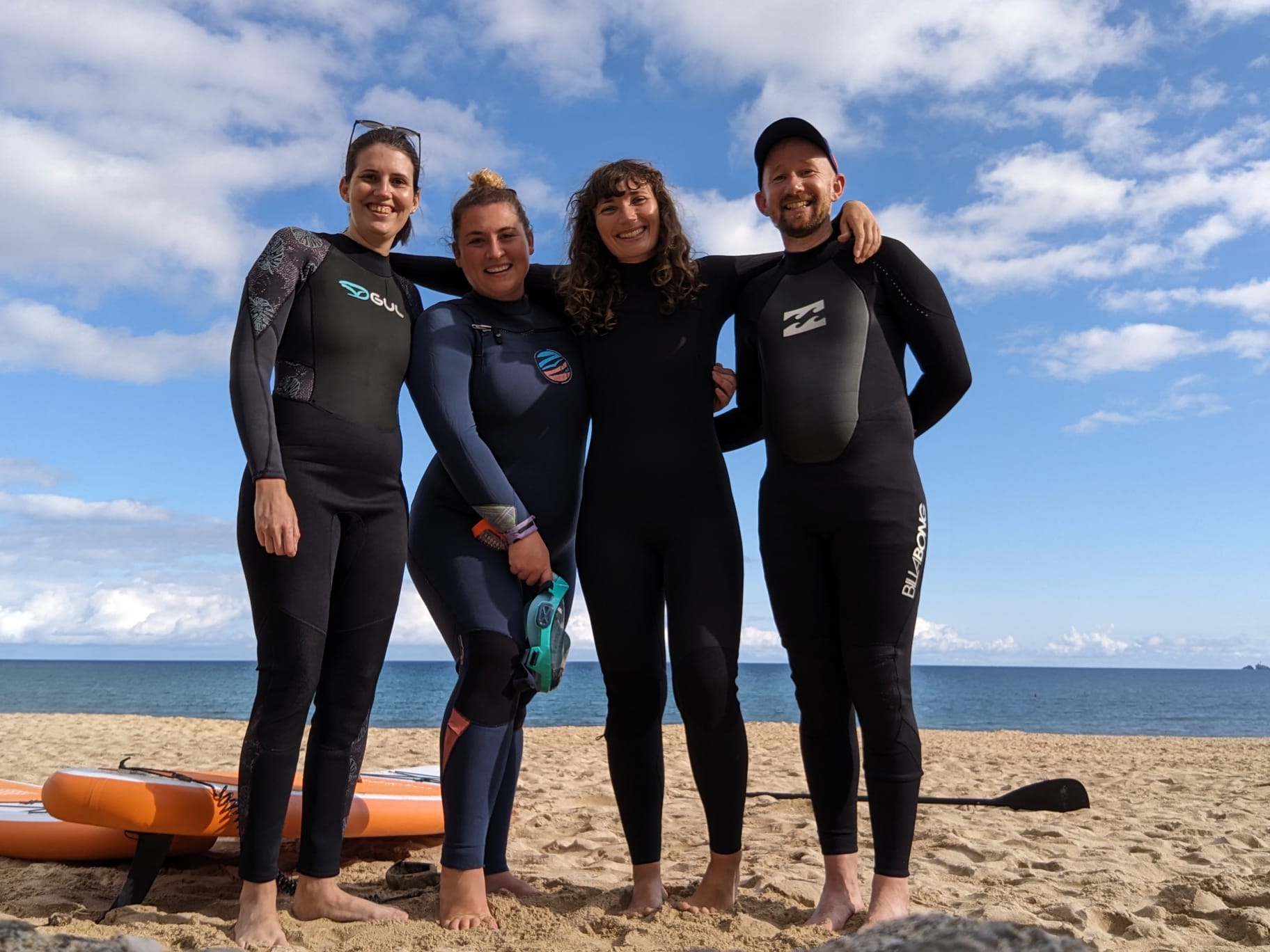 I head out for an early run across the estuary, around the headland and on to the dunes. The smell of salt in the morning air. Past lives collide in St Ives Bay. I wonder where those even older photographs are, from a time before Katie and Nancy. A time now I hardly remember. I head over to Katie’s after the school run. Nancy and I squeeze in to borrowed wetsuits. We load weird shaped suitcases in to the van and head over to pick up her friend Siobhan. Then it’s down to Carbis Bay beach. The sand is white. The sky is blue. Already I’m counting my blessings. Katie gets me inflating a paddle board. Nancy goes in the sea for the first time I’ve known her. Katie and Siobhan are in the sea maybe all of the time. There’s a pang of jealousy. Oh to live here. We carry the paddle boards down to the ankle high waves and push out. On my knees things are fine. Every time I try to stand up I lose my balance and fall straight in. Nancy shouts there’s a seal. It doesn’t take long to see where. A bullet of black beneath the surface. Is it coming straight at us? Why is it coming straight at us? A seal, they assure me. It pops its sea-doggo head above the surface and I feel slightly less on edge. We move out of the wind, closer to the cliffs. I manage to get on my feet and stay there. Once is enough and enough is enough, we head back to the sand and seek out a coffee. We drift along the coast a short way. Through St Ives, bunting clappping in the wind. Nearly dead German tourists crawl through the streets. I don’t think I want to come here again if it isn’t winter. There are always too many people, everywhere. We make for the bar on Porthmeor Beach. The rain starts and the bar staff begin unfolding the canopy, which does a wonderful job of dumping a load of water on a woman sat on one of the benches. She doesn’t complain too much and still gets two fresh drinks. I sit and watch the surfers catching waves. One day I tell myself, being in or on the water will be a daily choice.