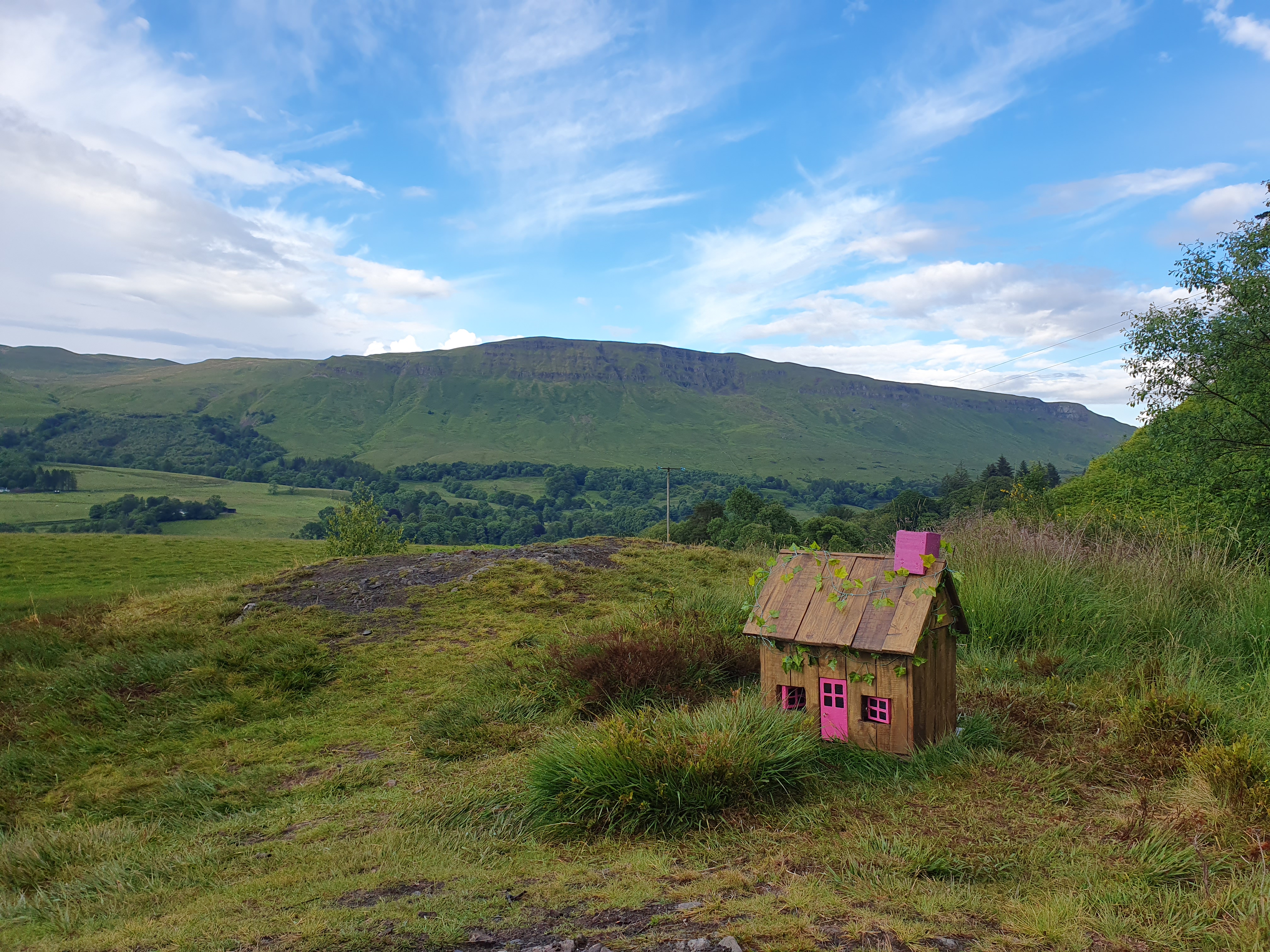 Scotlands hills rise as desolate, sheep-sick wastes. They are big though, by my recent standards at least. The trail begins in Milngavie, clearly marked by a sign post, an obelisk, a series of benches, and an archway, through which I’m immediately dumped in a car park. There are other hikers here, little groups, speaking possibly German, wearing jeans. I don’t stop to engage. I head on and out towards Mugdock Country Park. I hear the rain arrive in the canopy of trees. I haven’t taken my waterproofs off since this morning and I’m rewarded. The storm washes through. I pass a few people who stop to wrap up, they pass me right back. Through Carbeth there are signs advising of the hutting community, and there are a handful of presumably hand built cabins that look rather inviting in this weather. Though they’re all privately owned and not for the use of trail walkers. Certainly not this early anyway. The stupid grin lands on my face when I draw up on the Campsie Hills, the first of many ranges. I hold on to the smile for a while as I don’t have to climb any yet. Someone has erected a tiny cottage, with a little pink door and matching window frames. I wonder if it’s home perhaps for the nesting and aggressive haggis I’m cautioned about later. I drop down on the easy walking of the abandoned railway and I think of Quentin, describing the Pacific Crest Trail as a pack animal track. You could take a shopping trolley down the first 10km of the West Highland Way. I’ve gone beyond my planned stop for the night which could be a problem. A classic act of wildly underestimating myself. Stick to the plan, throw the plan in the bin. The Glengoyne distillery is just off the trail ahead, but it’s closed when I get there. When I get to the Beech Tree at Dumgoyne, they’ve just closed. The short lived dream of hot chips snatched away. Now I need to find somewhere to camp.