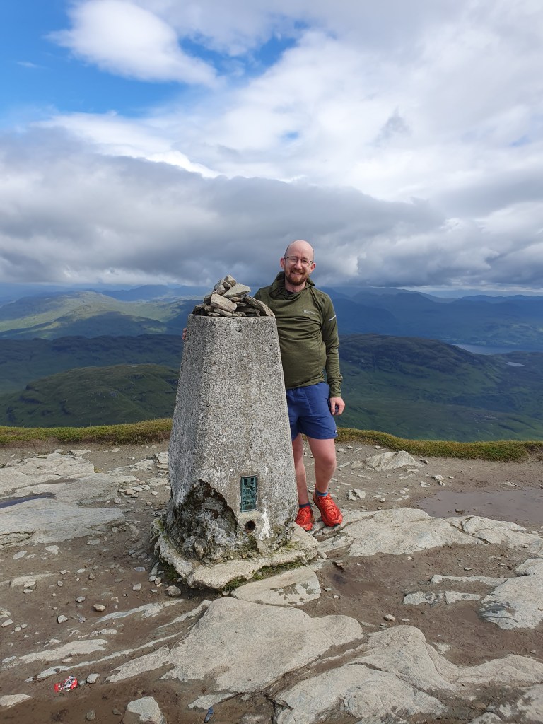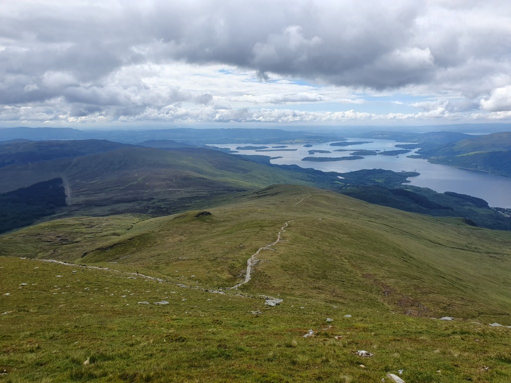 In the morning I find the weather is in my favour for an ascent of Ben Lomond. I pull all my clothes on to offer protection from the midges. I get everything done at quickly as possible; awful instant coffee, oats eaten on the move. I retrace my steps towards Rowadennan, mind flicking across decisions. I’m going up, but which way? The main route is likely to be easier, a more gentle ascent, but that would make the Ptarmigan path a more challenging descent. If I go the other way, I can finish at the tap and toilets. But first, I go to the tap and toilets so that I’m prepared. So I’m back to the tap and toilets to begin, filling and emptying. I take a minute to assess the state of my legs. Red flares on red flares. There’s something hanging out of one. I pull out my tick picker and remove the bastard. I’m beginning to recognise the advice to do the West Highland Way in trousers needs no salt. I’m rewarded for my morning faff by a pair of red squirrels flying through the canopy along the road’s edge as I head to the start of the Ptarmigan track. This is one of those miraculous experiences. Smaller than greys, seemingly more nimble too, I can’t quite believe that I have seen red squirrels in the wild. The initial climb is all grunt work. Up, up, up. As I begin to ease off on a contour I notice wet bootprints on the rock. I am not breaking trail today. A mole scurries through the overgrown trail edge. There’s another push up on to Ptarmigan, from there the ridge is a cruise, paved with boulders as it is. The last climb is intense, choose your own adventure scramble. I pass through a narrow crack, some old god’s throne room, and then I’m hauling myself up. I swap photo duties with a couple at the summit and then sit down for a minute midge free. The sky is clear, still and the peak is quiet, which feels like a rare combination in Scotland.