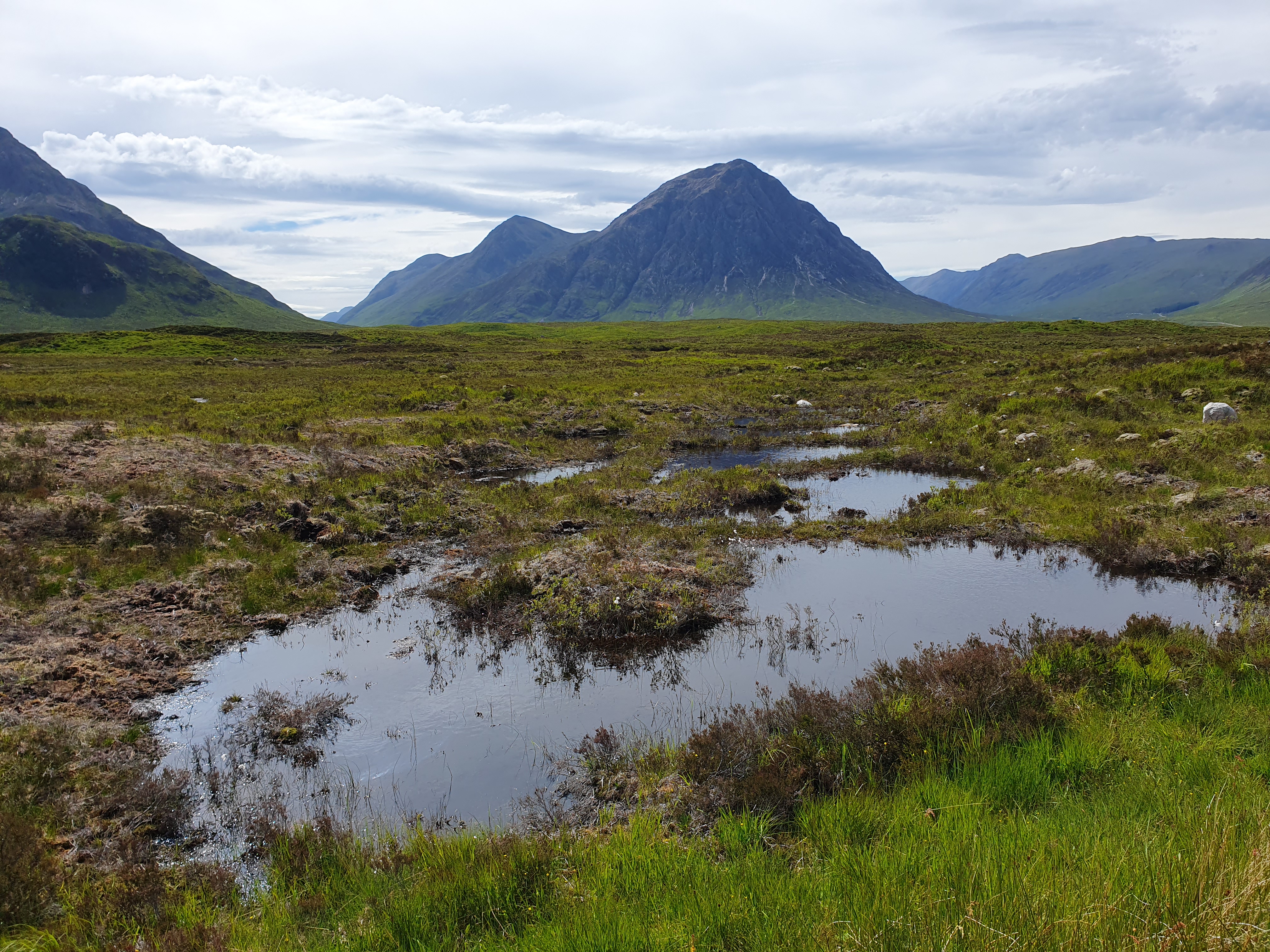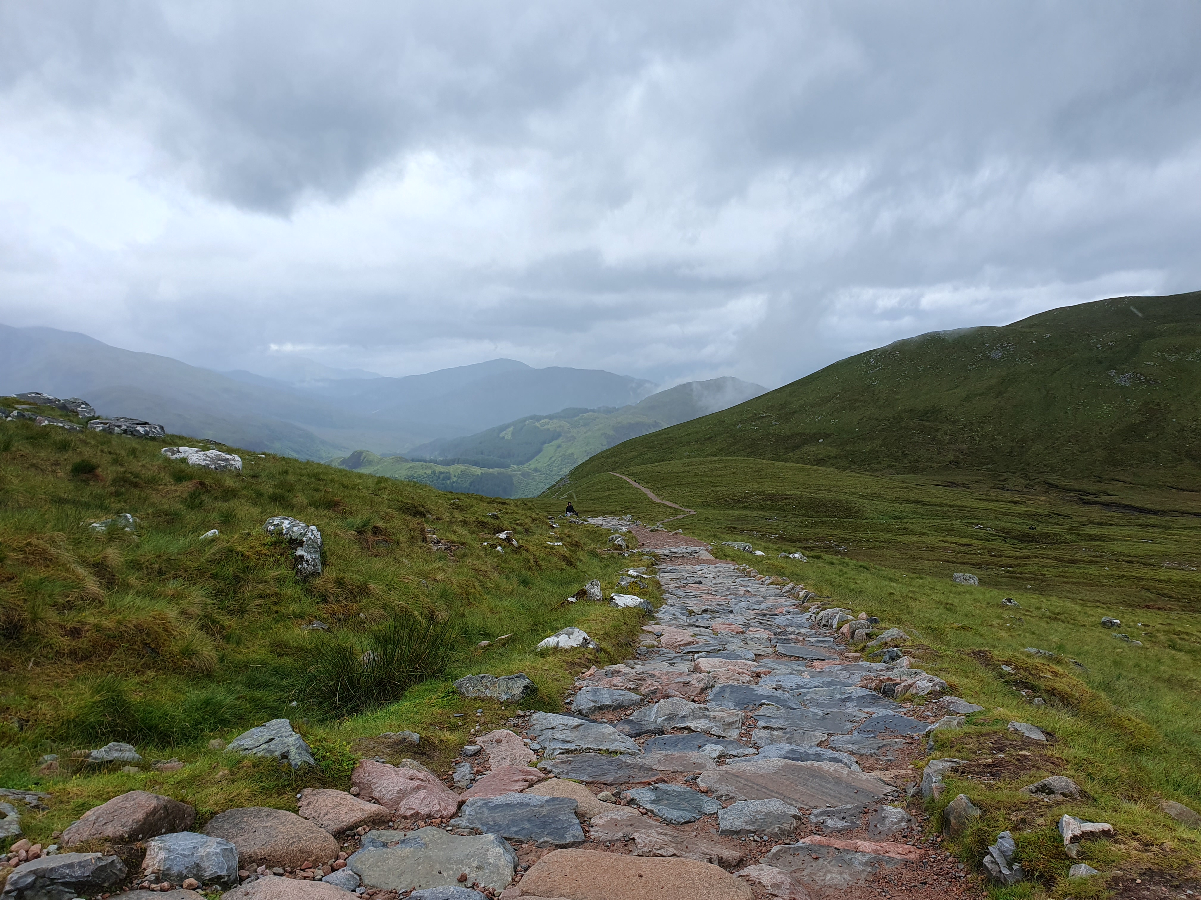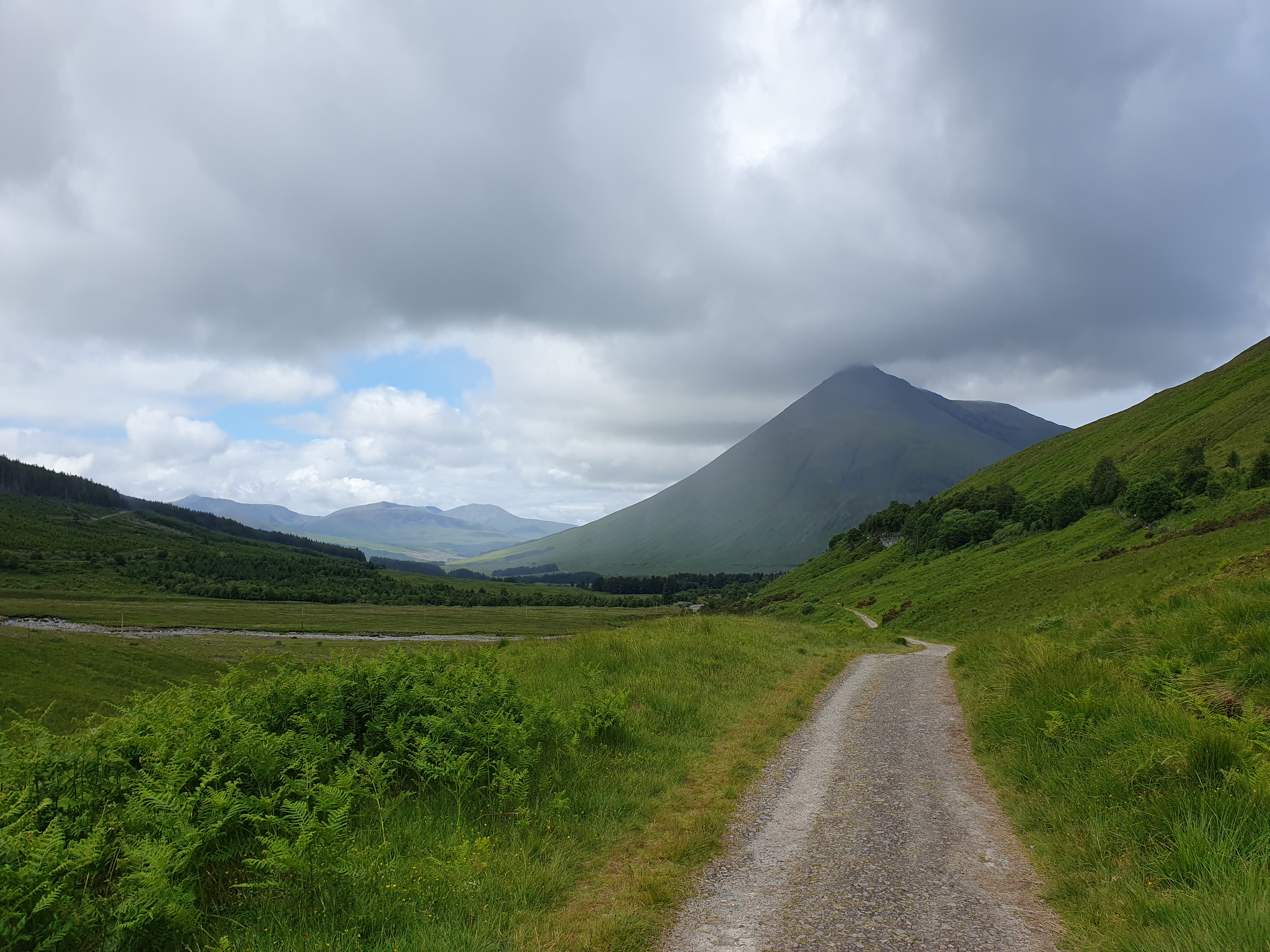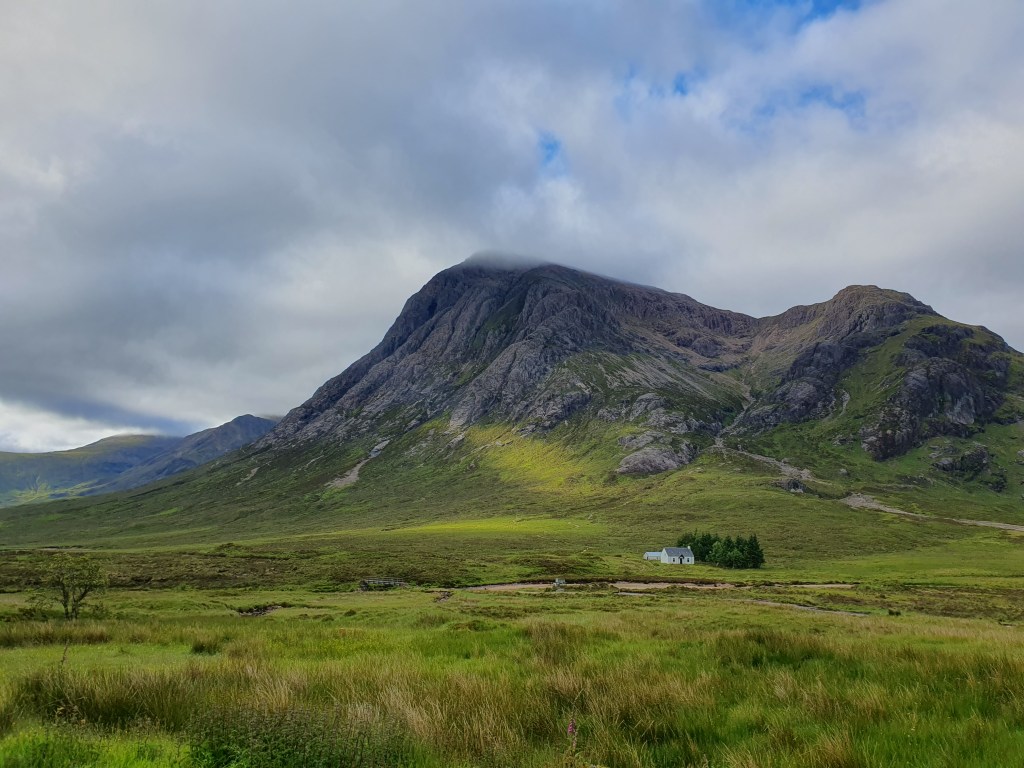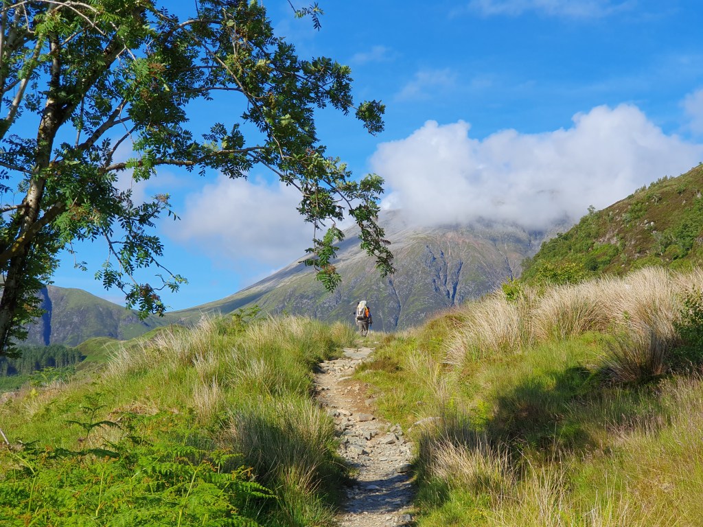 The dance party over the road goes on until 2am. I’m not sure my earplugs are making a difference until I take them out. I have to check the final score, only to imagine what would be happening if Scotland had won. Clouds smoke over the mountains. Rain showers erase the view. Patches of sunlight offer hope. I’m moving early, a bit of discomfort in the knee again but it seems to pass. I take one hundred photos of Stob Dearg from slightly different angles. Then I’m at the foot of the Devil’s Staircase, which is a bit of misnomer. There are no devils or stairs. Just a zigzag path over a saddle. At the top three wee bonnie lasses stop to ask me to take their picture, and then ask for directions which strikes me as concerning. Then, so do the position of their packs, the spare boots swinging off the back. The kit strapped to the outside. We all did this for the first time once. Two of them are wearing shorts though, the first other brave souls I’ve seen. Then a wiry gent comes over the top too, in shorts. Everyone marches onwards. I stop for a brew. A man takes a minute to give a detailed account of why this is called the Devil’s Staircase. People died here! It was someone’s job to collect the bodies in the summer. A tour group comes up next. The guide tells me the weather for tomorrow will be good for an attempt at Ben Nevis, which fills me with hope. His group try to chat to me but I’m keen to get ahead and away from their crowd. The jukebox in my head keeps playing Elbow’s Ground for Divorce, only the egg in a pint version. I’m alone enough to sing along out loud.