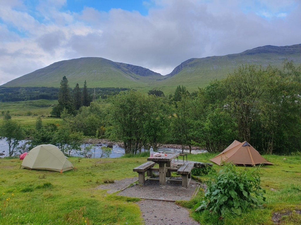 I join James at Glencoe Mountain Resort for lunch. I’d been tipped off this morning about a shower opportunity and pass on the news. The shower is super hot and high pressure, almost torture. I clean up, touch up my bites and squirm back in to sweaty clothes. Then I’m back on a picnic bench, watching the light shift across the craggy face of Stob Dearg. A real fist of a mountain, knuckles punching straight up. Chaffinches have outcompeted sparrows here and flock to the recently vacated tables. Bonnie and Ade, my friends from earlier, join me for a bitof very welcome company. I eventually roll into Kings House to find James again. We get the tents up, get the beers in and watch the football. Before the Scotland game kicks off a young girl comes through with her bagpipes. James claims to fall asleep to the sound. I think I’d be more likely to commit atrocities. We’re joined by SoBo-er Soren, who reveals early he’s doing a PhD in Philosophy, which only adds to the entertainment. Recognisable faces come in and give a nod. Even old mate Ben and his girlfriend from night one. I leave the pub knowing full well I’ve had too much to drink. The inside of my tent looks like an everything spice bagel, those tiny black bodies scattered everywhere. I crawl in to my sleeping bag and pray I sleep.