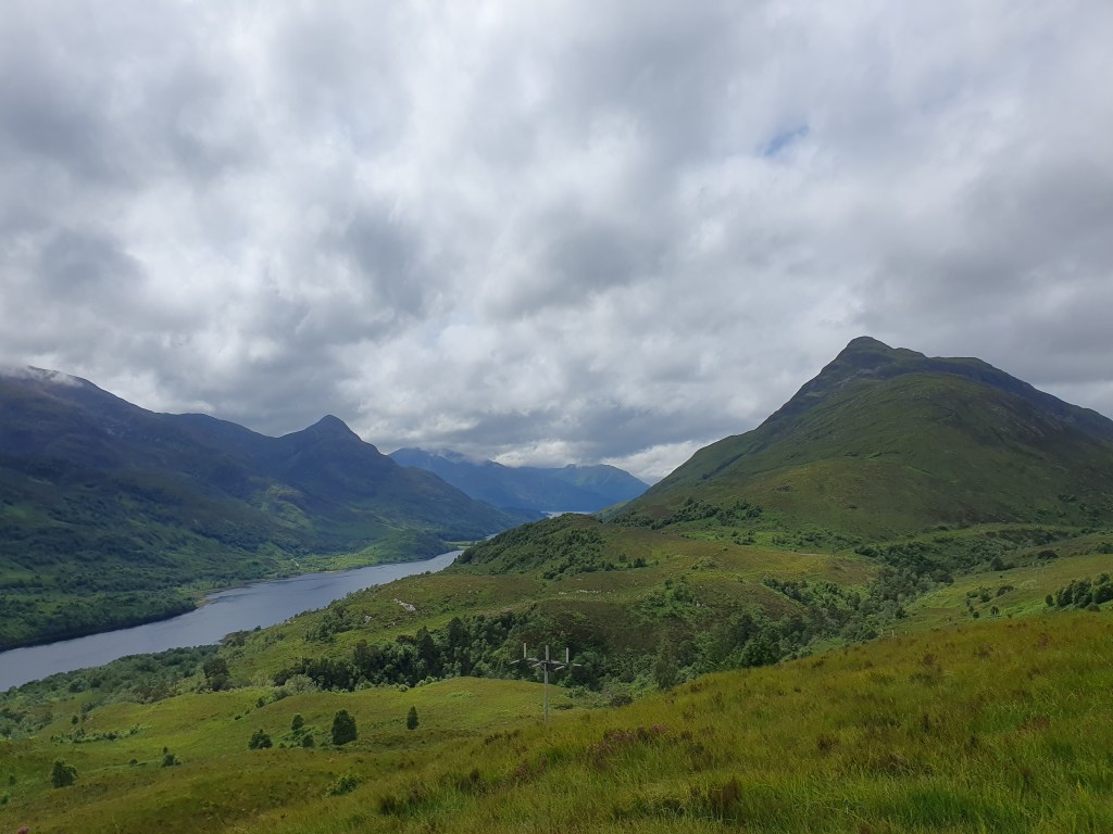 I follow the old dam road. As I close in on the next town, the hydro-pipes trailside are leaking, high pressure jets blasting into the sky, which feels extremely unsafe. The rusted piece of metal held in place with a fabric strap doesn’t make the situation any better. Kinlochleven is a quick pit stop and a catch up with the slow forming bubble of trail friends. I get a sandwich, a coffee, and a slab of rocky road. I’m surprised by the size of the town, tucked away in the hills. Middle of nowhere with no business being here. Not anymore anyway. They were pioneers of hydropower here, and the power station drew an aluminium smelter. The only industry now seems to be supporting the West Highland Way. I watch three baggage transfer vans come through and drop packs and suitcases at the doors of various pubs and guest houses. I take stock of where I am and where I’ve got to be. I tell myself it’s cruise control and a steady pace to Glen Nevis where I book myself on to the campsite for the next two nights. The climb out of Kinlochleven is a bastard, but the view is worth it. I’d even go as far as saying I can see the resemblance to the other Kinloch I know. Some crusty old man now tells me the weather for tomorrow will be crap. I’ll wait until tomorrow to find out for sure. I follow sheep and lamb along the winding strip of silver through the penultimate valley. They always take a long time to get off the trail. I enjoy the grind, the valley disappearing behind me, the weather shifting overhead. Full sun switches to rain and back again. James shares a coffee at a break. The caffeine hits me like a train, and I fly like one. I pass through another group of youngsters who are starting to look like they’ve overdone it. When Ben Nevis finally comes around, he looks good. Big. Proper mountain stuff. Summit wrapped in cloud, gently breaking. Today would have been a good day for it. The final descent in to Glen Nevis is a long slow slog on forestry road. When I get there I realise very quickly I’m back in civilisation. The campsite is vast and busy. The facilities are lacking. I’ve lost my trail friends. The man on reception tells me to get my tent up before the rain and I do.